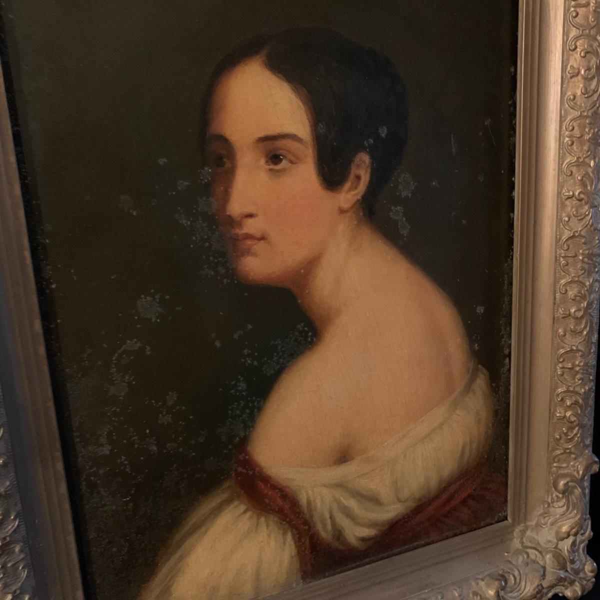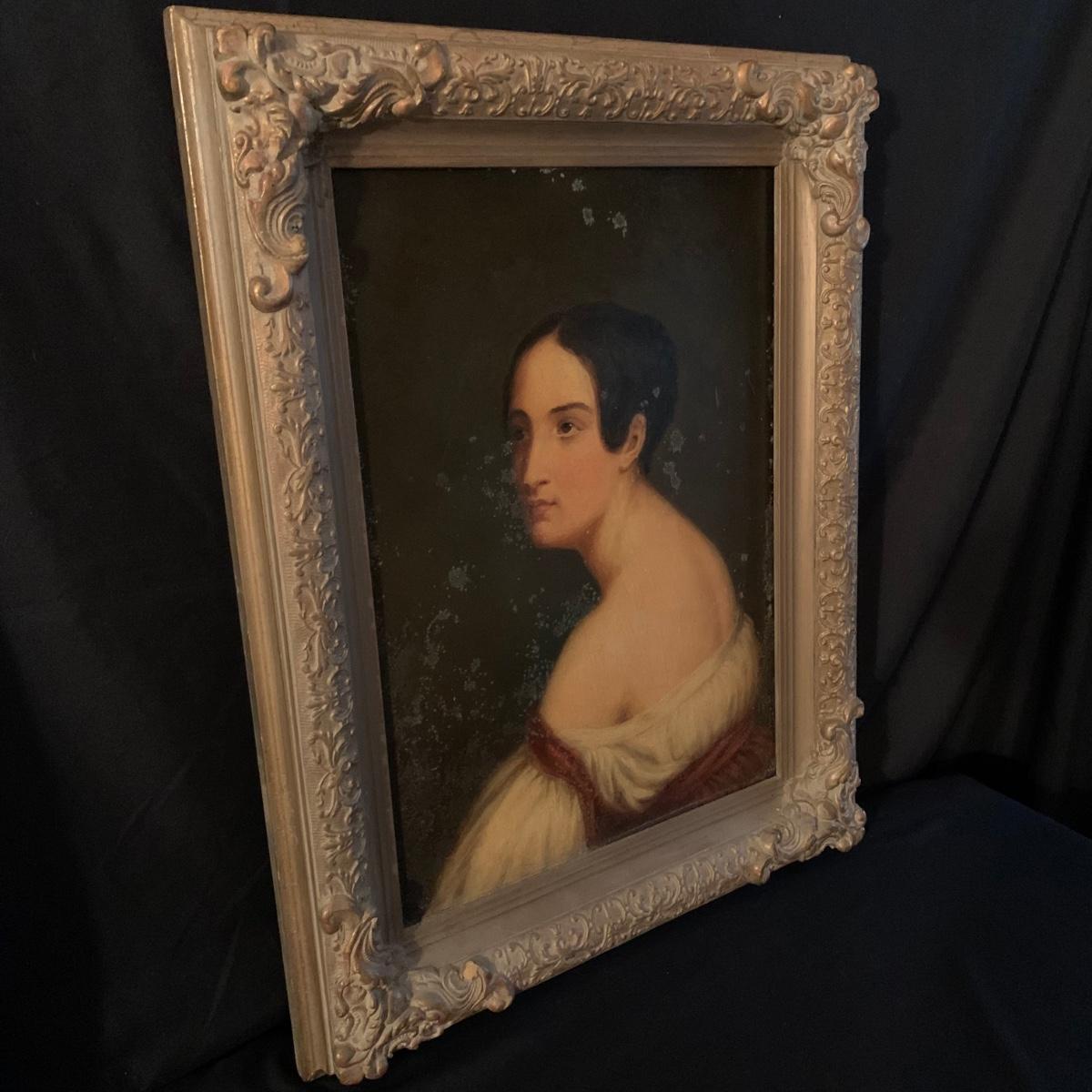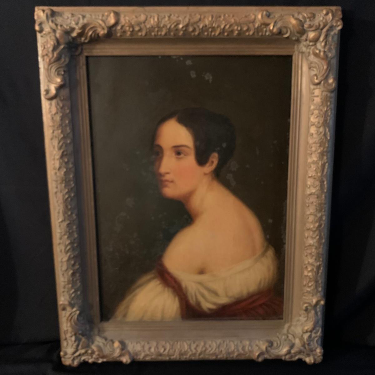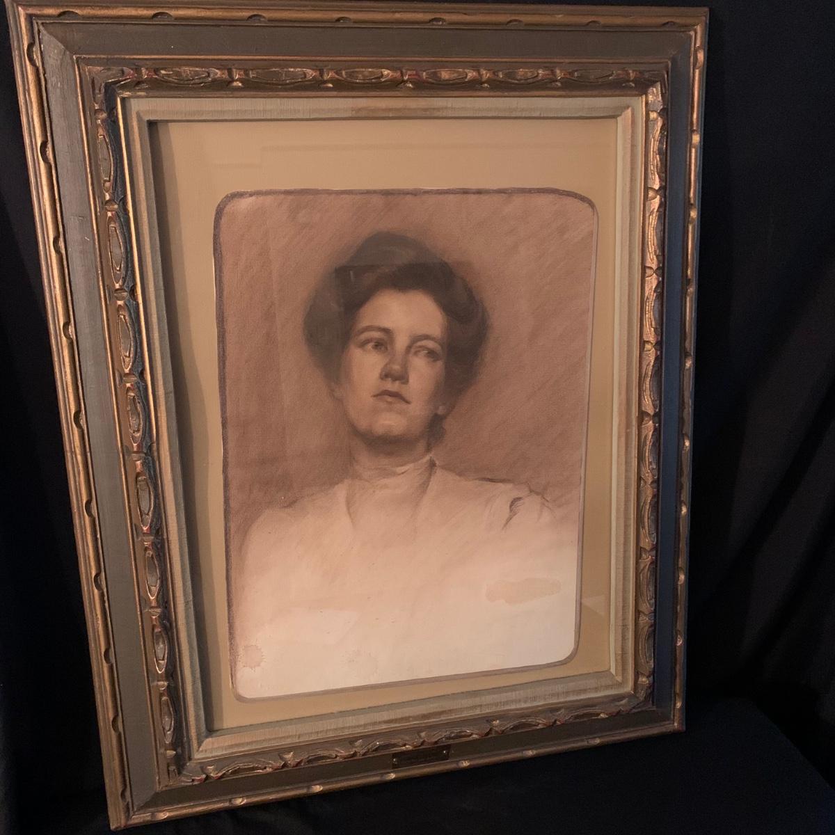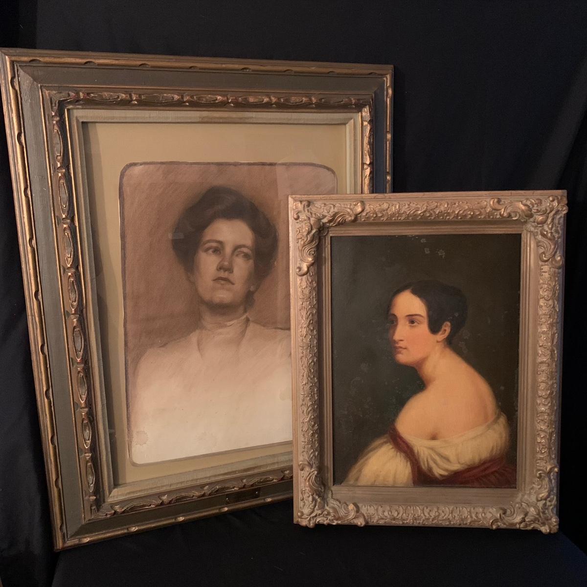 Framed ladies portraits. Includes framed charcoal portrait behind glass and framed painting of woman. Largest piece measures 26” x 31.5” and smaller piece measures 18.5” x 23.5”. Smaller painting has a few blemishes. Both have carved wooden frames. Please see photos for more details. Shipping available. Shipping can be costly. We suggest contacting our preferred local shipping provider, Postage Express, with dimensions and getting an estimate before bidding: (828) 670-5501 or postageexpress@yahoo.com.
