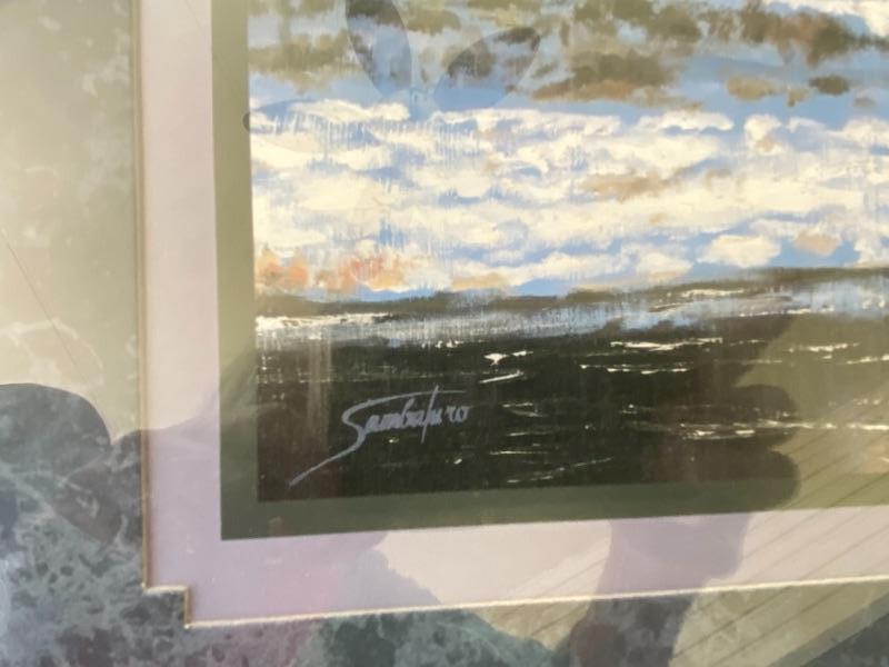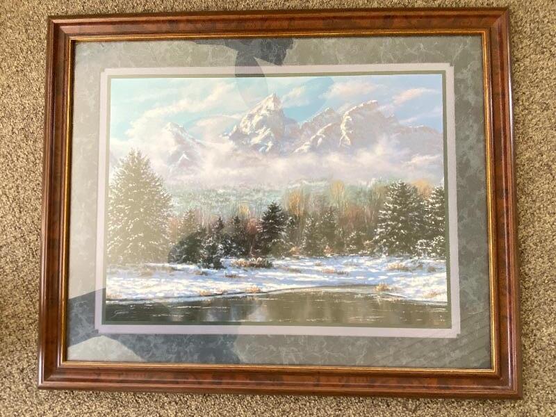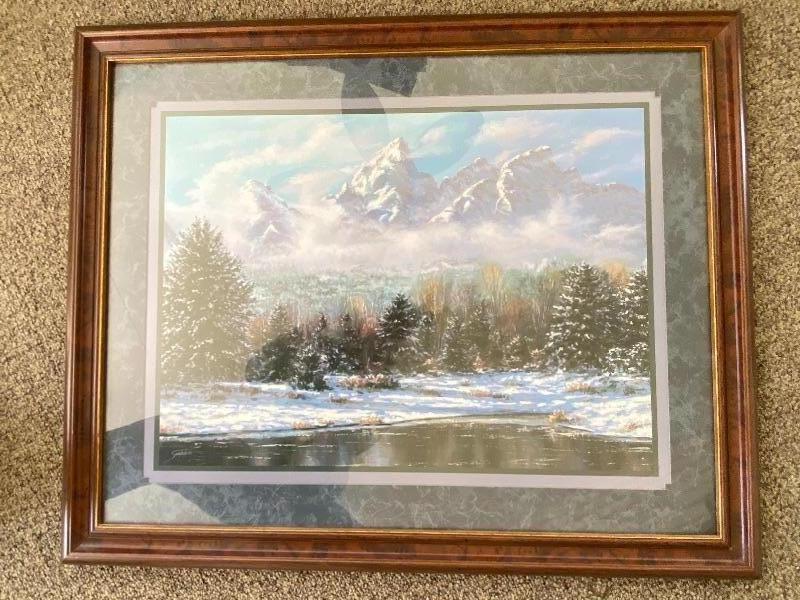 Framed Nighttime Landscape Print House Mountains Water Moon 37 x 41