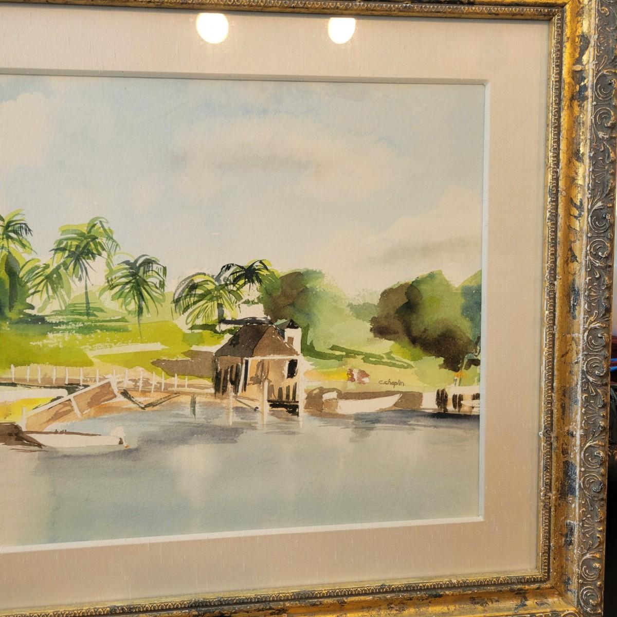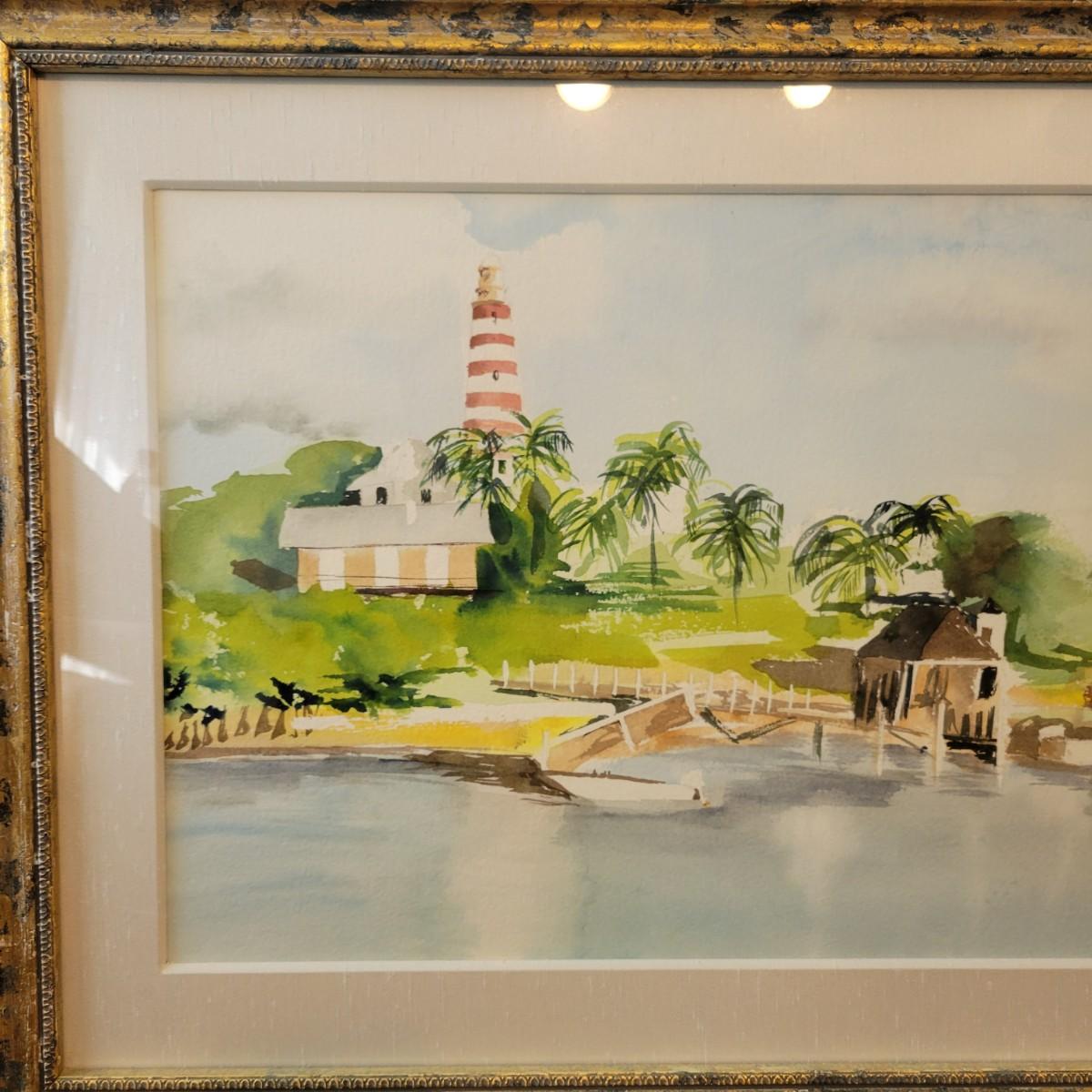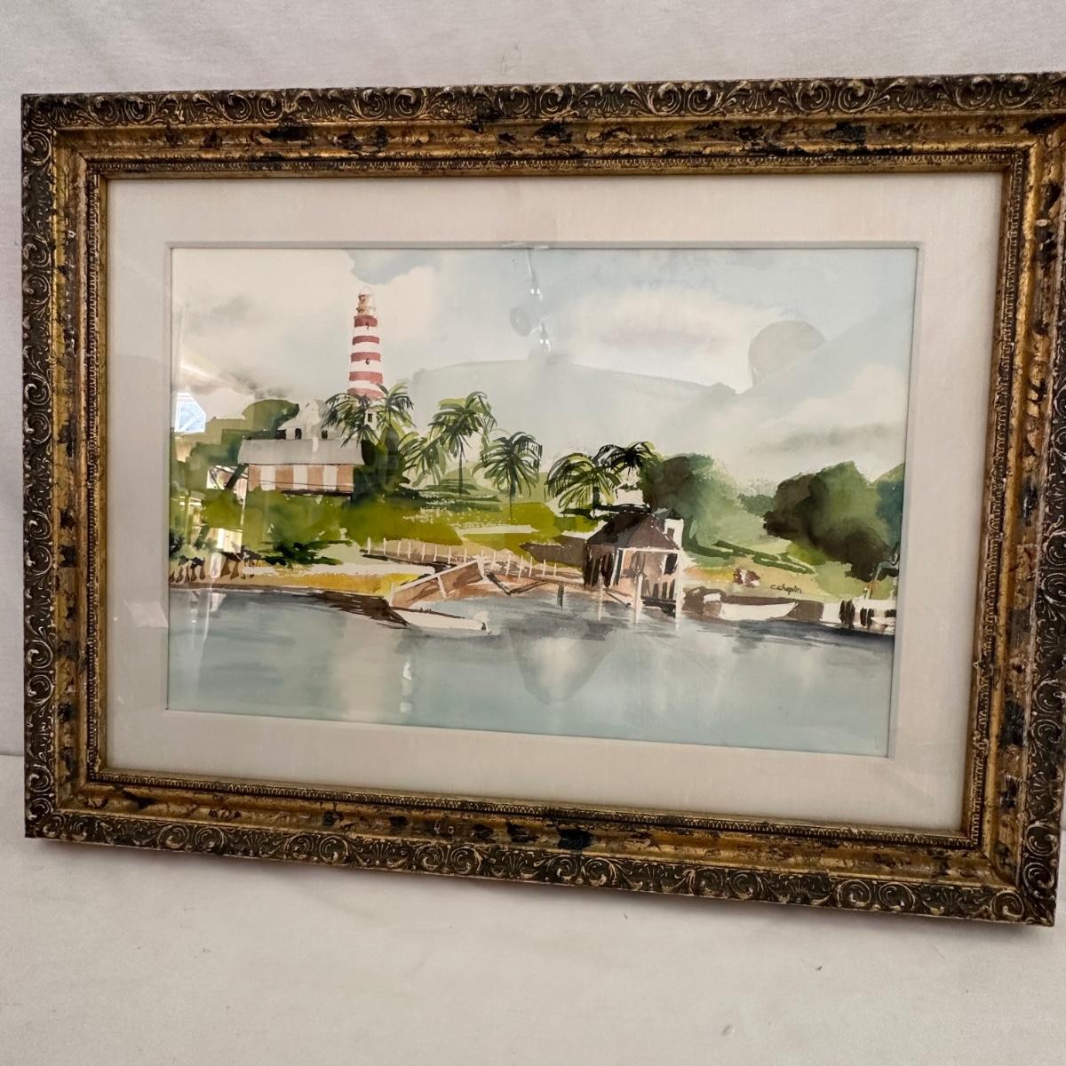 Framed Lighthouse Watercolor by C. Chaplin (M-DW)
