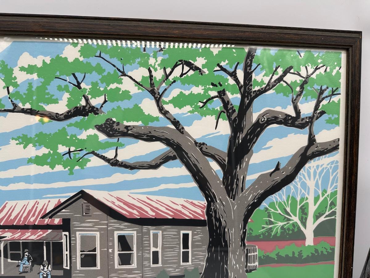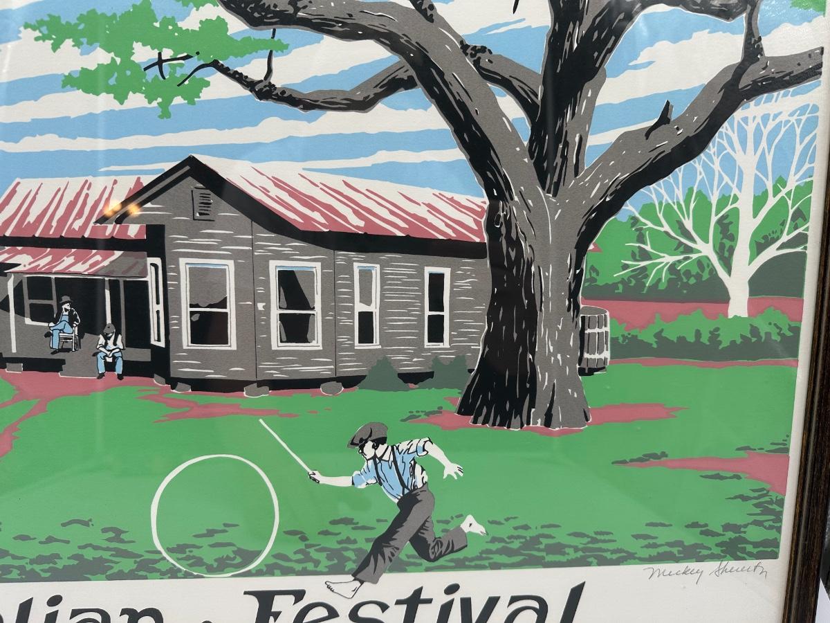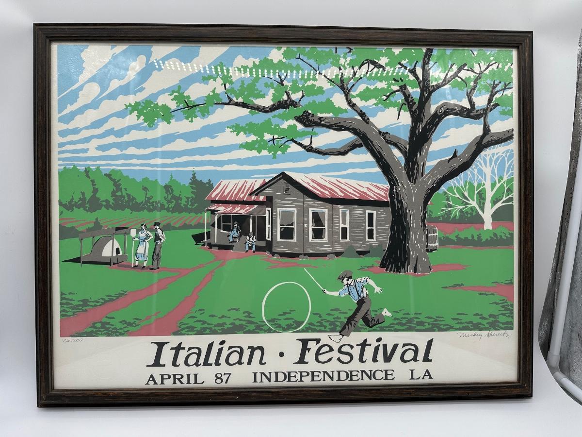 Colorful framed art print titled Italian Festival, commemorating the April 1987 festival in Independence, Louisiana. Signed by the artist (appears to read Mickey Sheuch), and hand-numbered 136/200, indicating a limited edition. Features a charming rural Louisiana scene with farmhouse, oak tree, and figures at play. Nicely presented in a wood frame. Great piece of local Louisiana folk/art history and festival memorabilia.