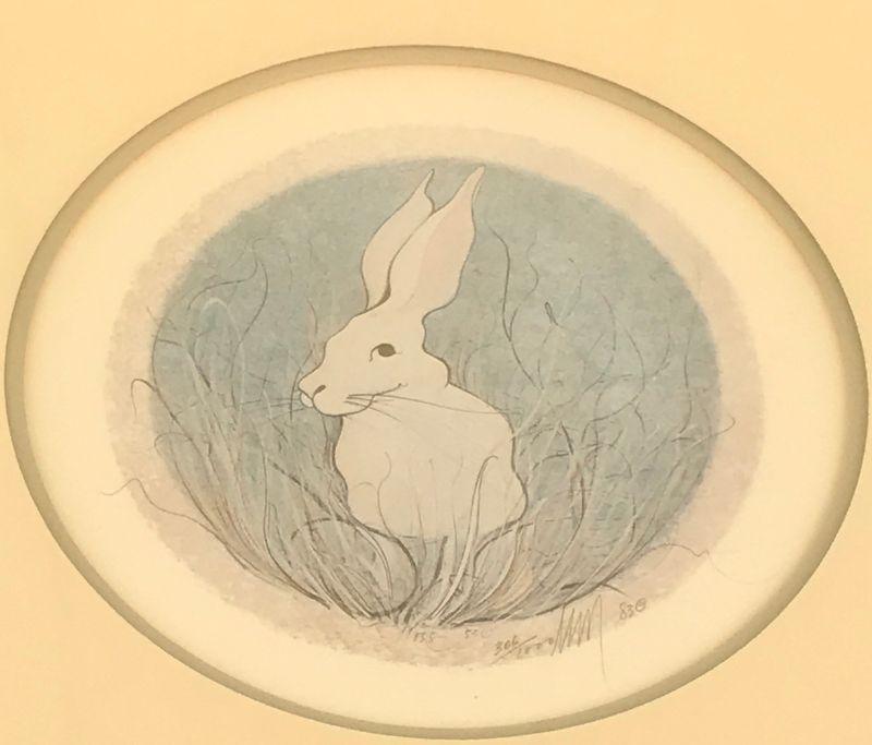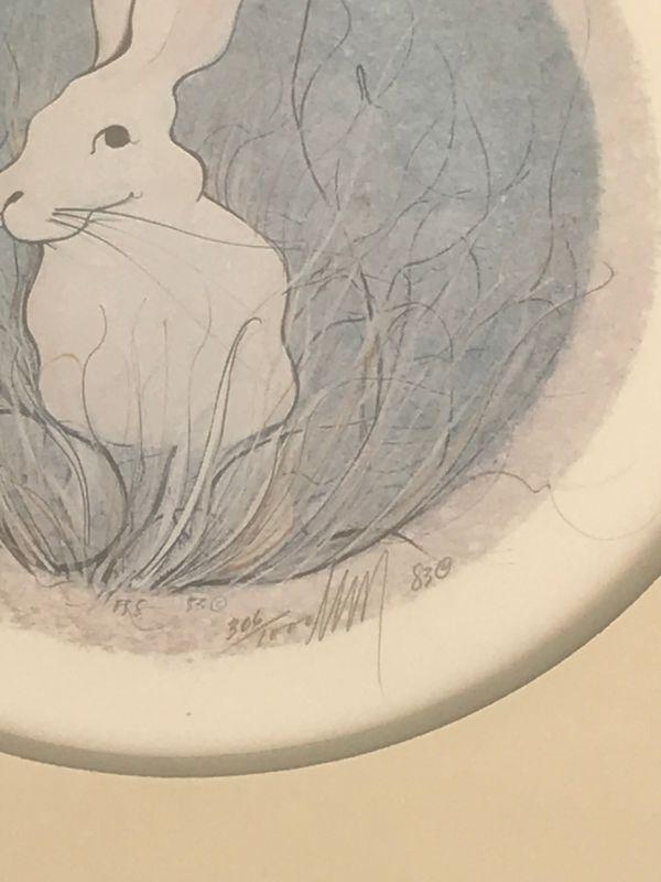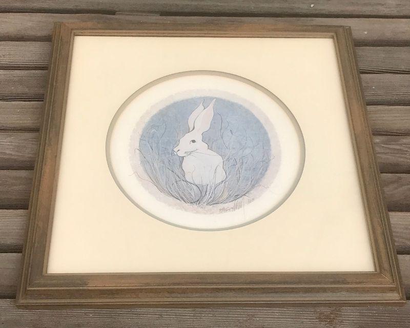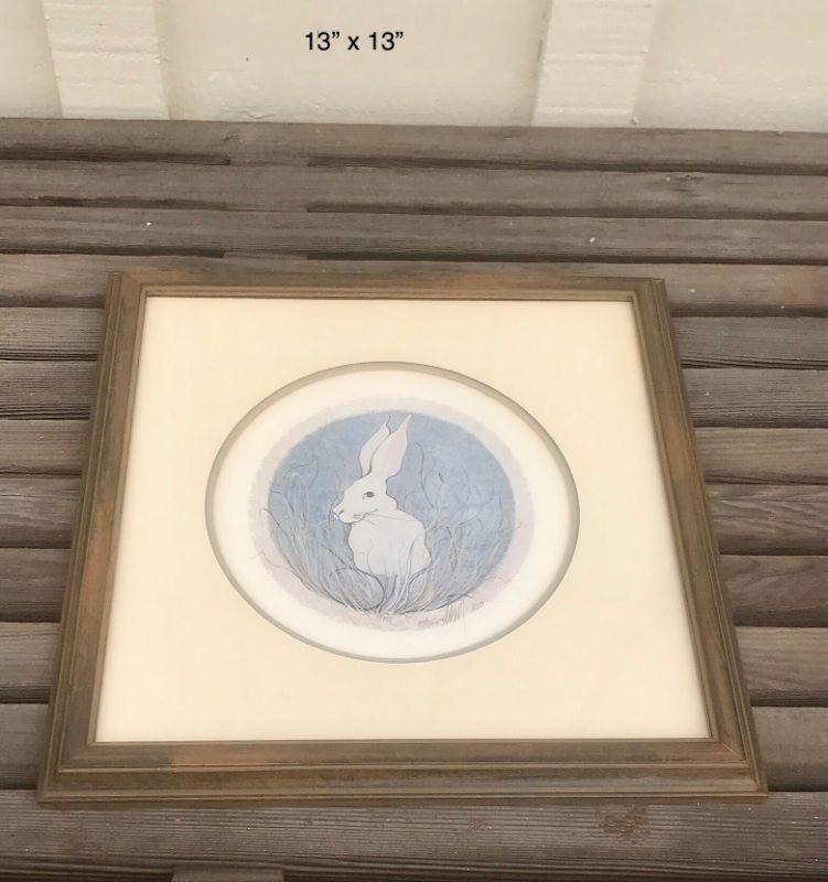 Framed Limited Edition Print 306/1000, 13 x 13 inches, White Bunny Rabbit, round image, square frame
