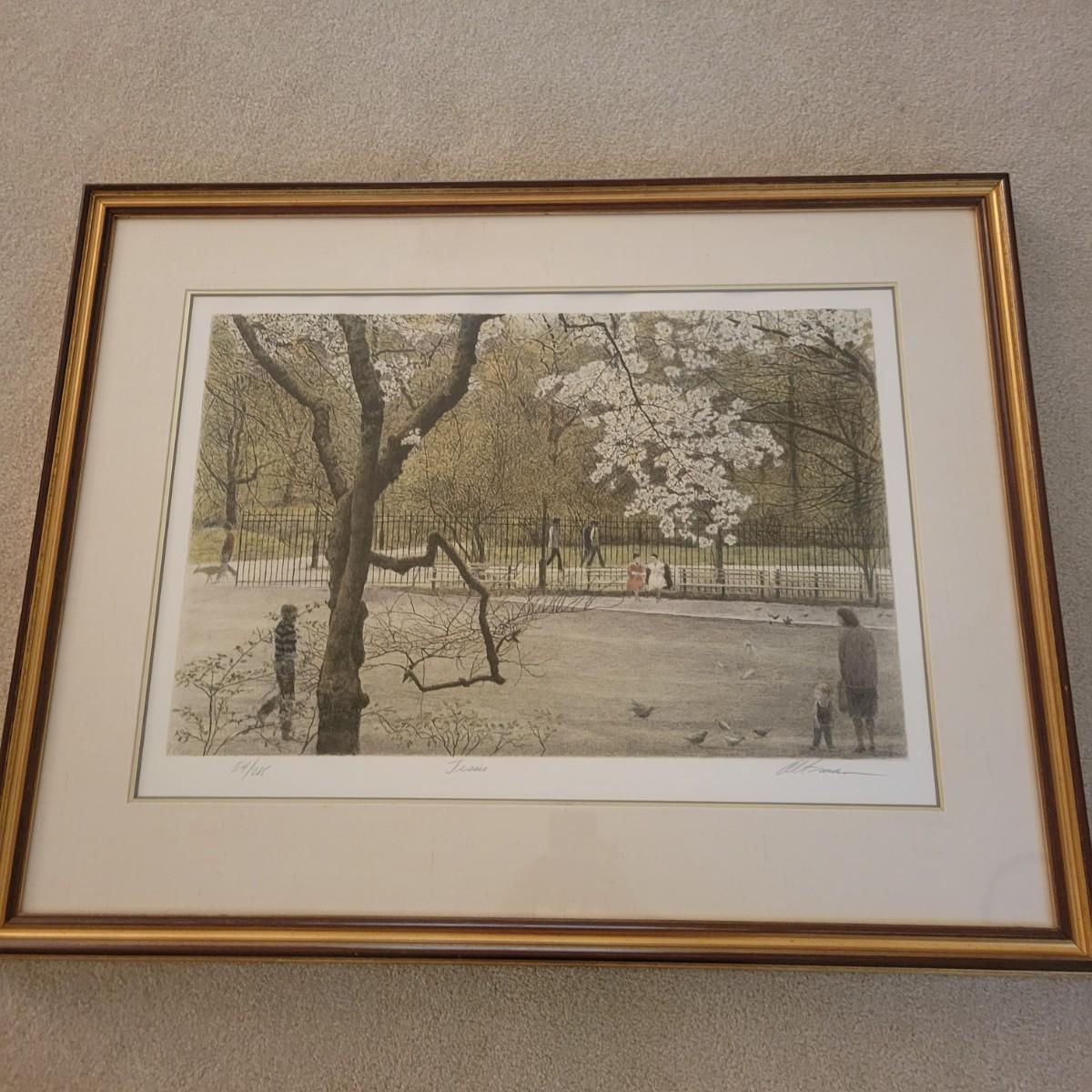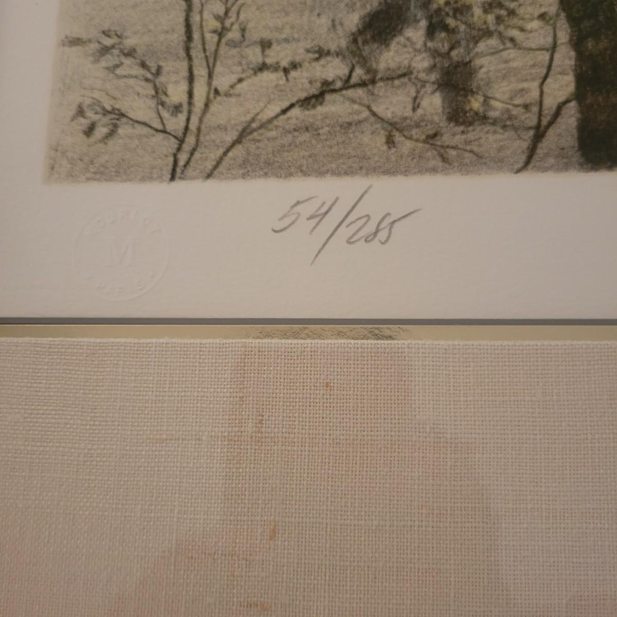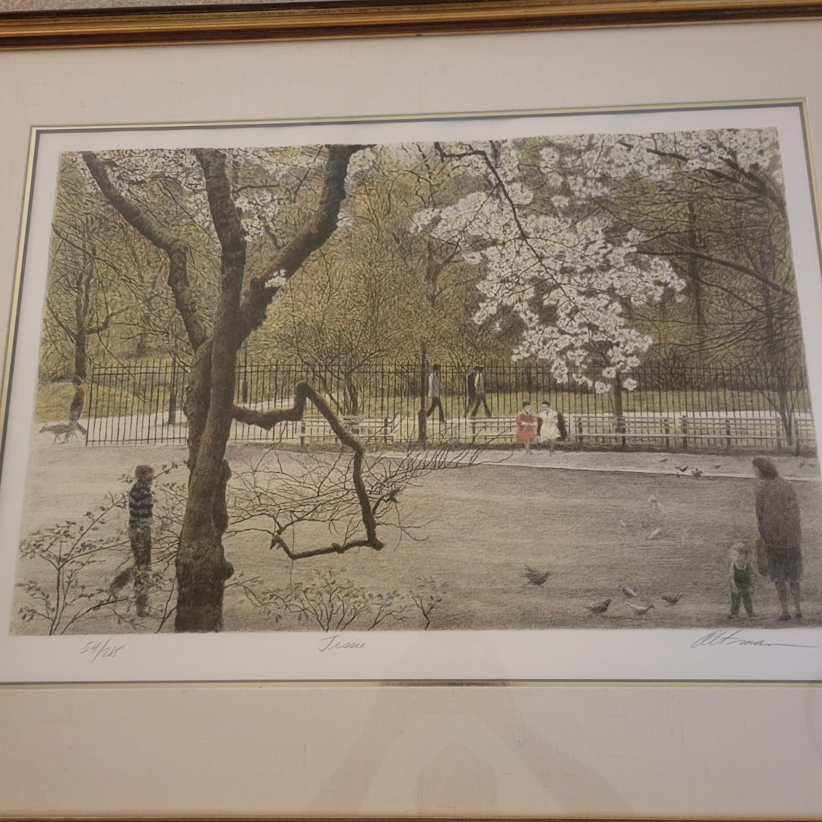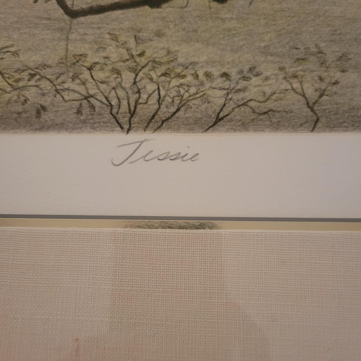 A signed and numbered lithograph by Harold Altman titled "Jessie". This piece has a solid wood frame with a distressed gold finish and is double matted. It measures approximately 36" x 2" x 28.5". Shipping available. Shipping art can be costly. We suggest contacting our preferred local shipping provider, Postage Express, with dimensions and getting an estimate before bidding: (828) 670-5501 or postageexpress@yahoo.com.