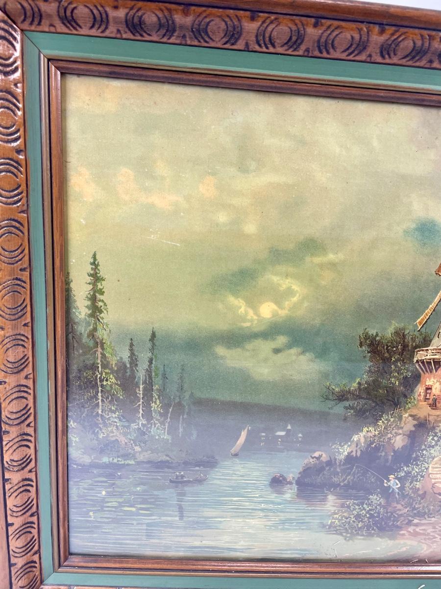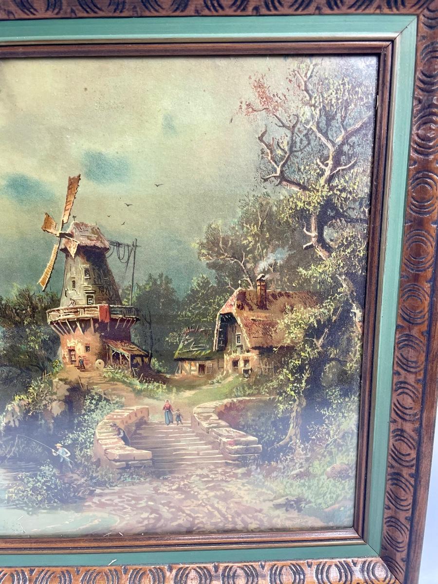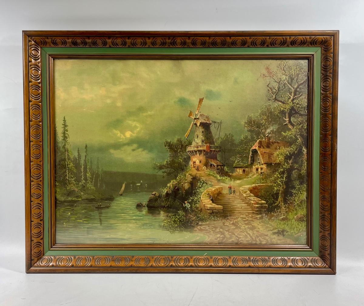 Mounted behind glass. Unable to read artist name. Looks to be a lithograph of an original oil painting. Landscape with Windmill, House, River and Pathway. Approx. framed size is 24" x 32".
