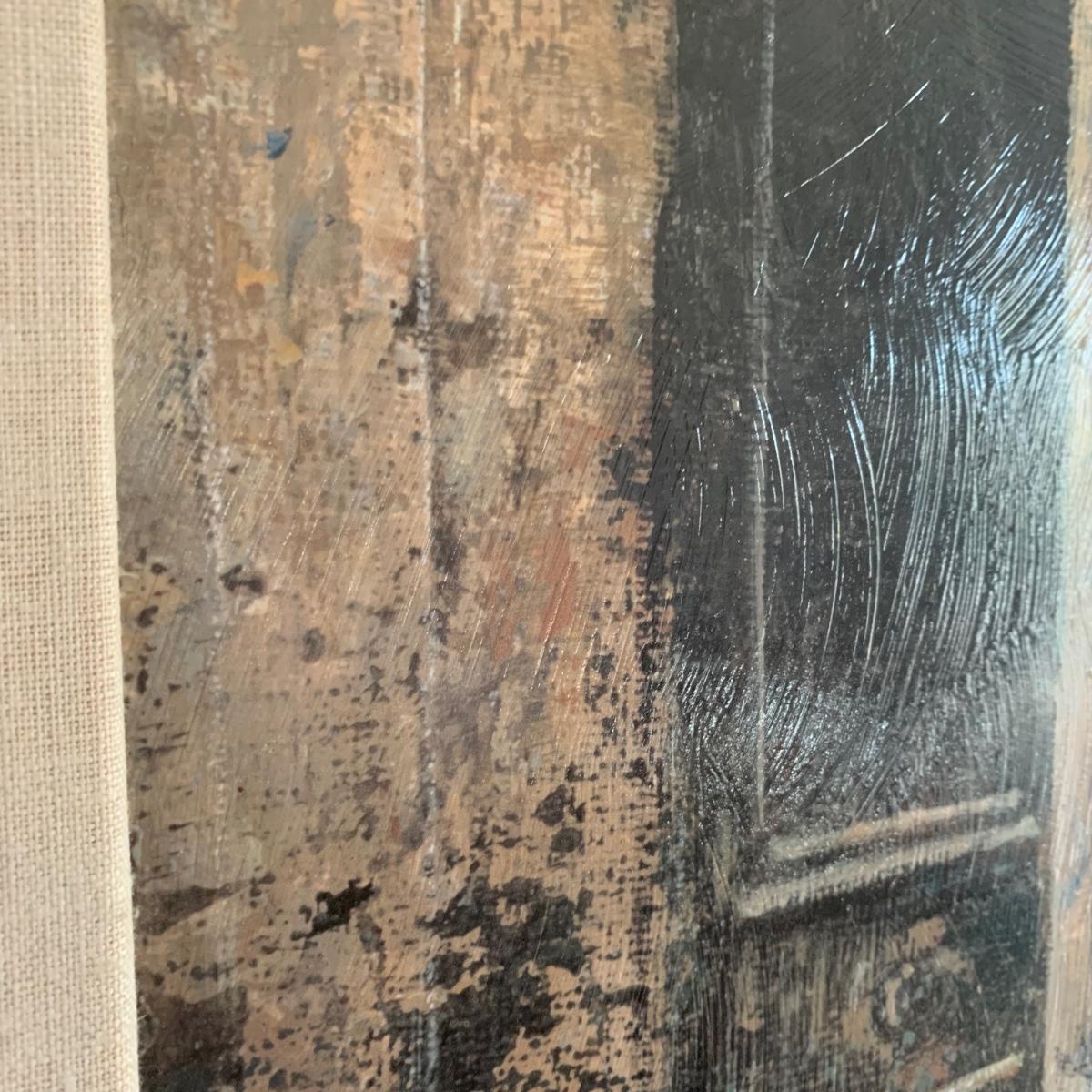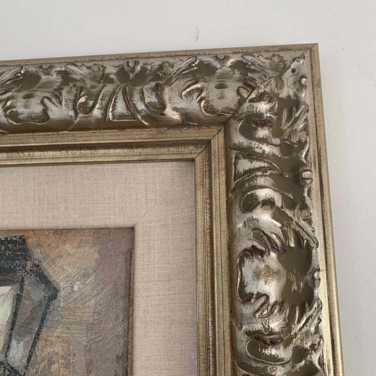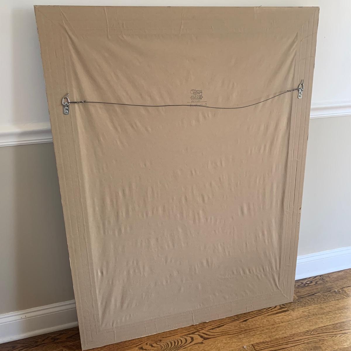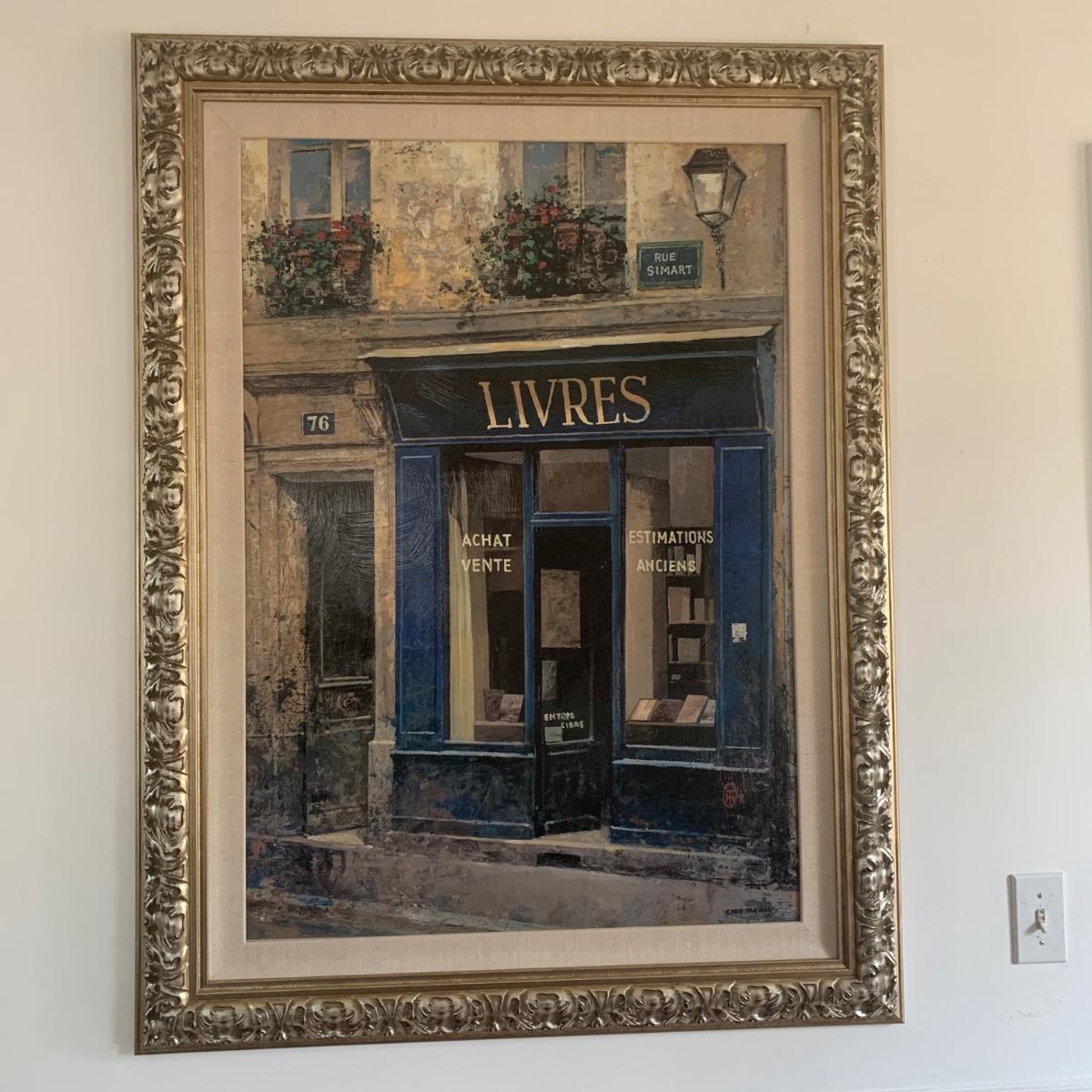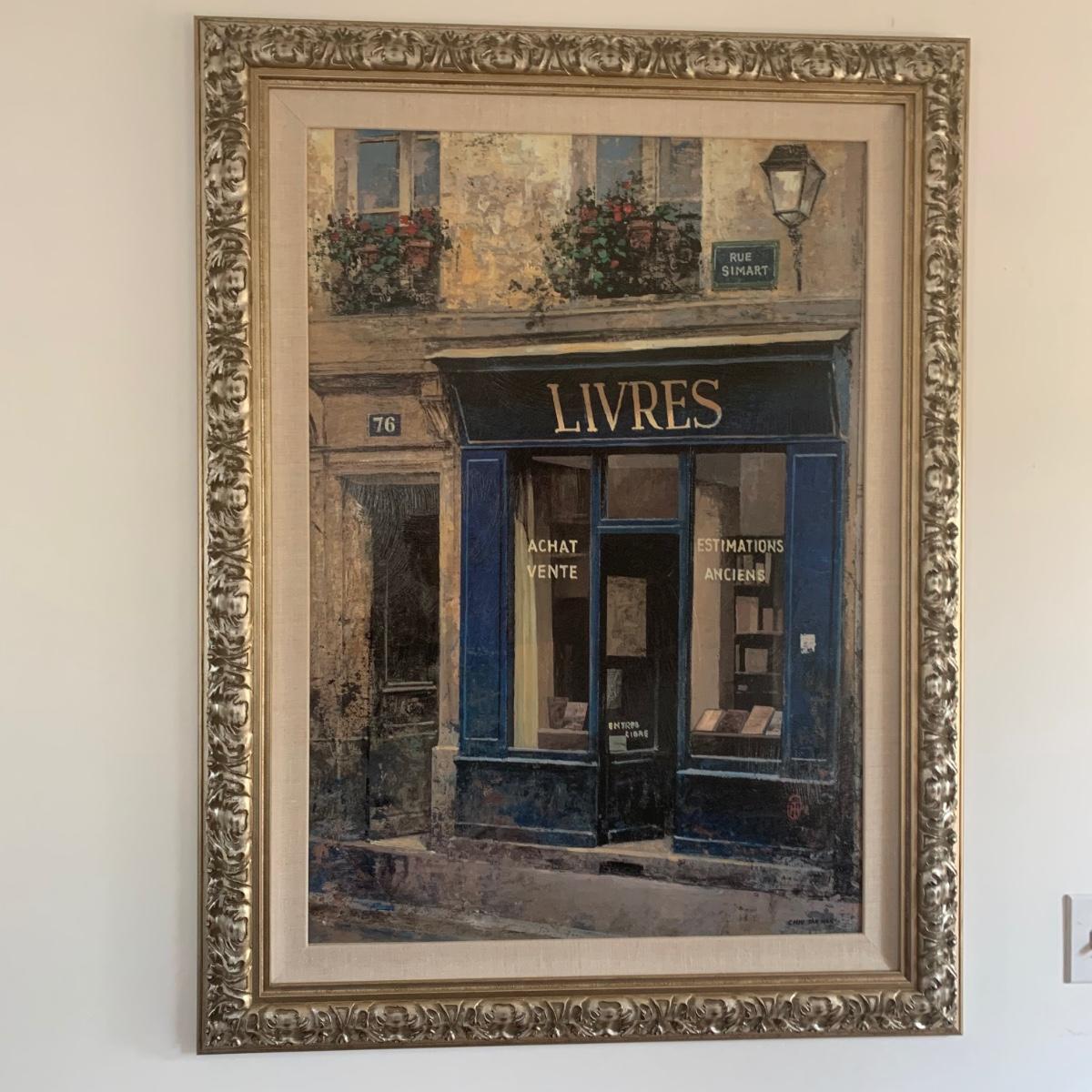 Framed Livres print. This is print is textured on board with linen liner, and framed in ornate white-gold style frame. Piece measures, 39.5” x 49.5”.
