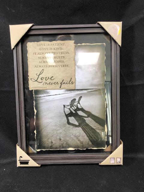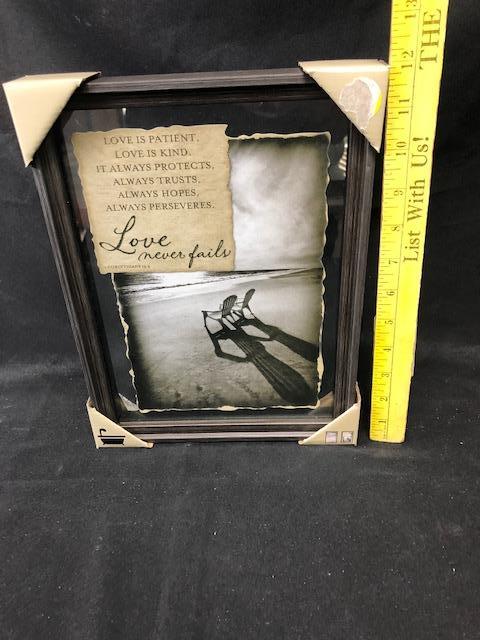 Framed Love never fails print. Never used, still has protective corner covers on it.