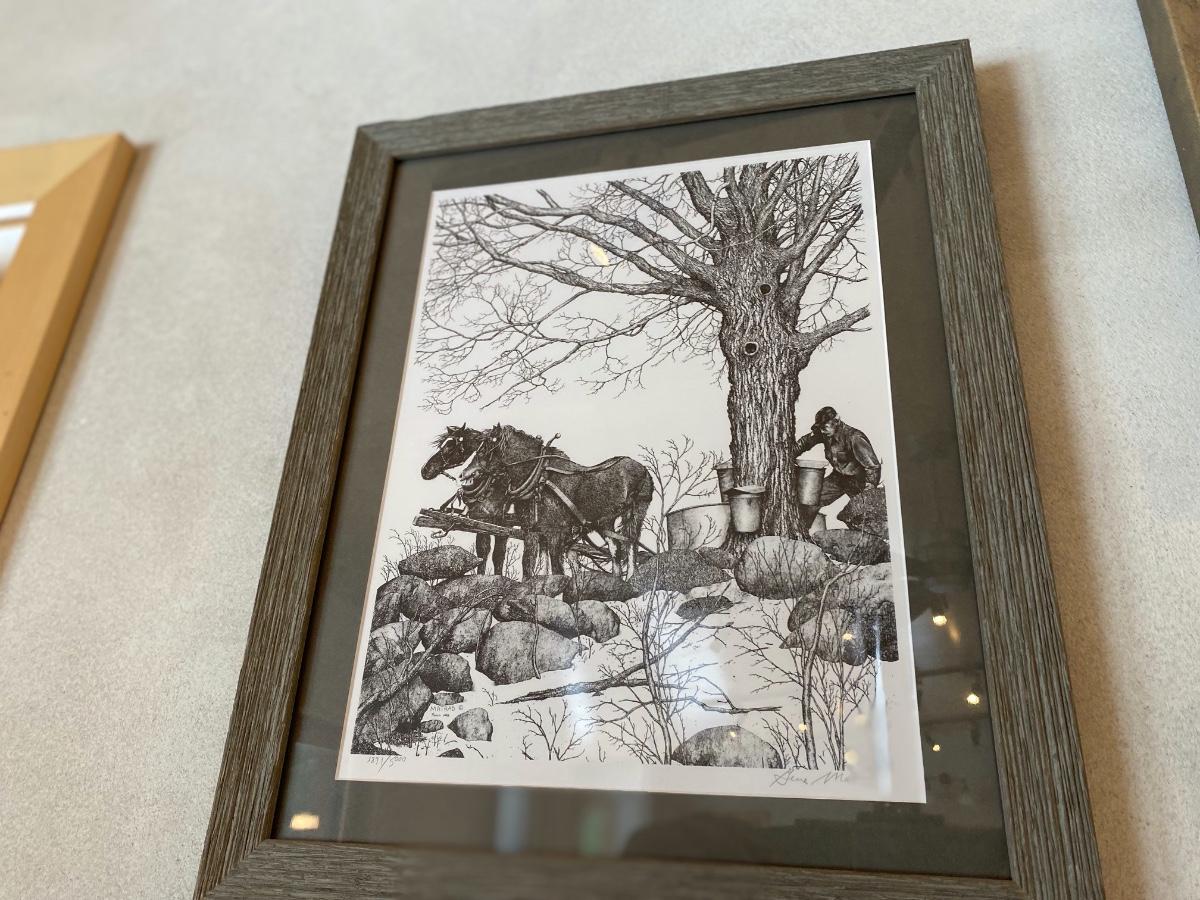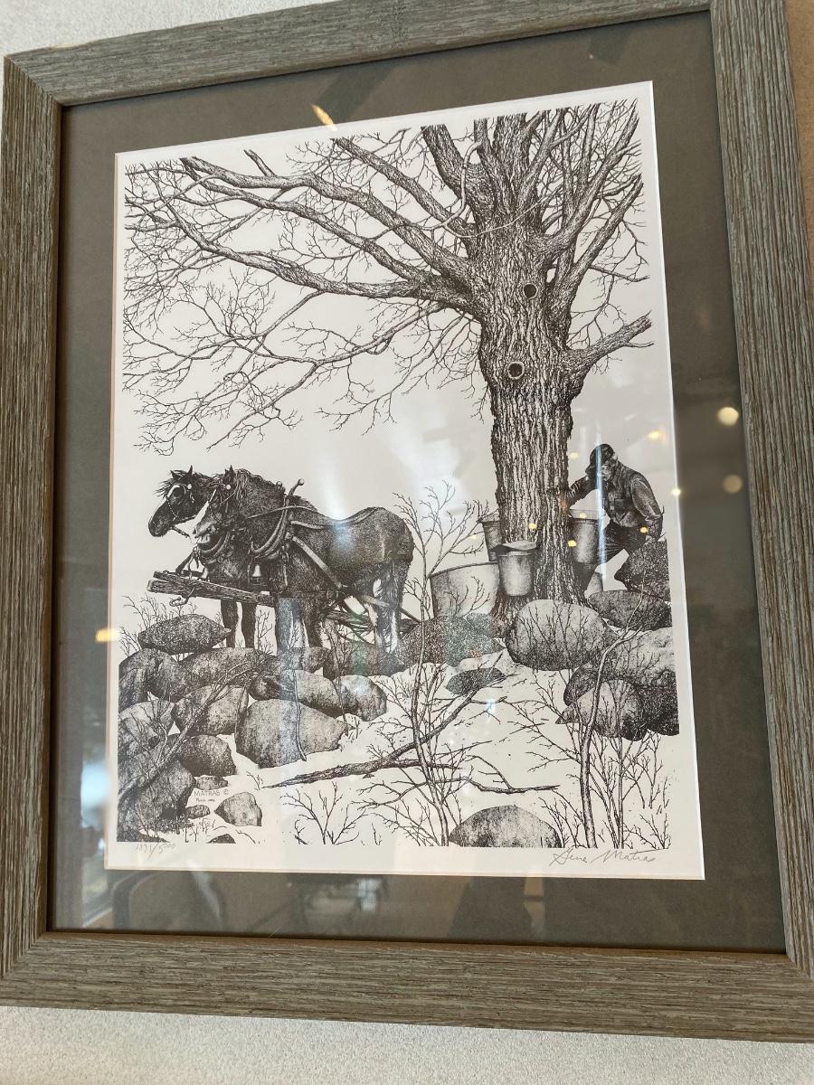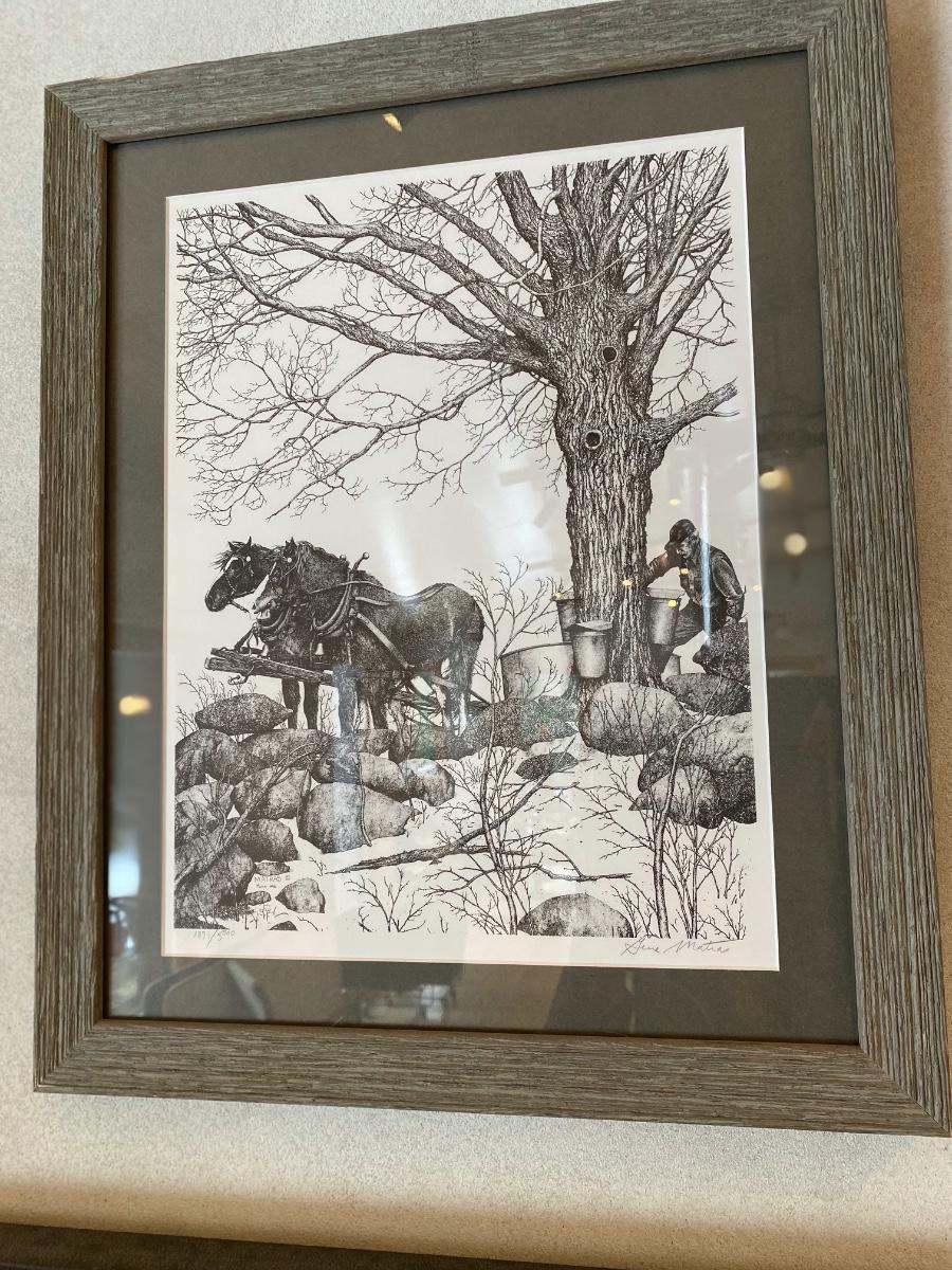 Framed "Maple Sugaring" artwork in barnwood frame