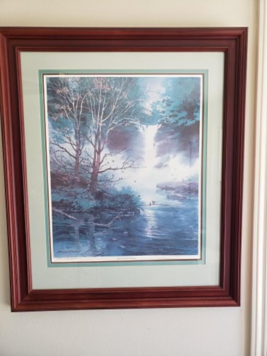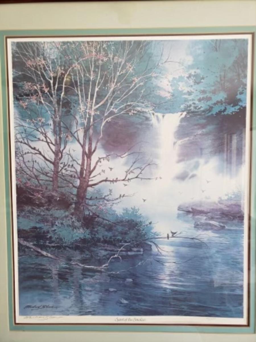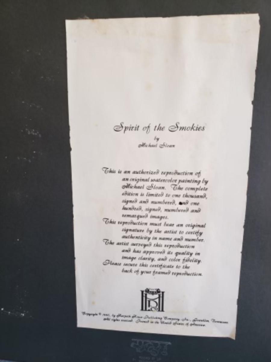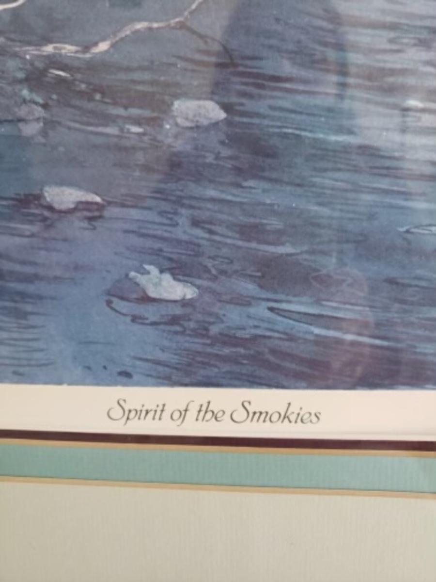 Framed, matted, signed "Spirit of the Smokies" print by Michael Sloan, numbered 108/1000. 30" W x 35"H. Excellent Condition.