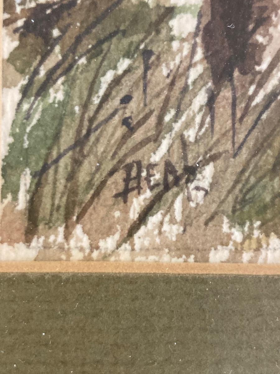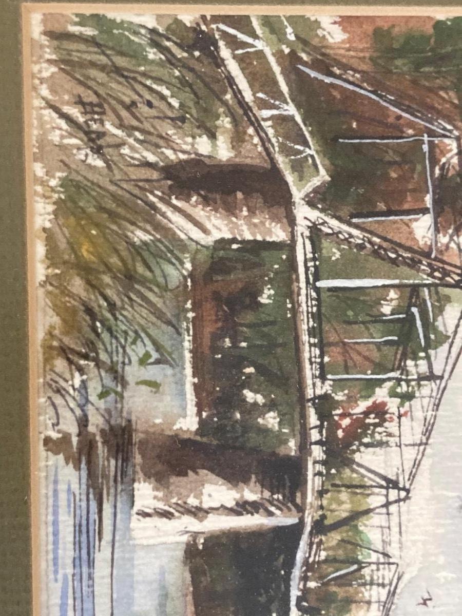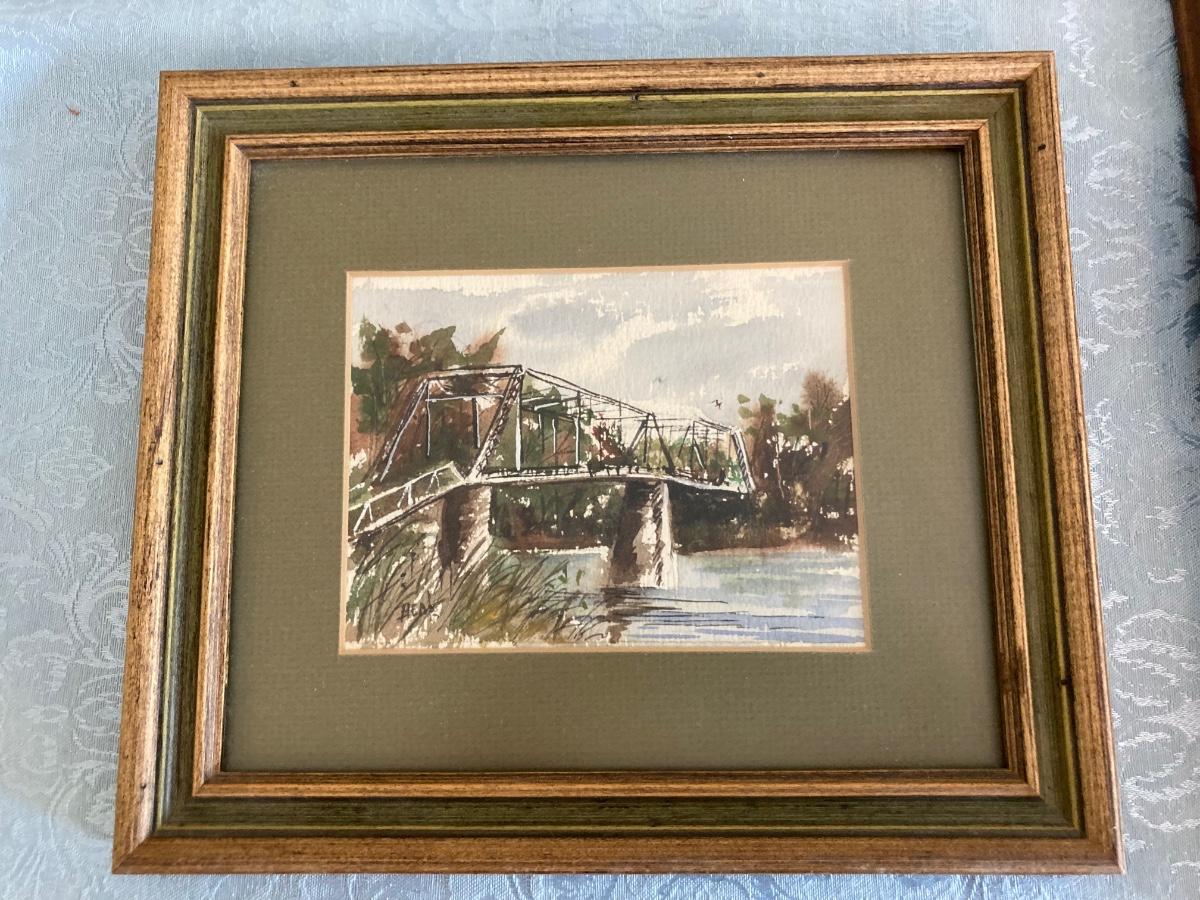 Framed, matted watercolor print of bridge over water scene. Signed by the artist. Approximately 11w X 9 1/2h.