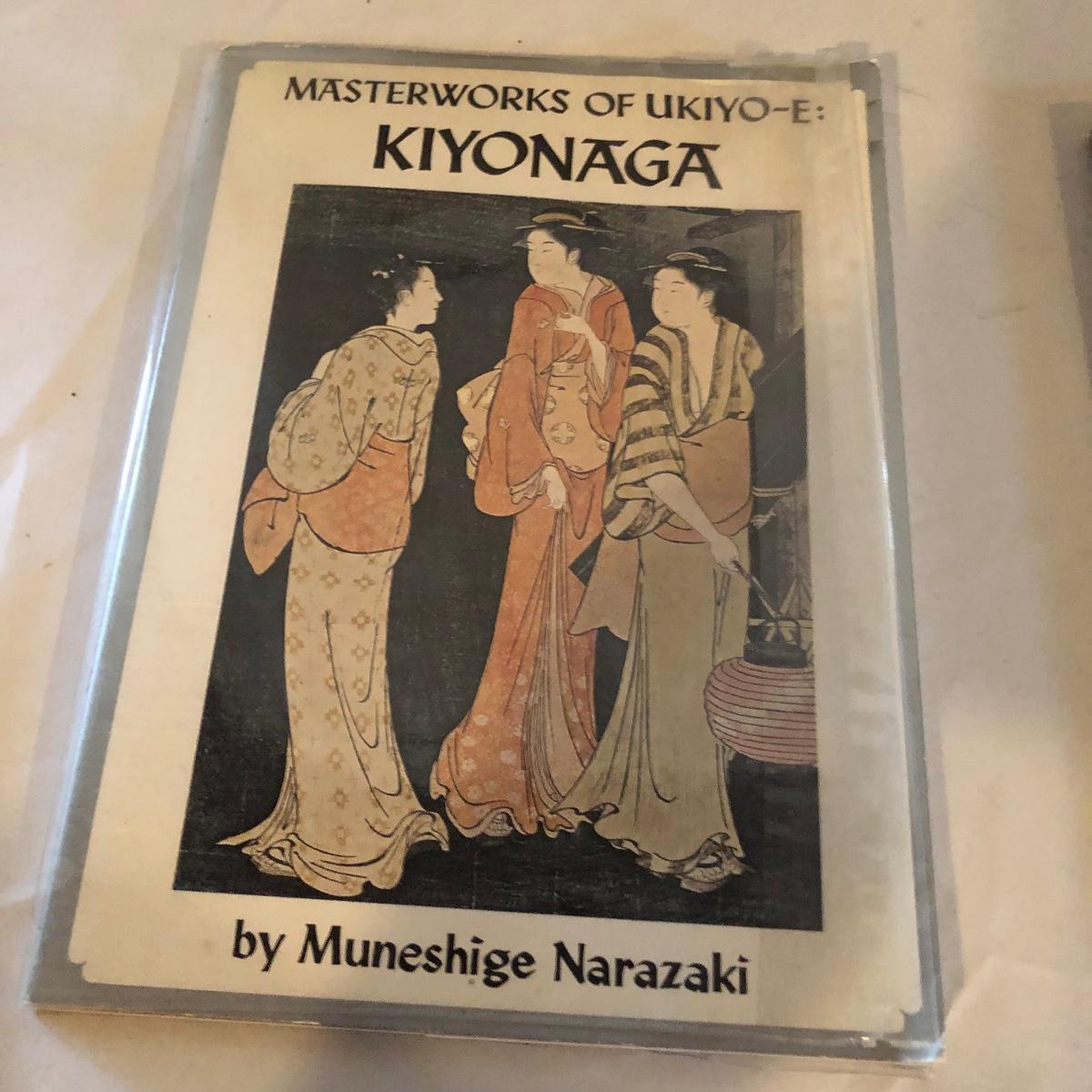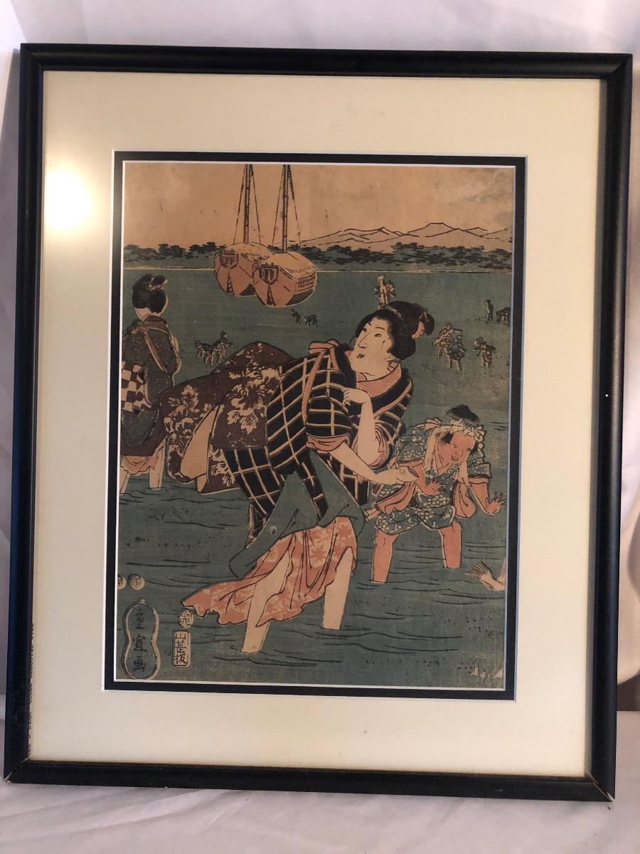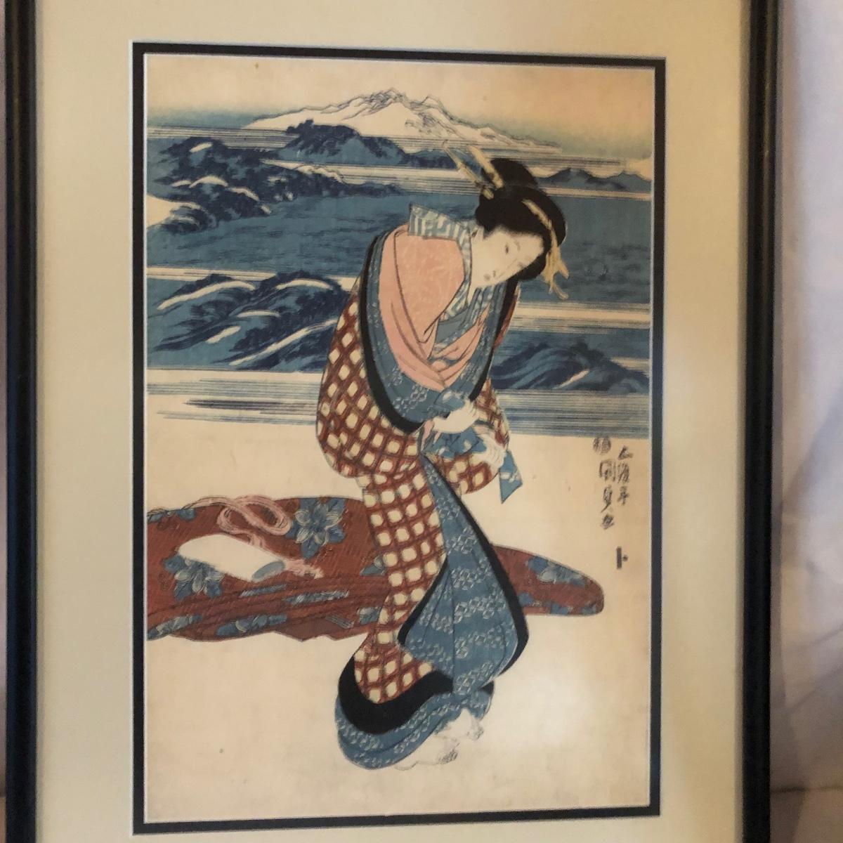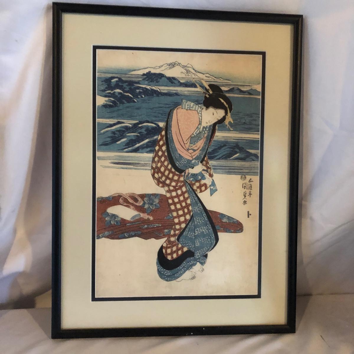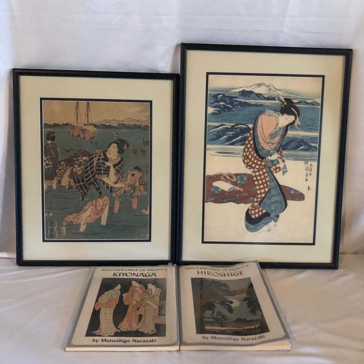 Lot includes two framed and matted woodblock prints and two books on the masterworks of Ukiyo-E. Largest frame measures 15” x 20”.