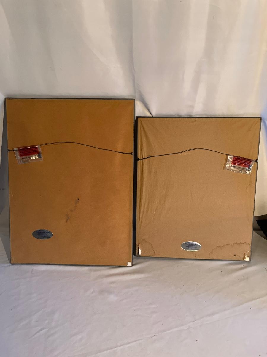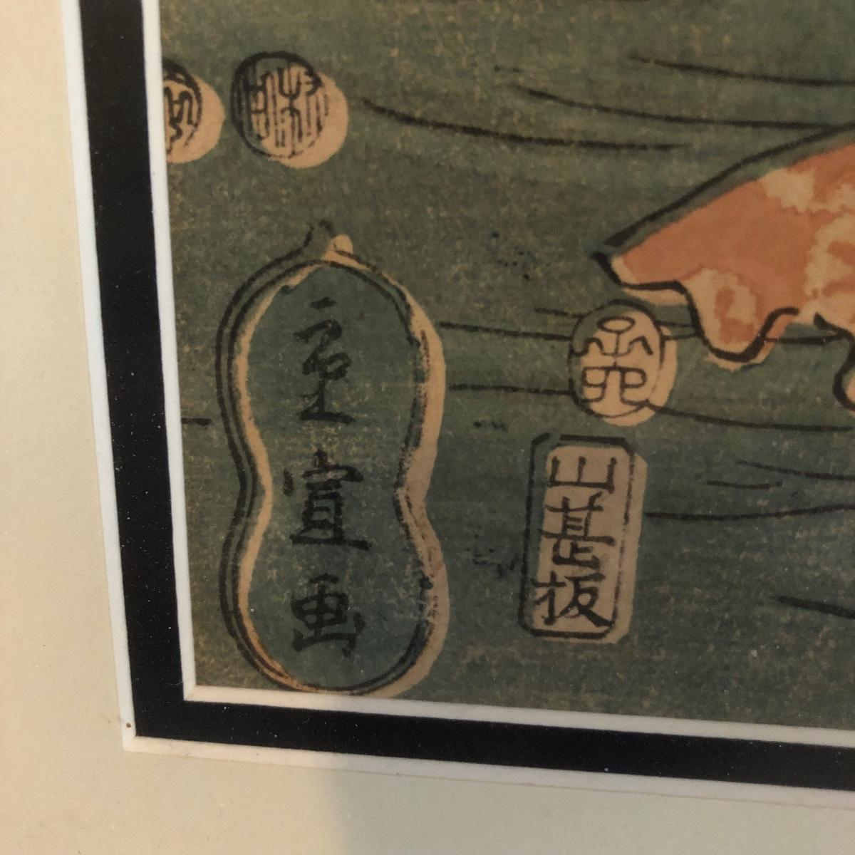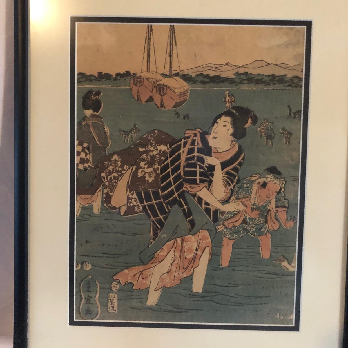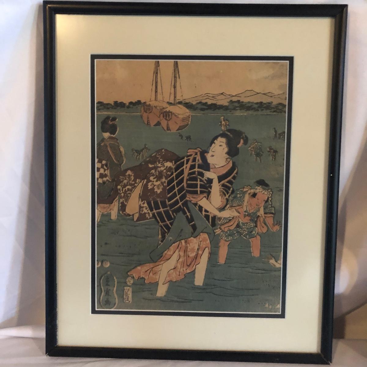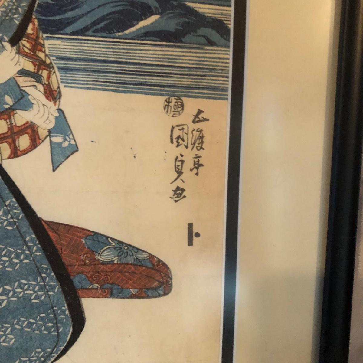 Lot includes two framed and matted woodblock prints and two books on the masterworks of Ukiyo-E. Largest frame measures 15” x 20”.