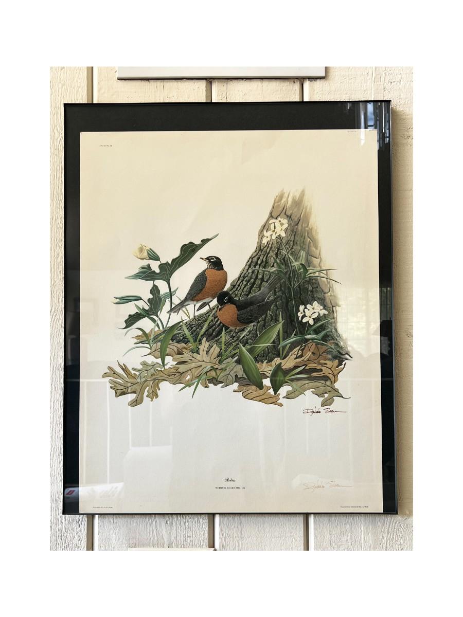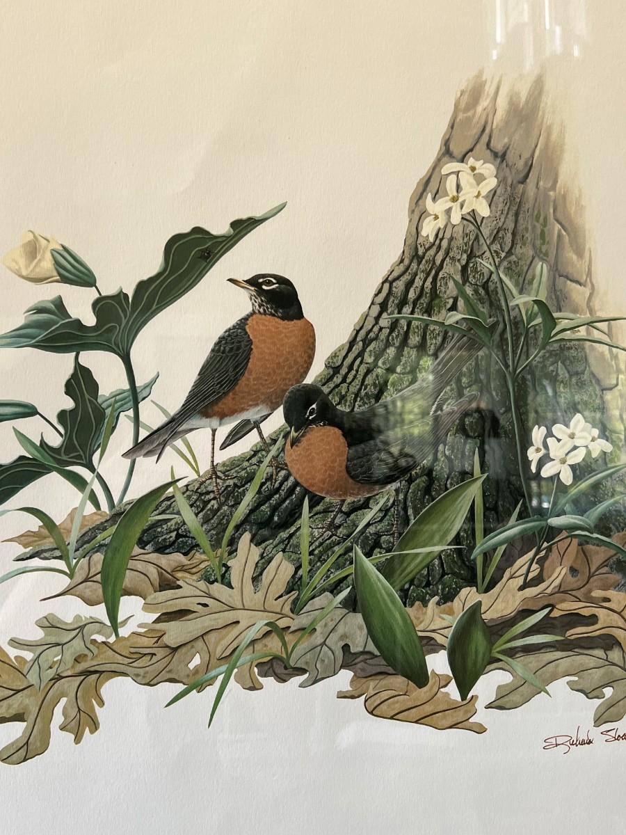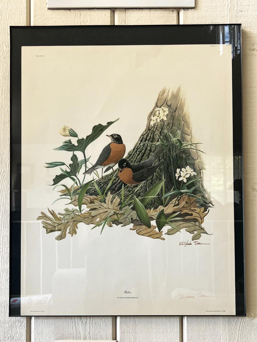 Framed Mid Century Robin Plate Print Lithograph Signed. In good condition. Could use a bit of recentering in frame. Signed by Richard Sloan.