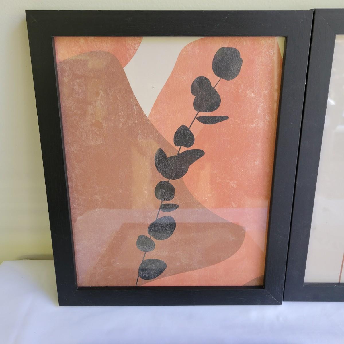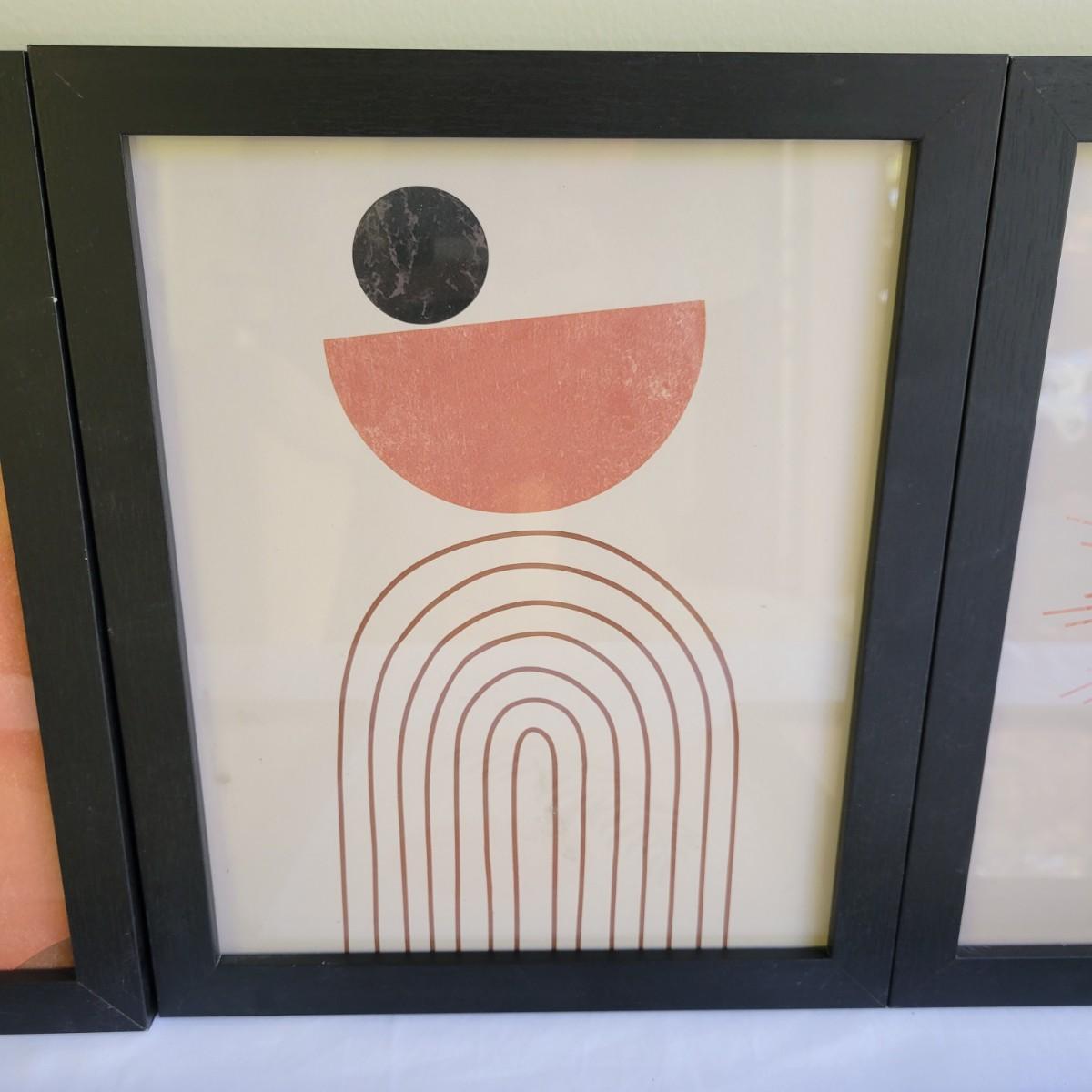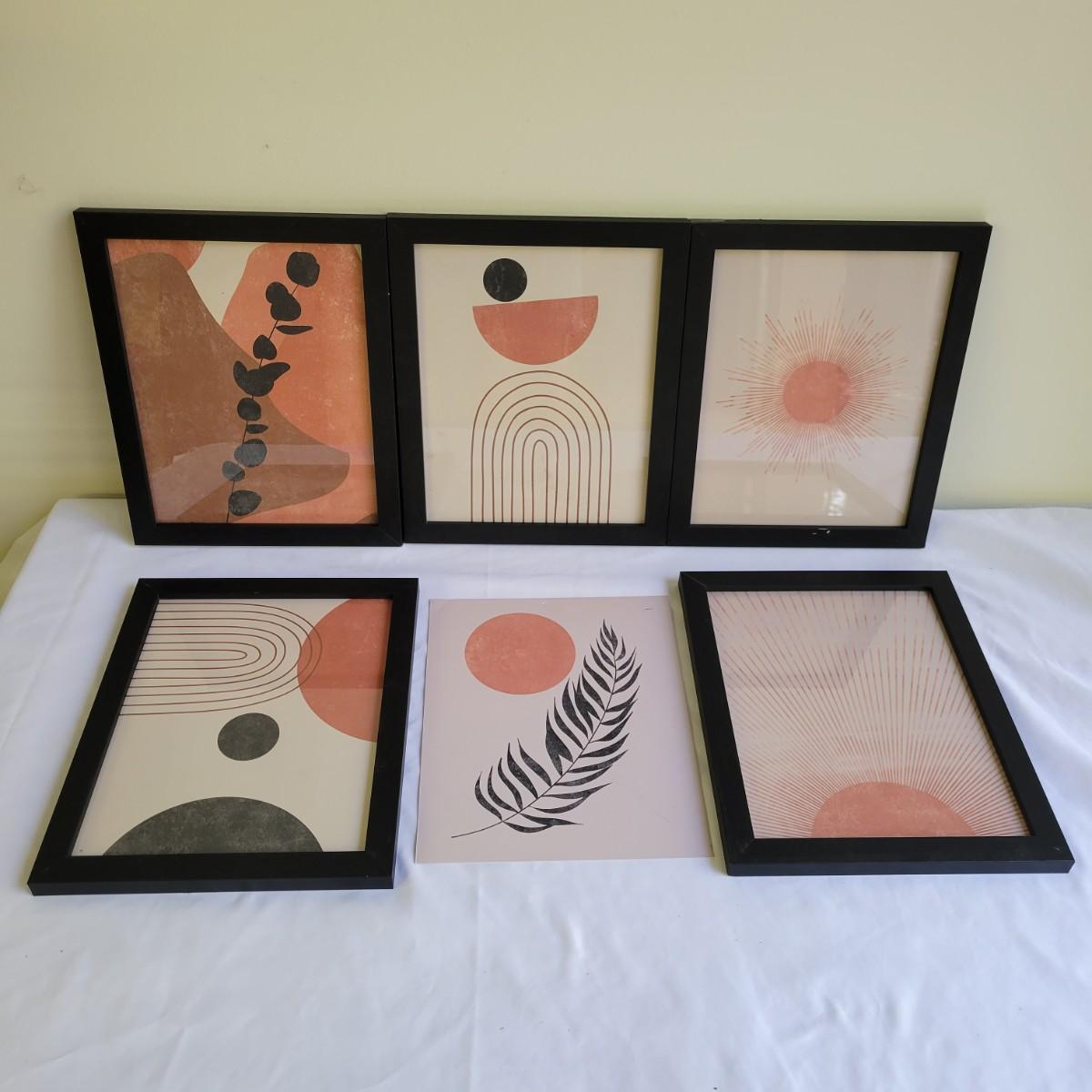 A collection of six modern art prints, five of which are framed. The framed pieces are in easel back frames with a black wrapped faux wood frame that measure approximately 9" x 11"H. Shipping available