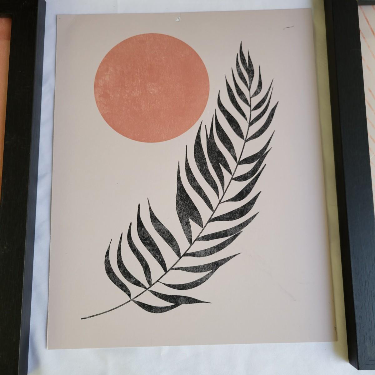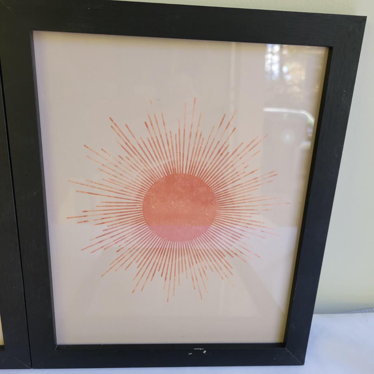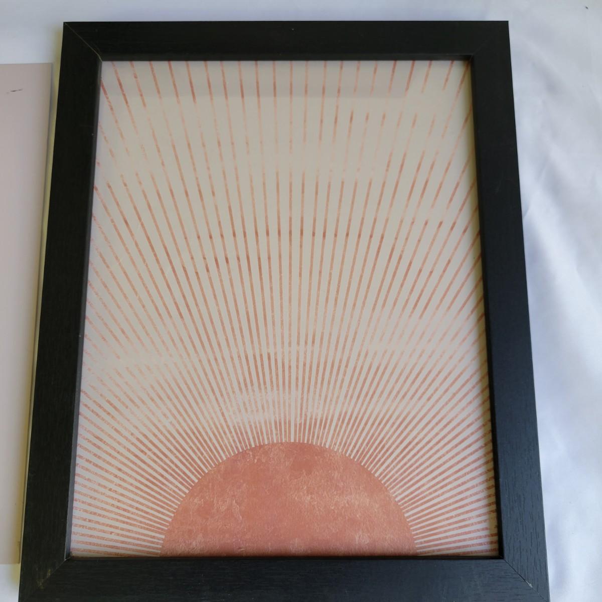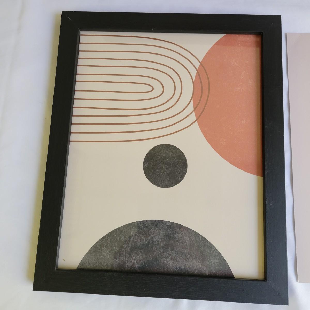 A collection of six modern art prints, five of which are framed. The framed pieces are in easel back frames with a black wrapped faux wood frame that measure approximately 9" x 11"H. Shipping available