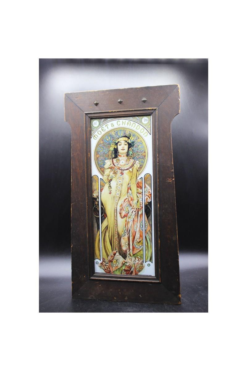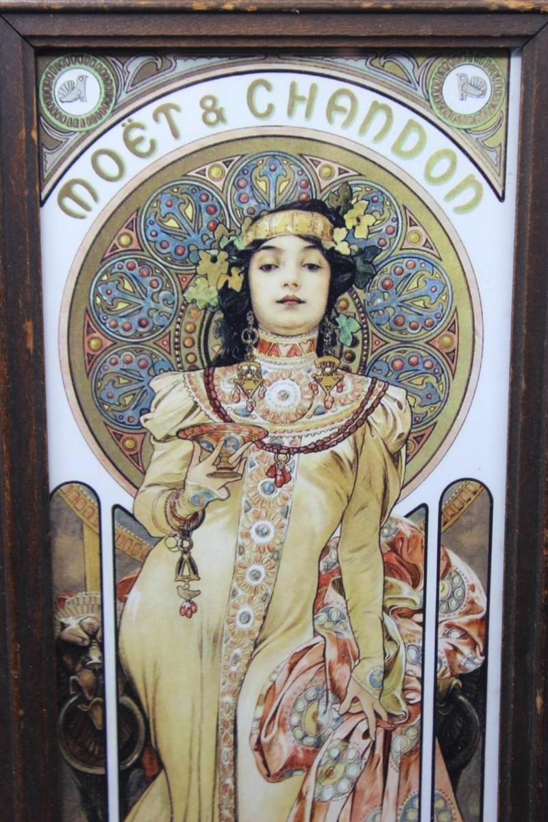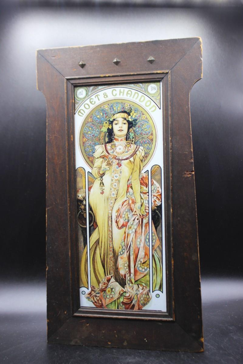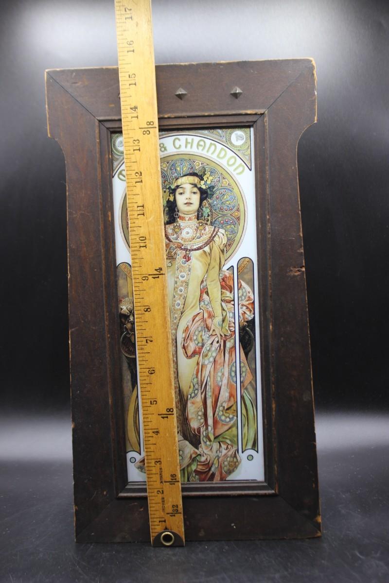 Framed Moet Chandon Wine Imperial Art Nouveau Woman Print Poster, there is no significant damage to the frame or protective glass and is in good condition. The print looks a bit pixilated, but is still a good displayable piece. Check pictures for more details and for sizing.