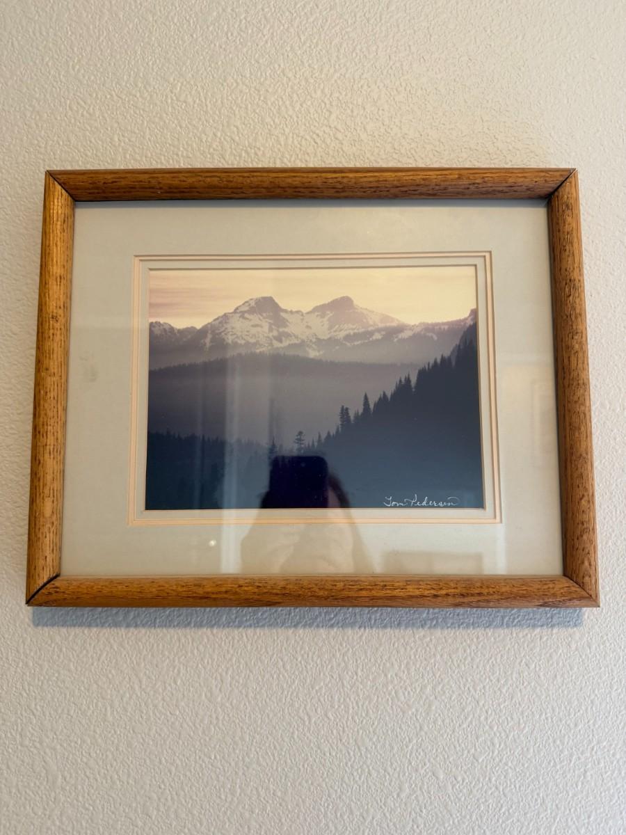 Beautifully matted photograph of snow-capped mountains in soft dusk lighting. Signature in corner.