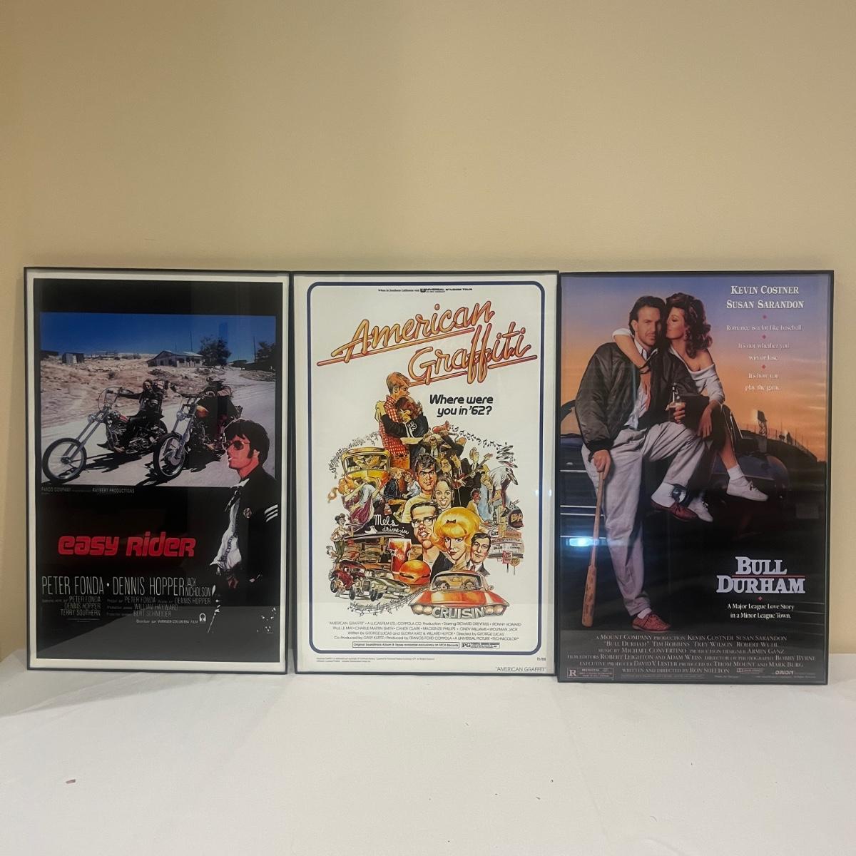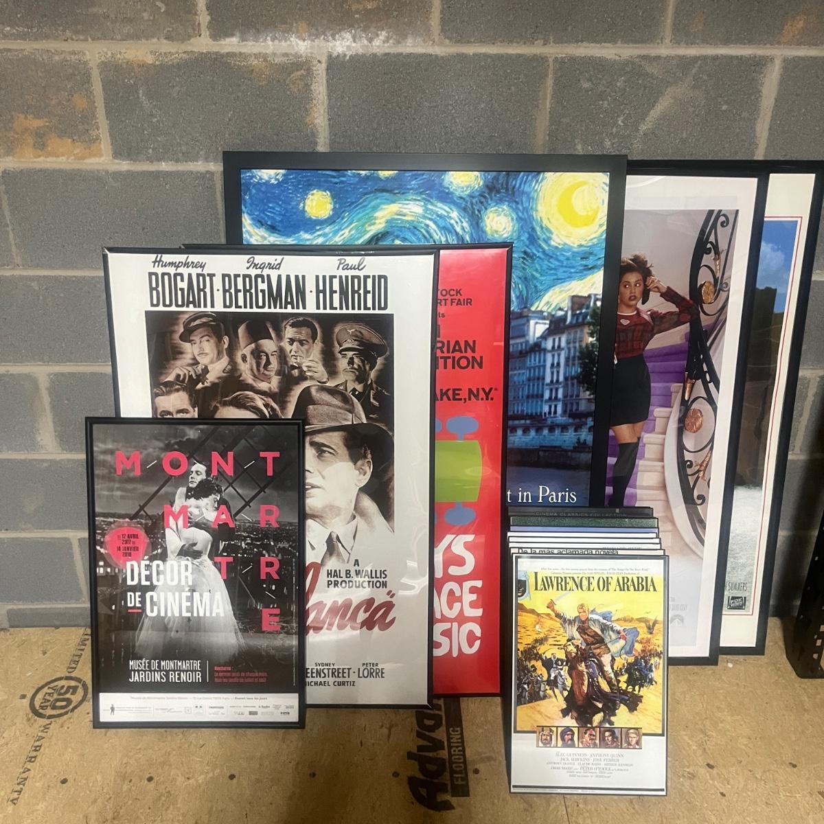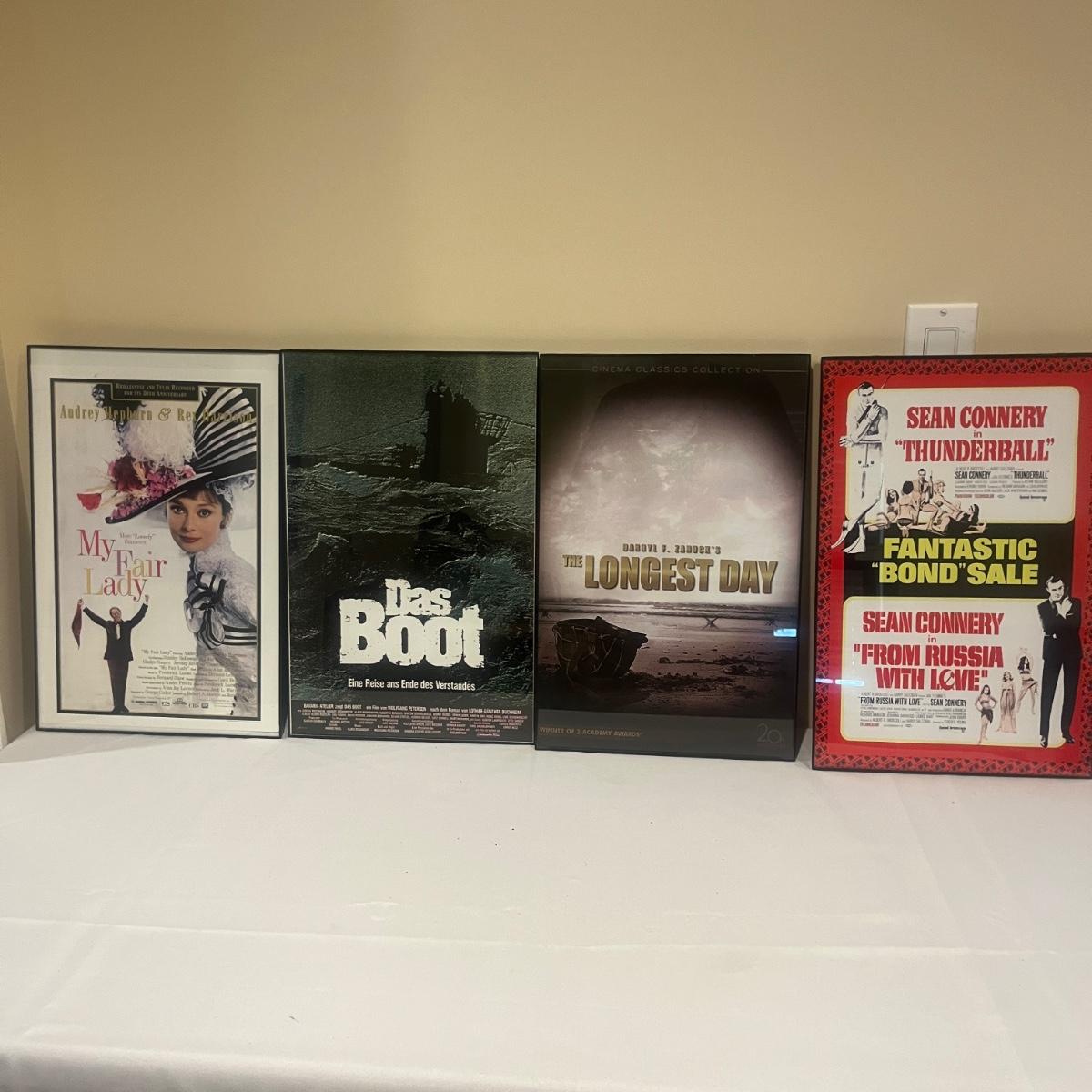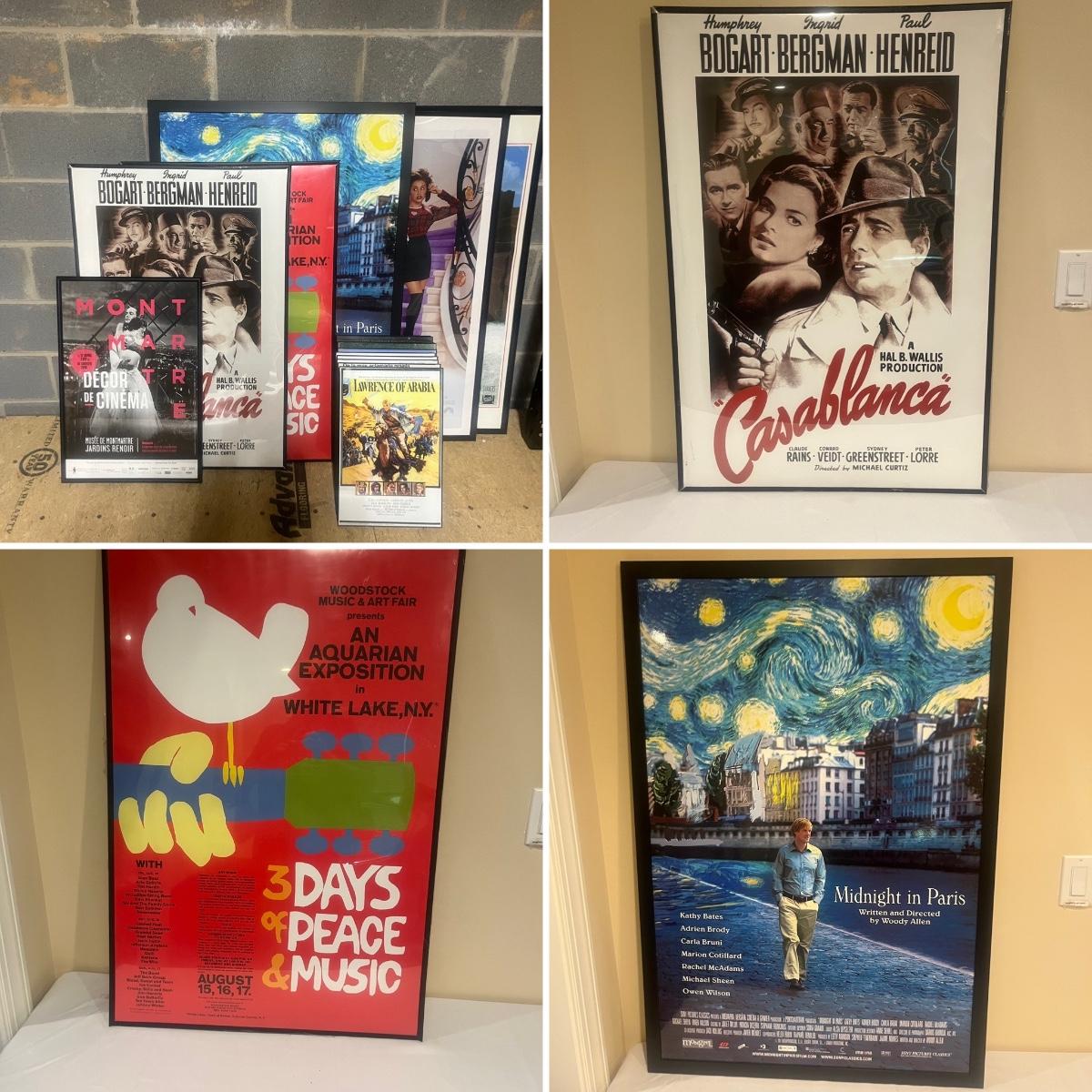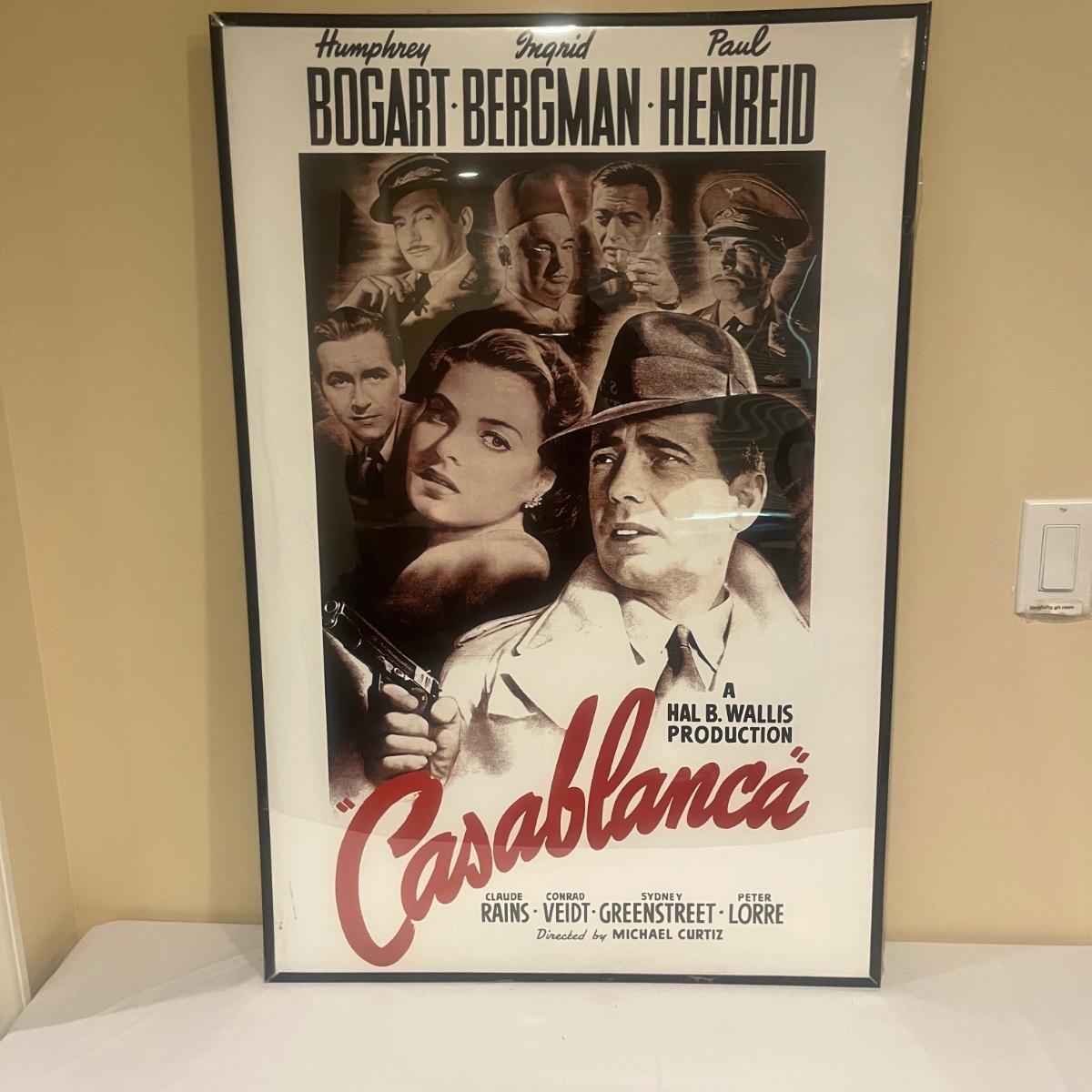 Lot contains a collection of classic framed movie poster that includes Thunderball, Clueless, Dad Boot, My Fair Lady, Casablanca and more. Frames at plastic with posters under plexiglass. Largest frame measures 28” x 41”H. Posters are reproductions.