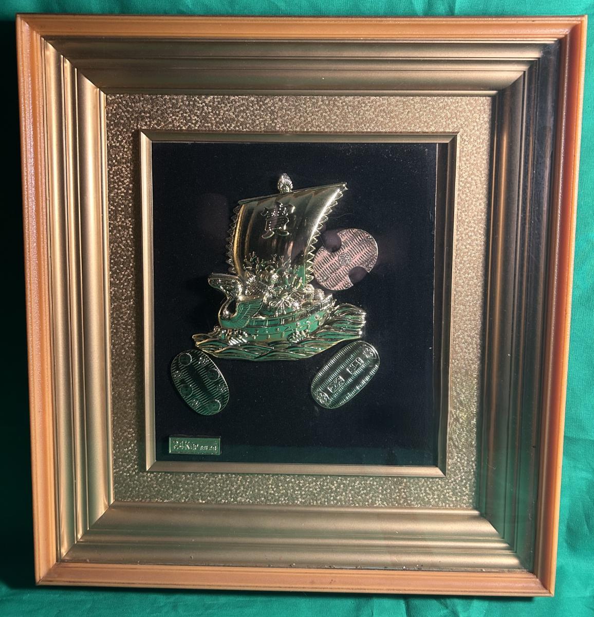 Two framed artworks featuring gold relief designs. 24kt Gold Plated. One piece showcases a traditional Japanese-style ship with additional elements, including waves and coins, against a black velvet background framed in ornate gold-tone frames. The large frame features a ship with added birds and clouds designs. Excellent condition with no major visible defects, ready for display.