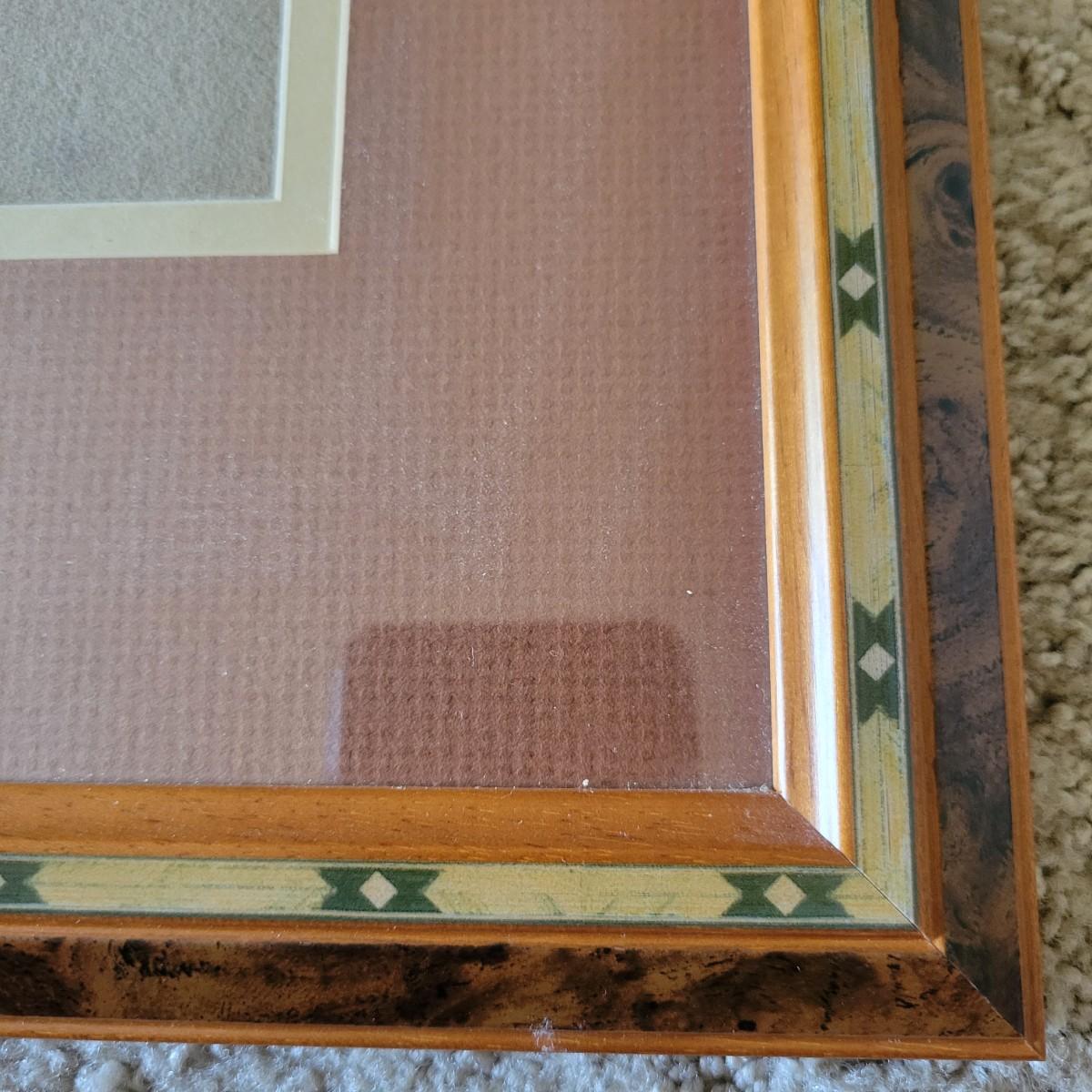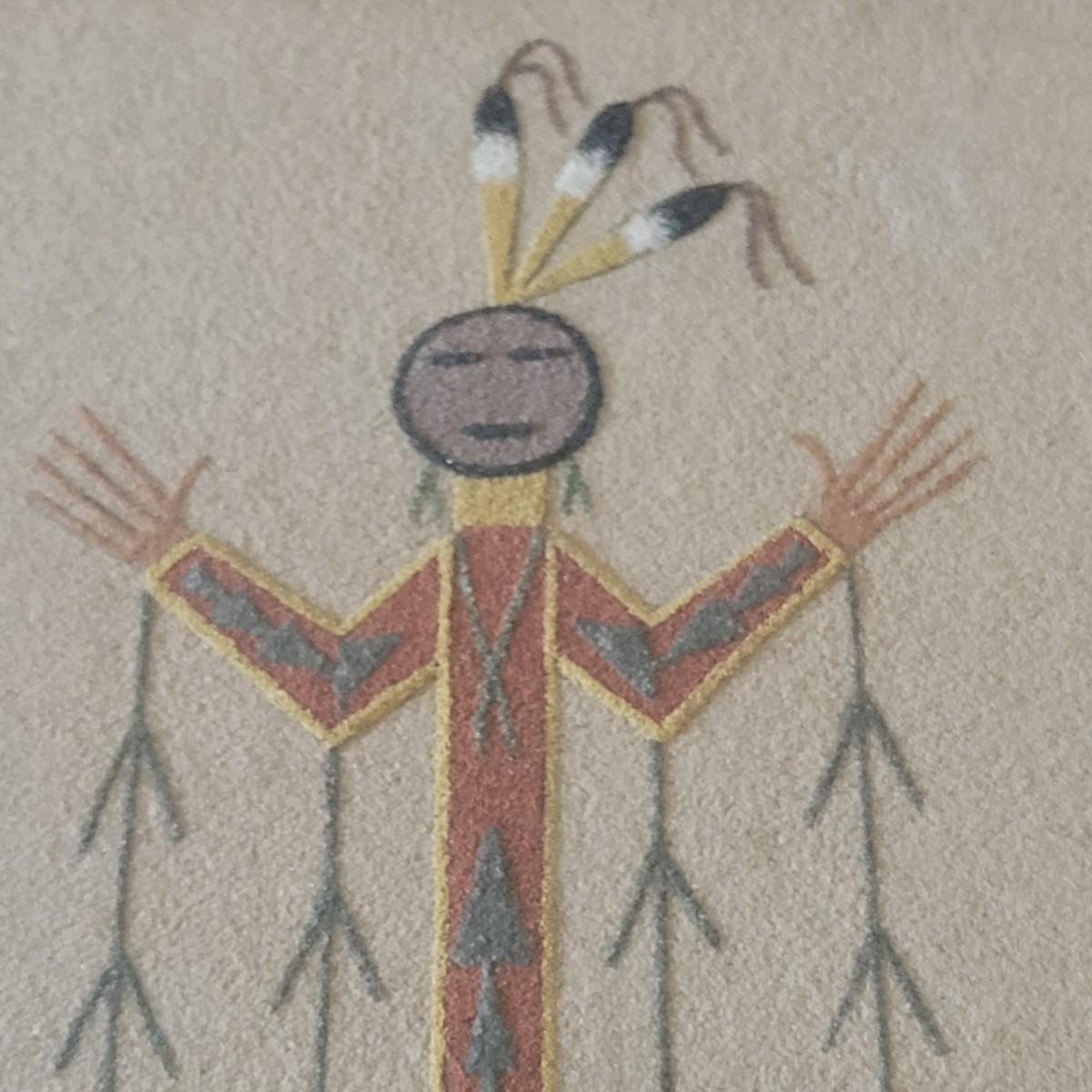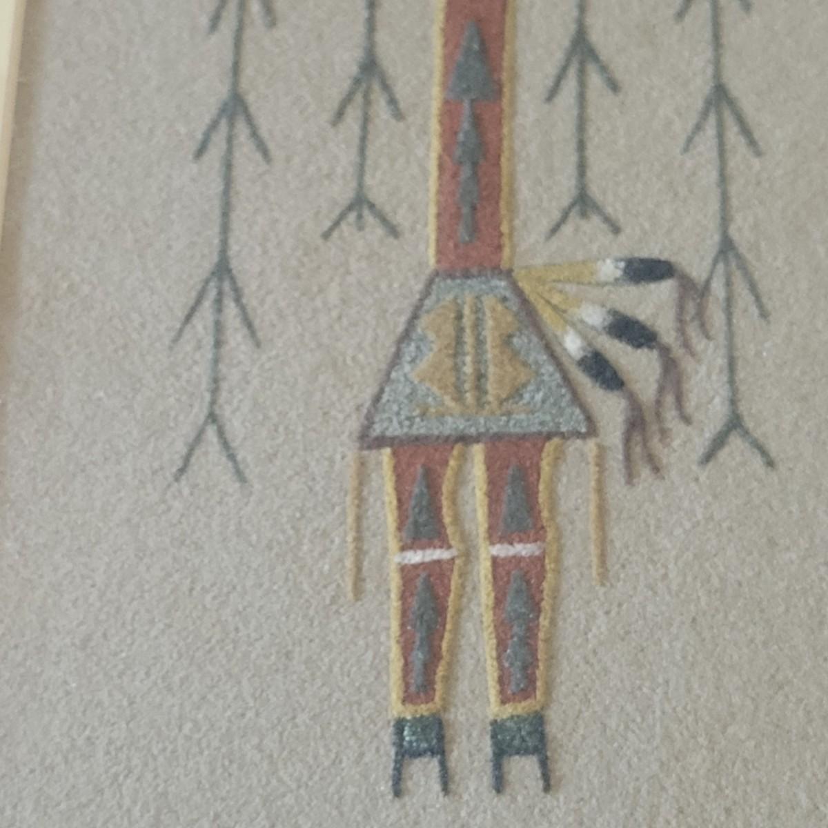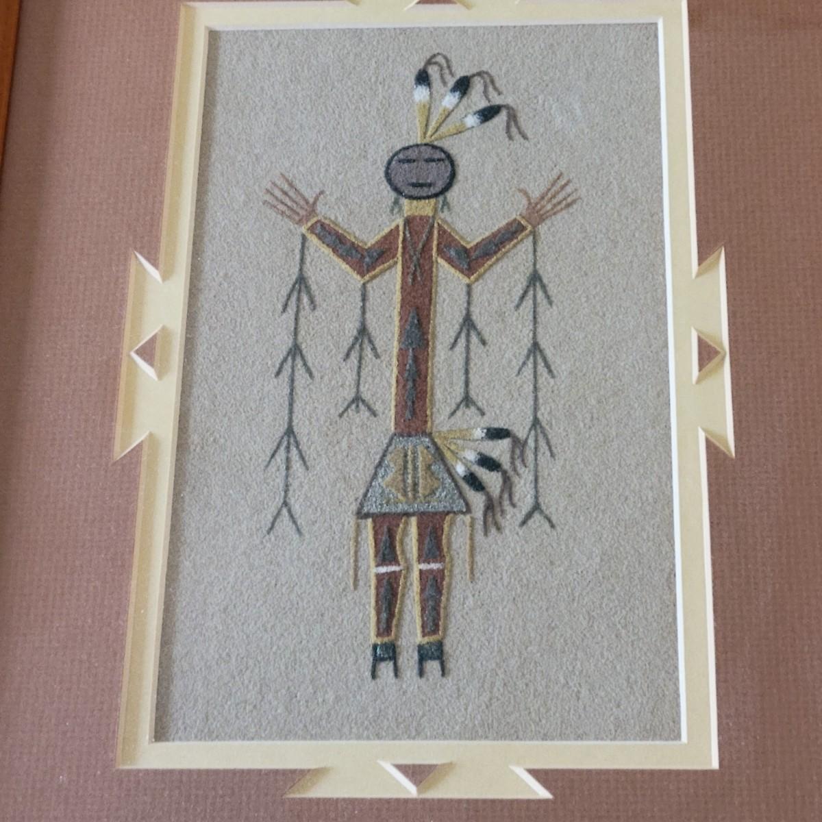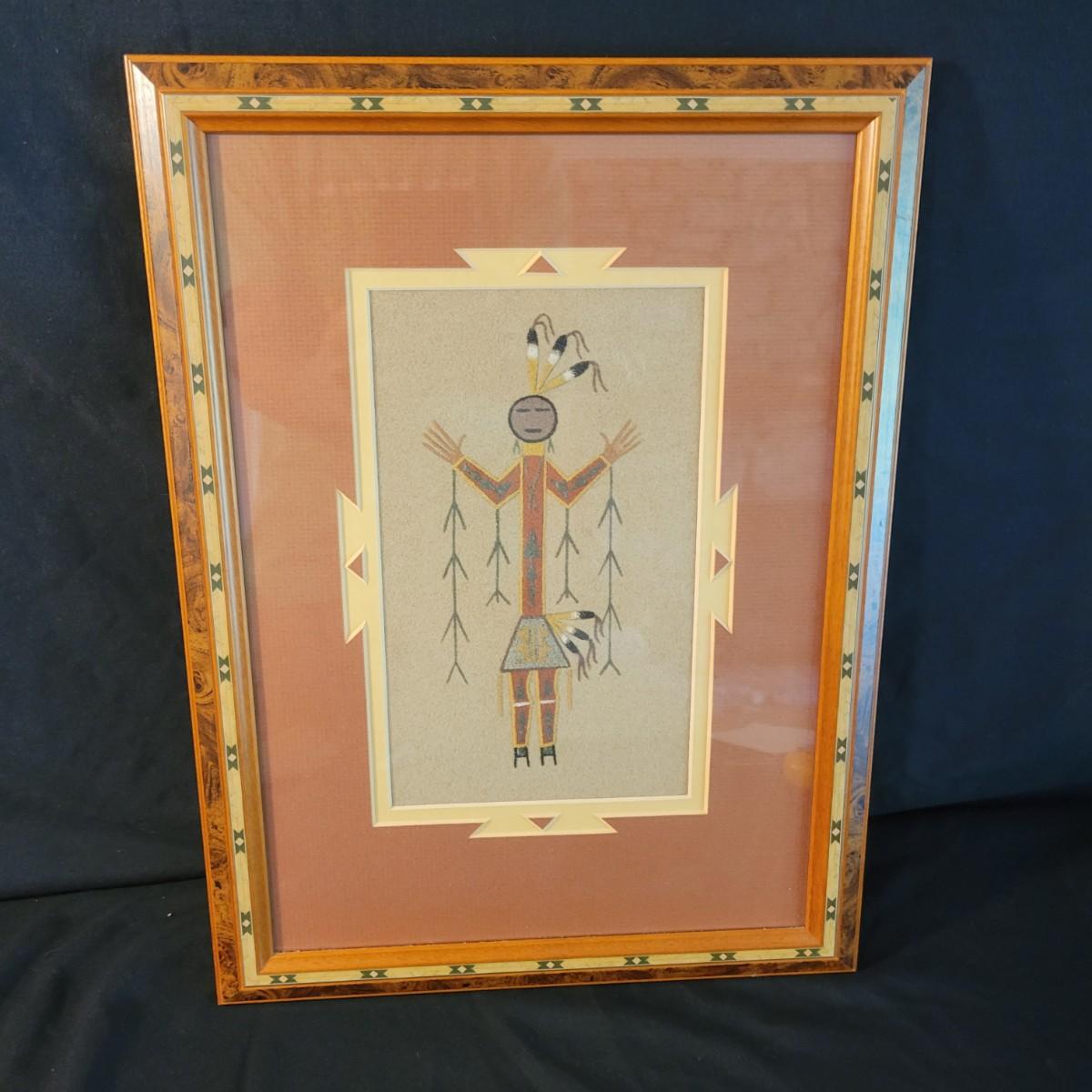 Art that is in the style of a Native American Navajo sand painting. This piece of art appears to be made entirely of colored sand. It is double matted with a Southwestern design and has a wooden frame with gold accents and an inlay. It measures approximately 12.5" x 1" x 16.5"H. Note that the dark spot in the bottom corner of one picture is just a reflection and not a stain on the mat. Shipping available. Shipping can be costly. We suggest contacting our preferred local shipping provider, Postage Express, with dimensions and getting an estimate before bidding: (828) 670-5501 or postageexpress@yahoo.com.