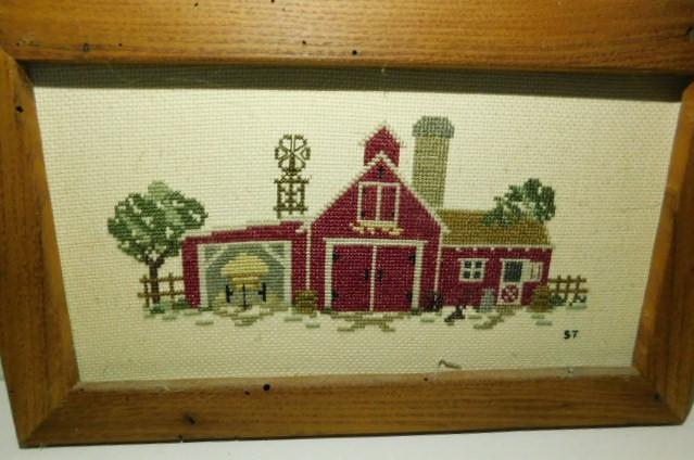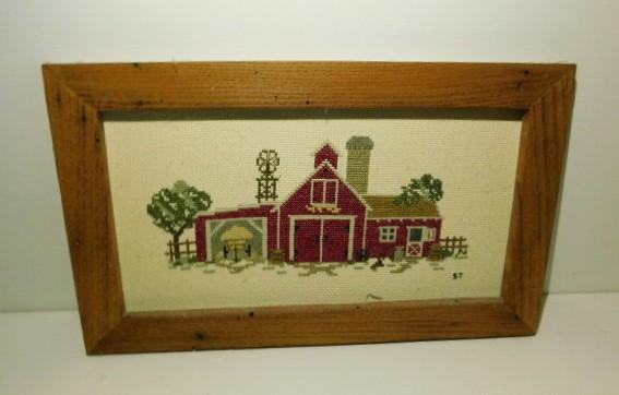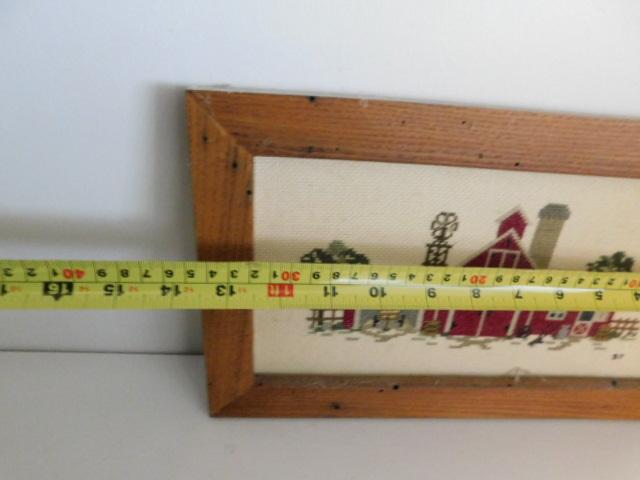 Framed Needle Work Red Barn 13". Board will need to be re-secured to the frame.