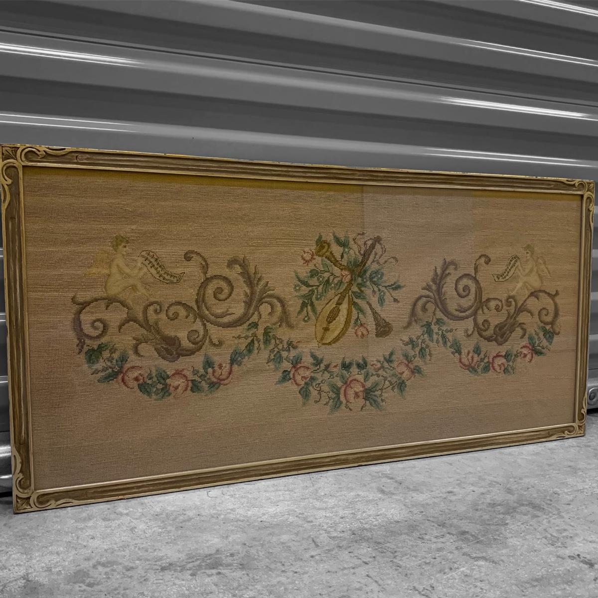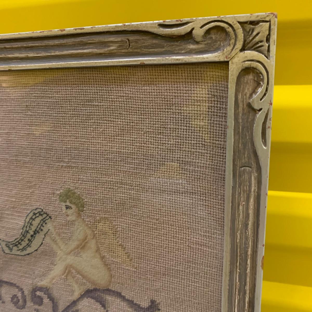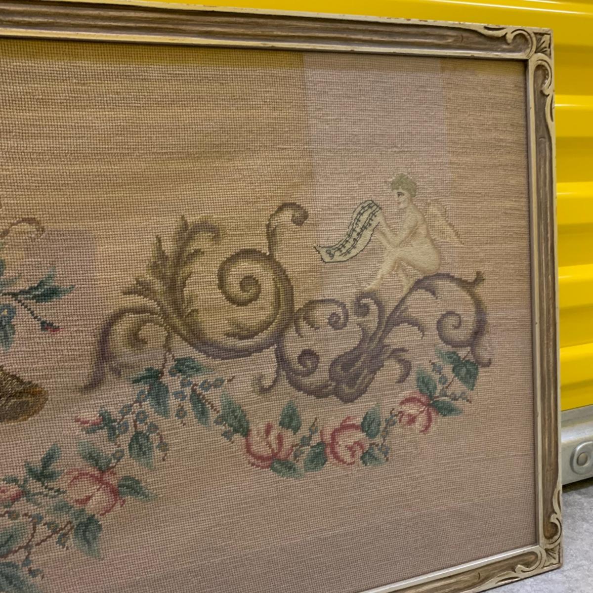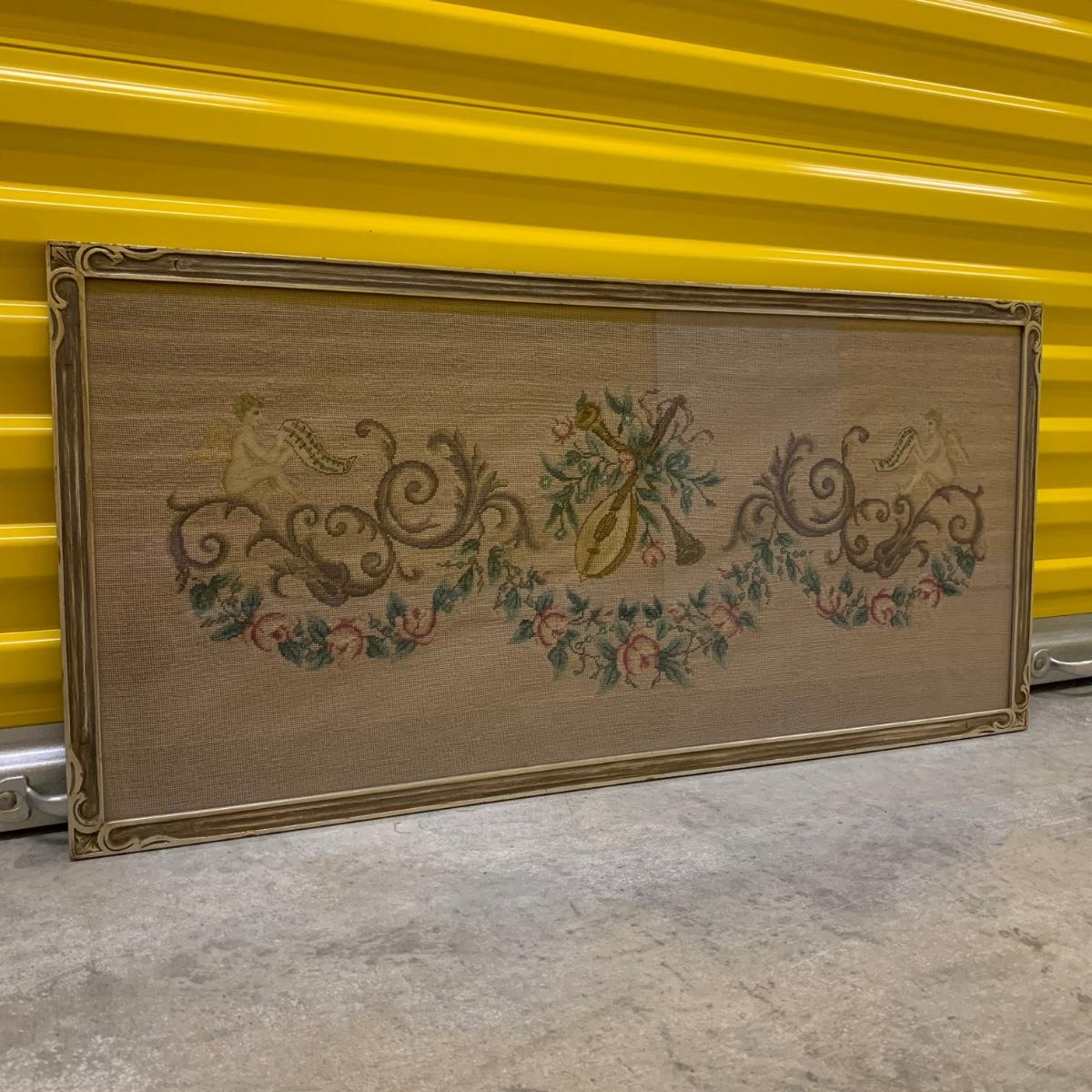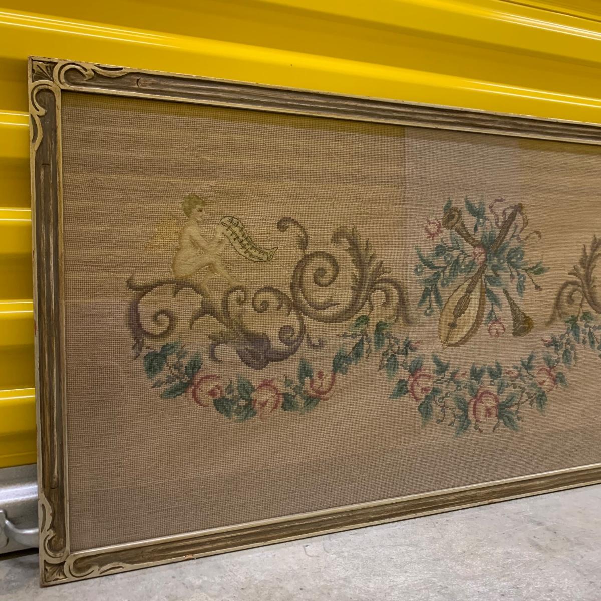 Needlepoint art behind glass in a decorative frame. The background is a light tan/mocha color. Most of the art is made with a thicker thread/yarn, but the angels are made with a thinner/finer thread. The frame is wood painted with a metallic golden color with a distressed look. There is a sturdy wire on the back for hanging the art. The frame measures 38.5” x 18.5”. It is in good condition with the exception of the small tears in the paper on the back. Shipping available. Shipping art can be costly. We suggest calling our local UPS with dimensions and getting an estimate before bidding: (828) 252-6930.