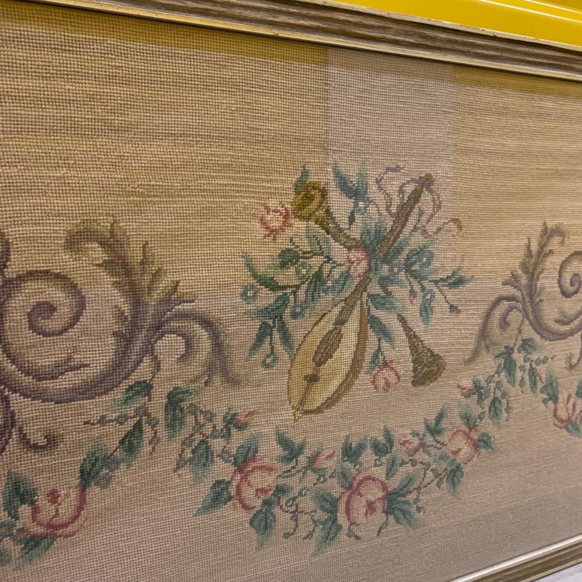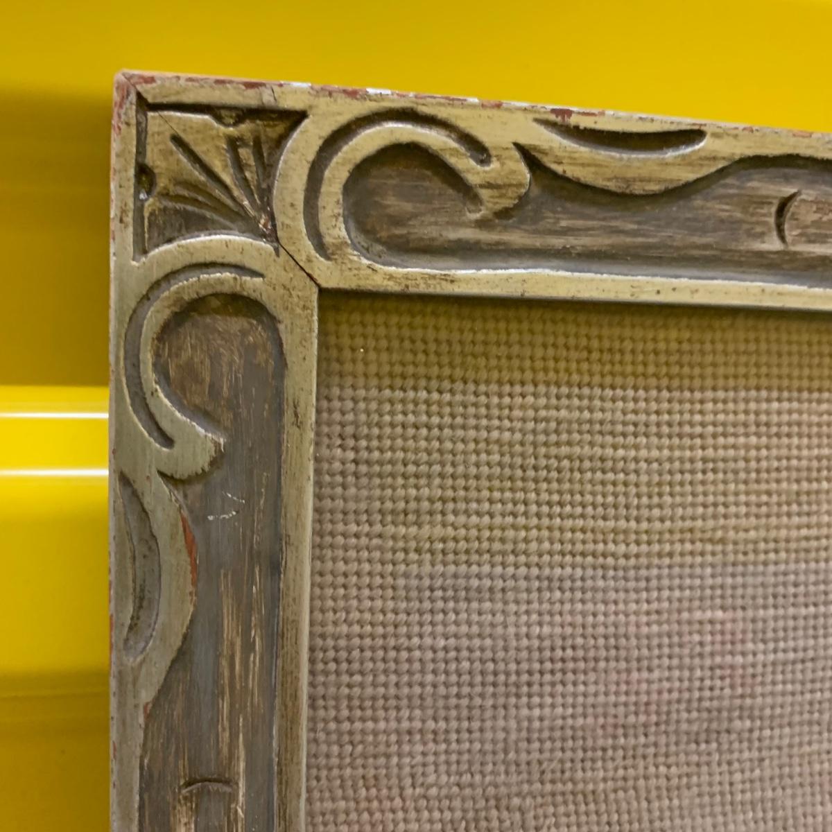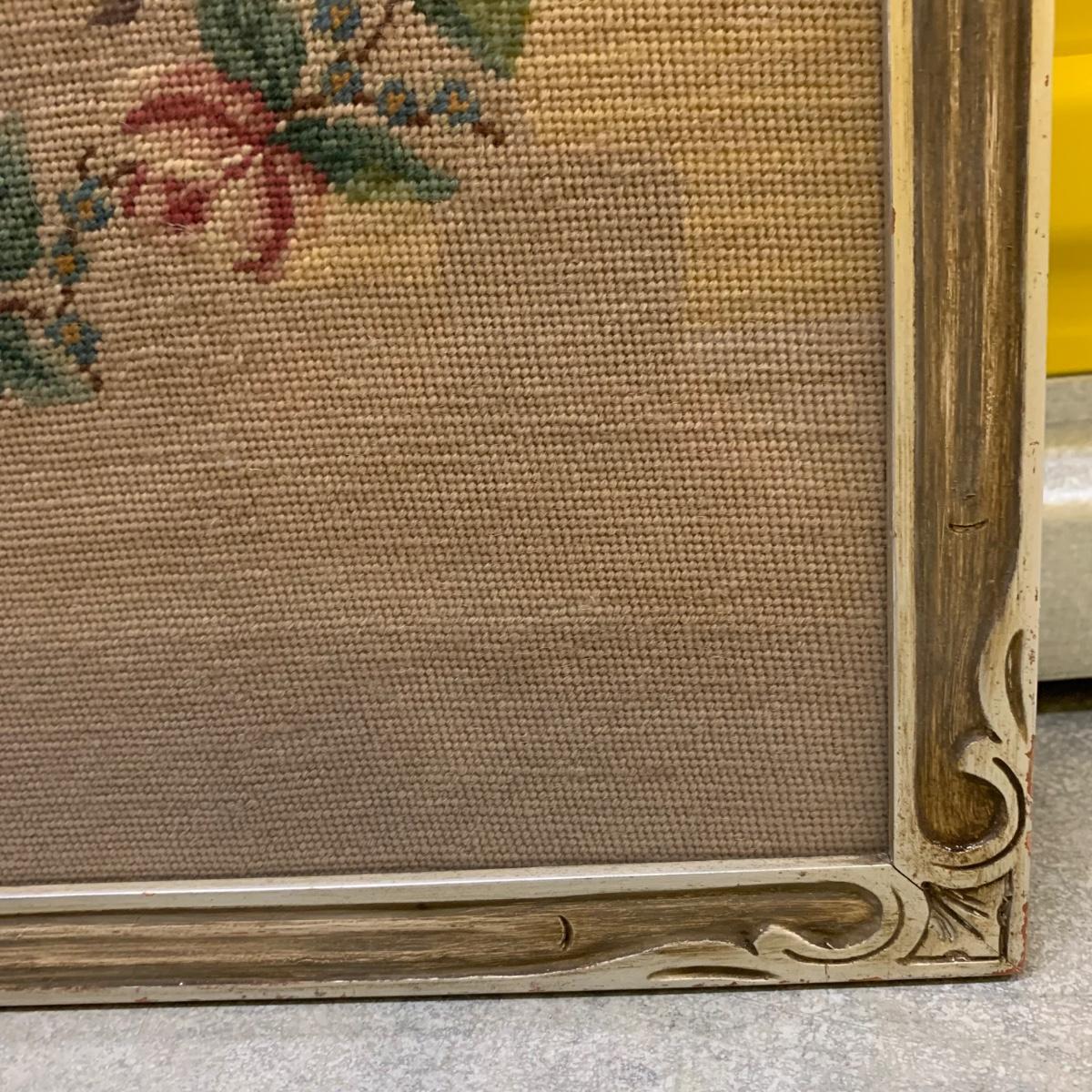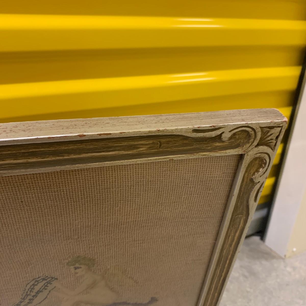 Needlepoint art behind glass in a decorative frame. The background is a light tan/mocha color. Most of the art is made with a thicker thread/yarn, but the angels are made with a thinner/finer thread. The frame is wood painted with a metallic golden color with a distressed look. There is a sturdy wire on the back for hanging the art. The frame measures 38.5” x 18.5”. It is in good condition with the exception of the small tears in the paper on the back. Shipping available. Shipping art can be costly. We suggest calling our local UPS with dimensions and getting an estimate before bidding: (828) 252-6930.
