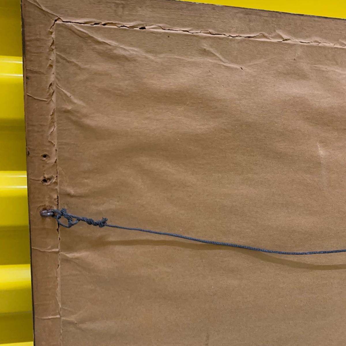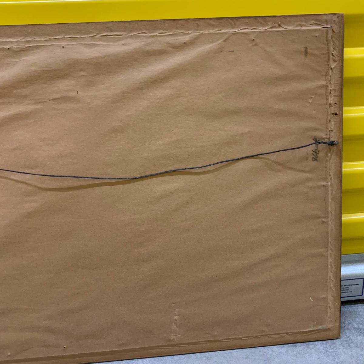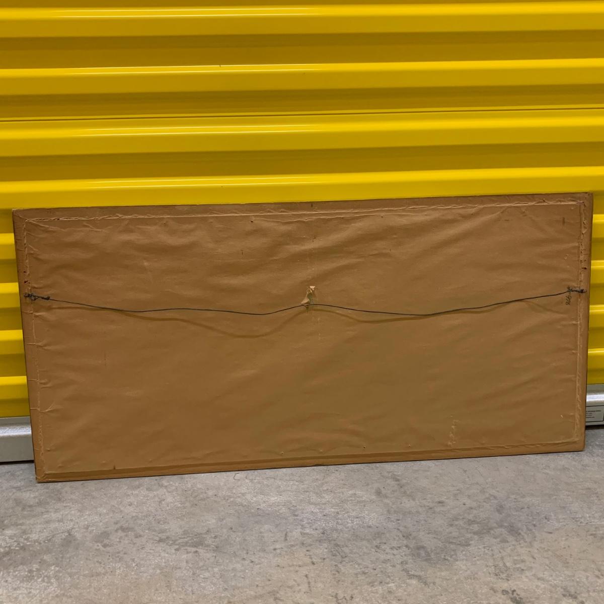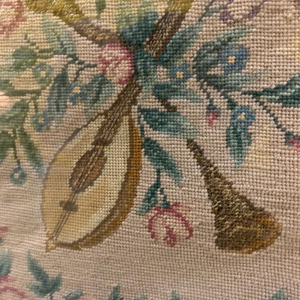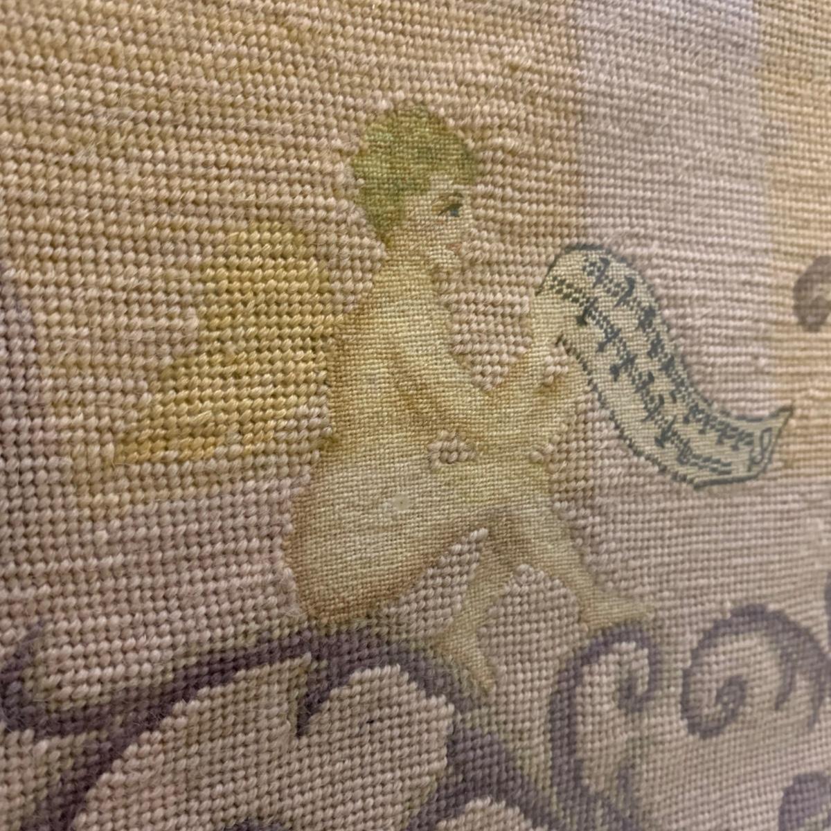 Needlepoint art behind glass in a decorative frame. The background is a light tan/mocha color. Most of the art is made with a thicker thread/yarn, but the angels are made with a thinner/finer thread. The frame is wood painted with a metallic golden color with a distressed look. There is a sturdy wire on the back for hanging the art. The frame measures 38.5” x 18.5”. It is in good condition with the exception of the small tears in the paper on the back. Shipping available. Shipping art can be costly. We suggest calling our local UPS with dimensions and getting an estimate before bidding: (828) 252-6930.