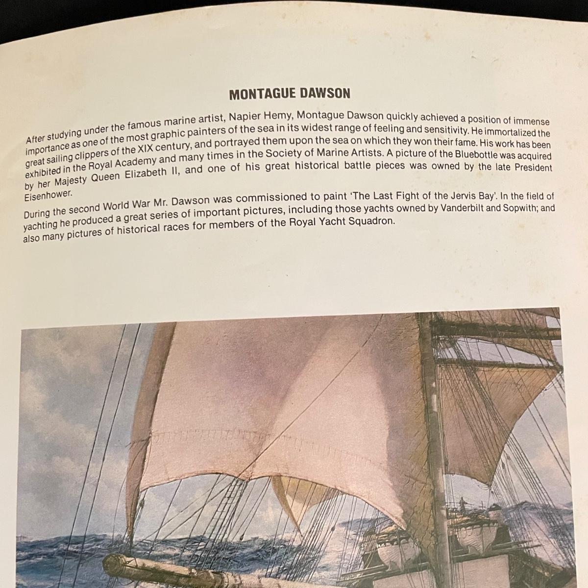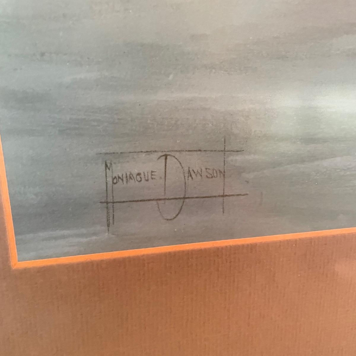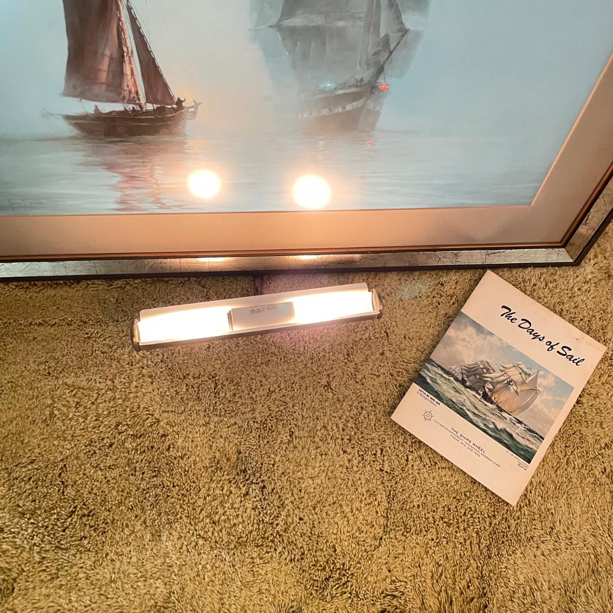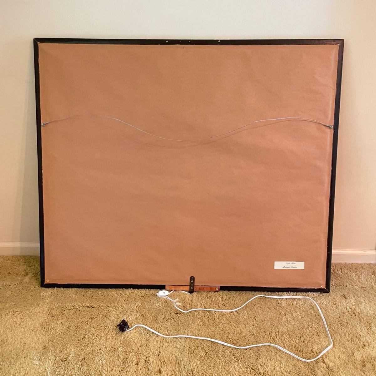 Nautical art by Montegue Dawson titled “Night Mists” sits behind low glare glass in a wooden frame measuring 39” x 33”. Attached to the frame is a working spotlight and we’ve also included a catalog about the artist. See images. Shipping available. Please call our local UPS with dimensions at 828-252-6930 for a shipping quote prior to bidding.