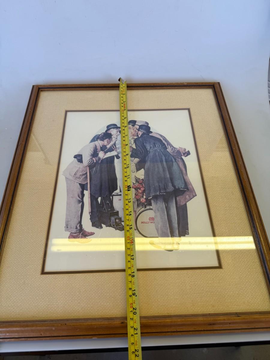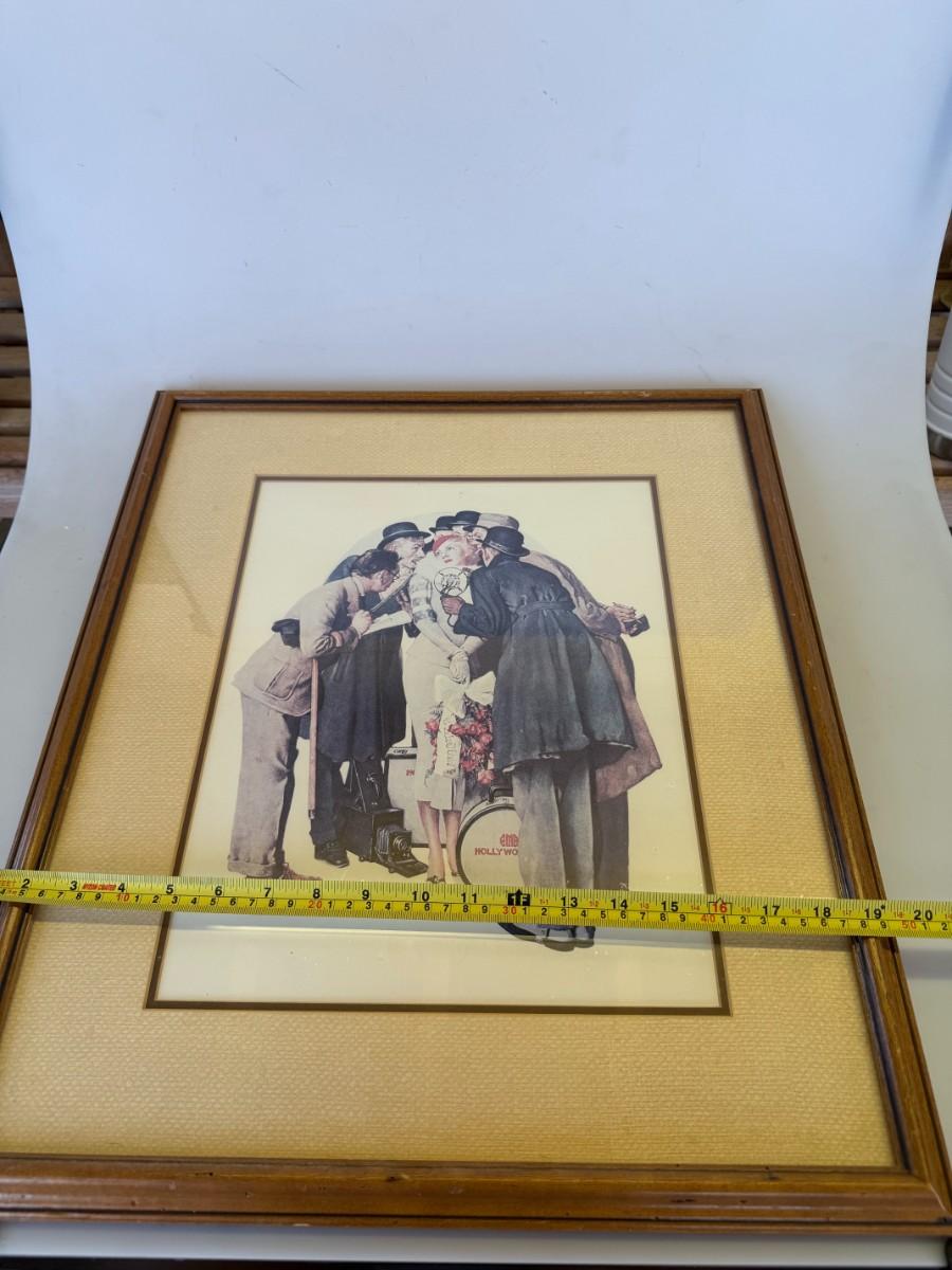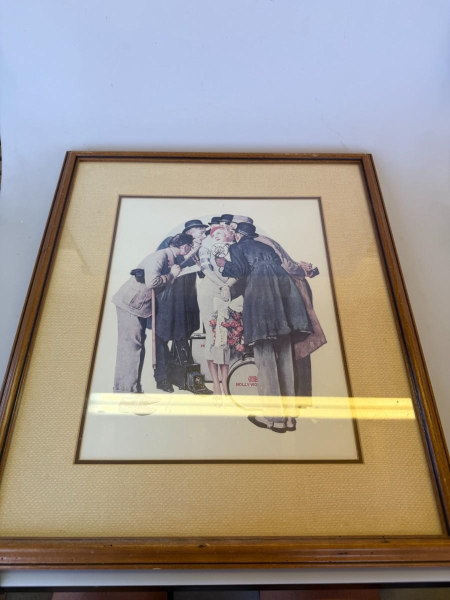 Framed color print of a group of men surrounding a young girl with a drum. Warm-toned frame and textured mat.