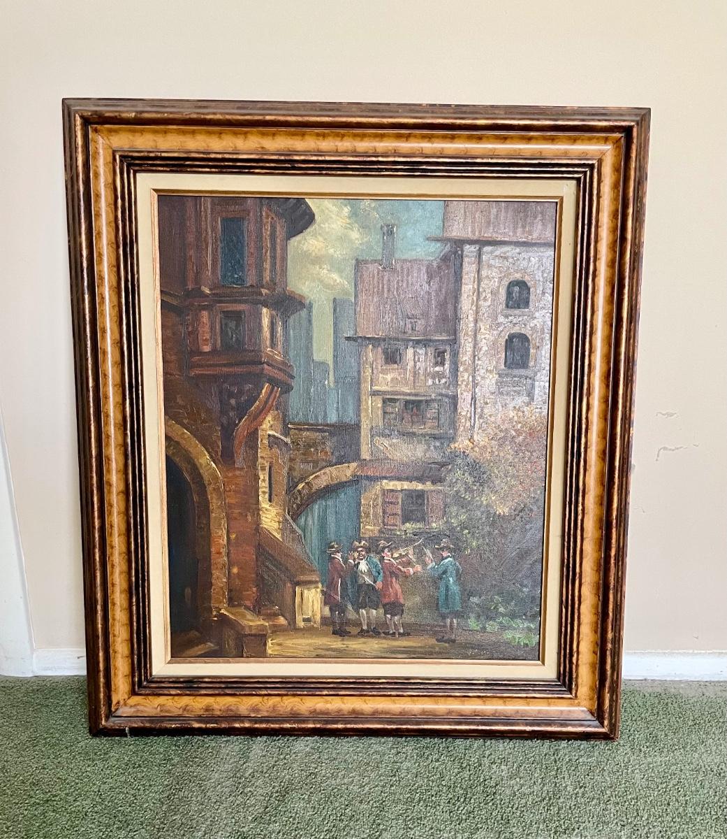 Artist unknown, depicts a street or plaza scene in 18th century Europe. Approx. 28” x 32”. Great condition.