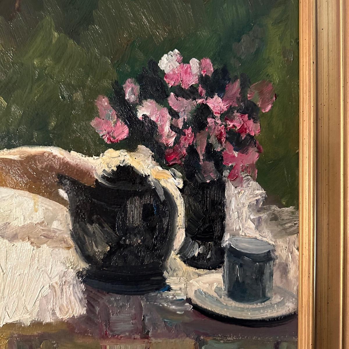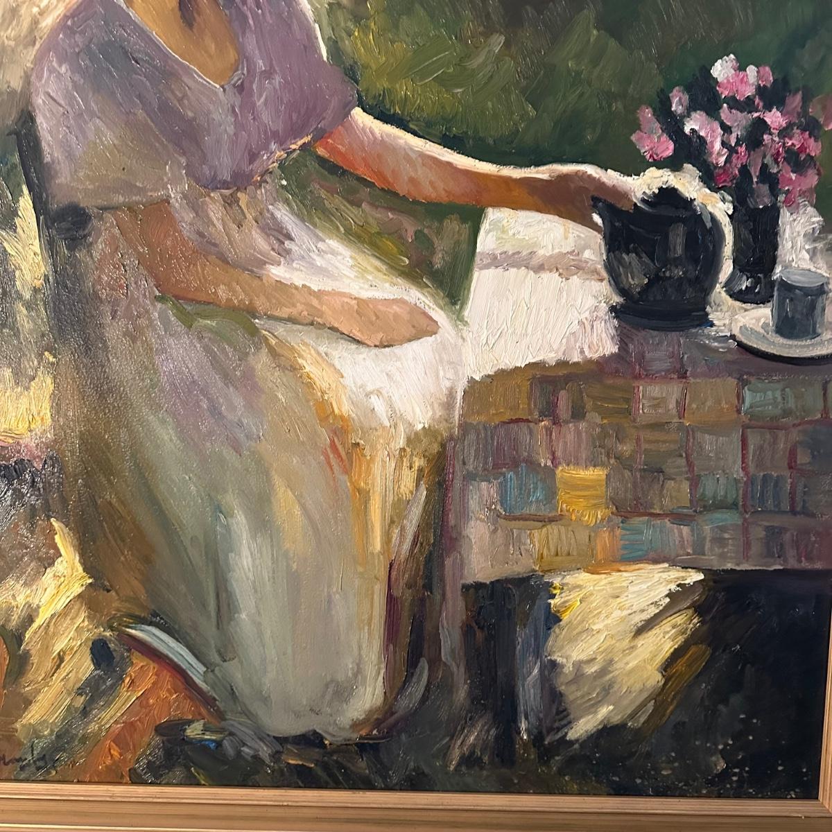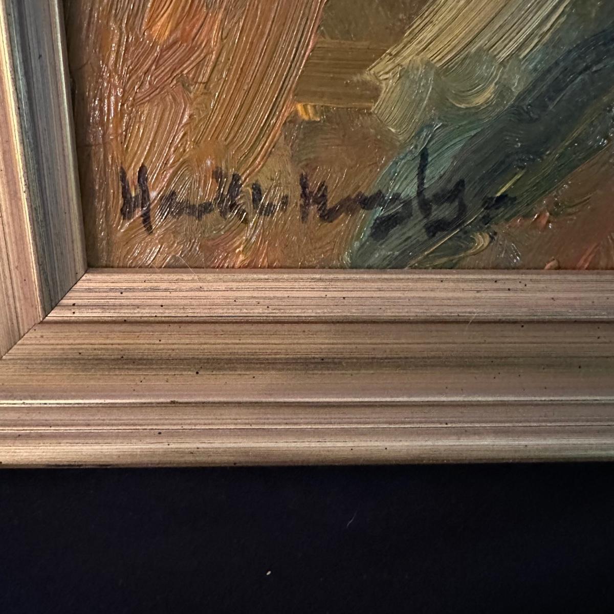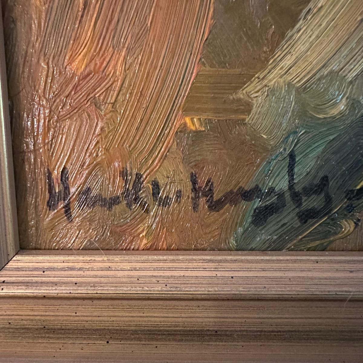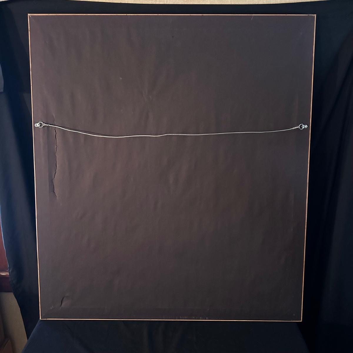 This painting appears to be oil on wood or Metal. It is in a gold tone wooden frame. The painting is signed. See photo. There are tears in the backing paper. Measures 33.5” x 37.5”H. Shipping available. Shipping art can be costly. We suggest contacting our preferred local shipping provider, Postage Express, with dimensions and getting an estimate before bidding: (828) 670-5501 or postageexpress@yahoo.com.