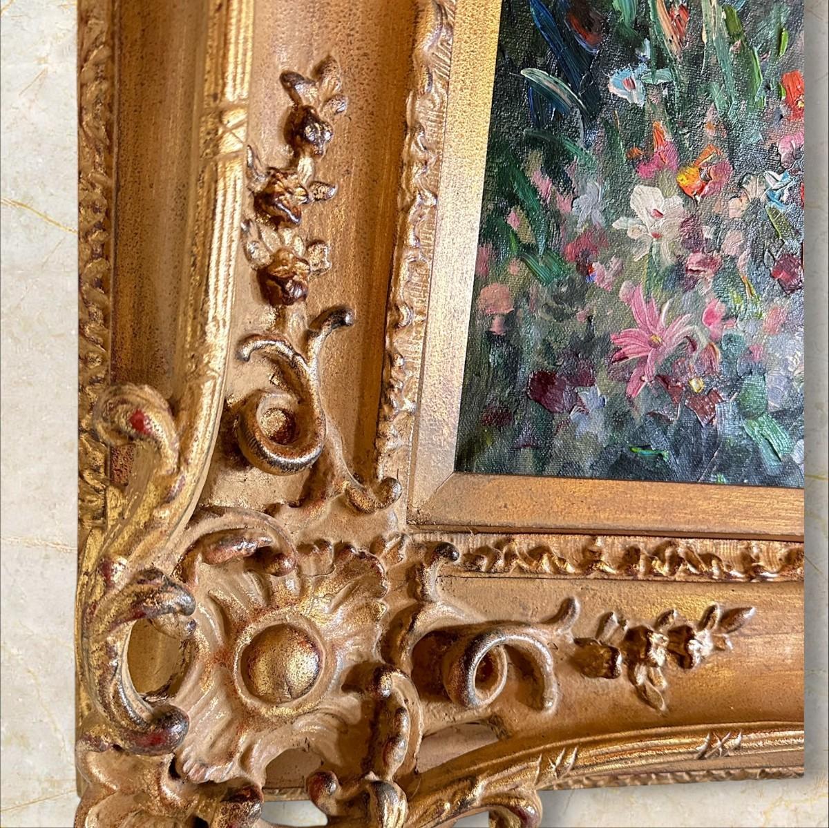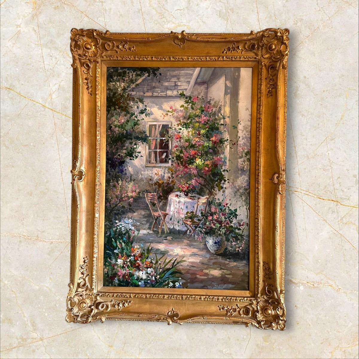 Oil Painting with Ornate Gold Frame, Garden Party/Country Cottage in Spring, Flowers
