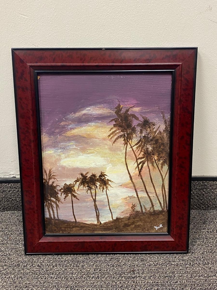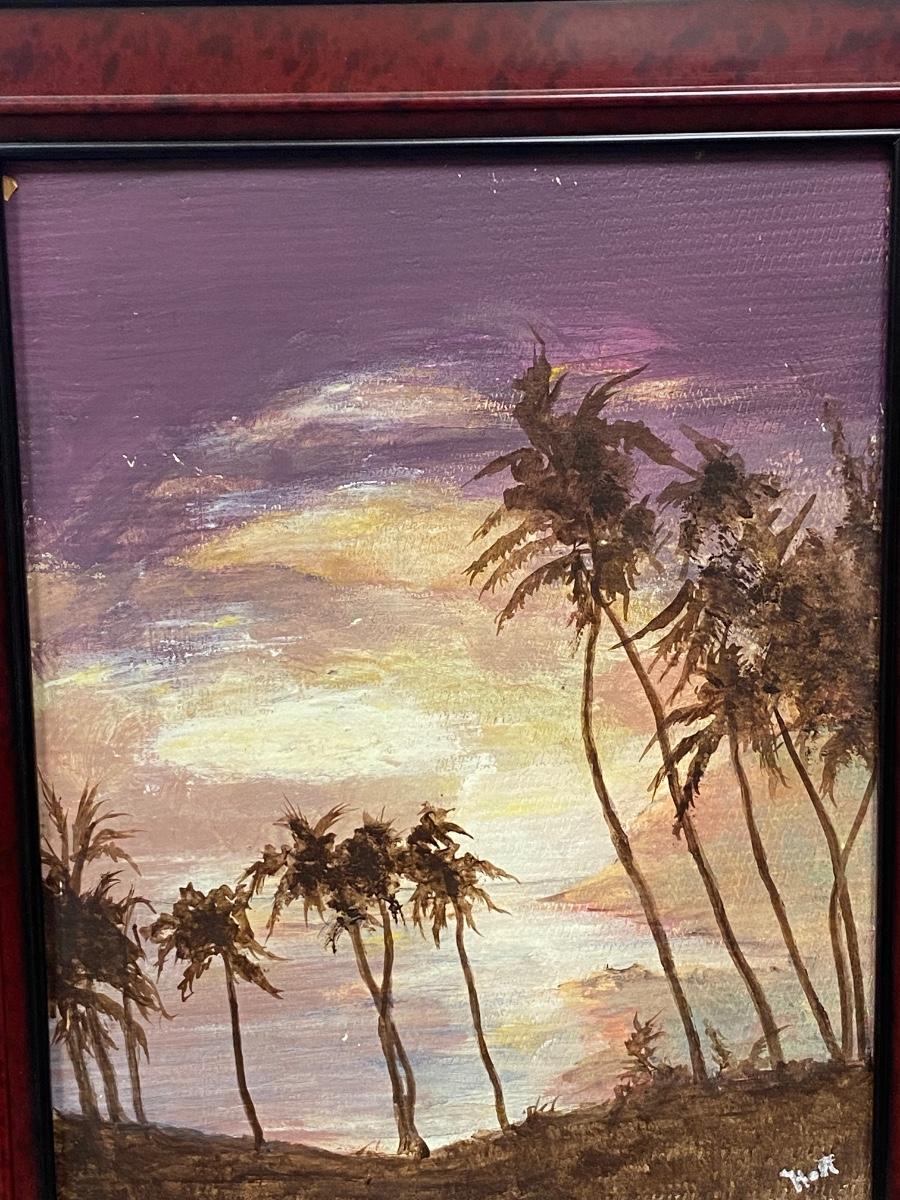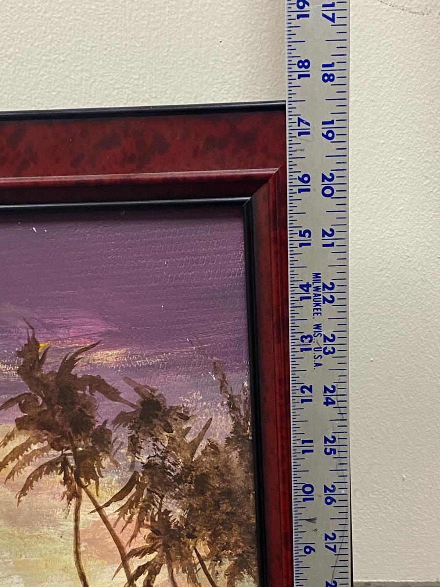 Framed painting of palm trees on beach at sunset/sunrise. Looks to be oil on masonite. Framed size is about 17"x14".