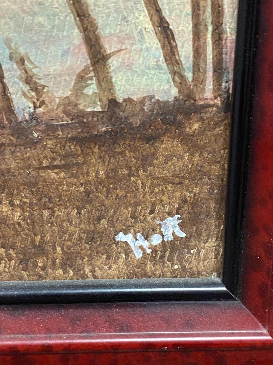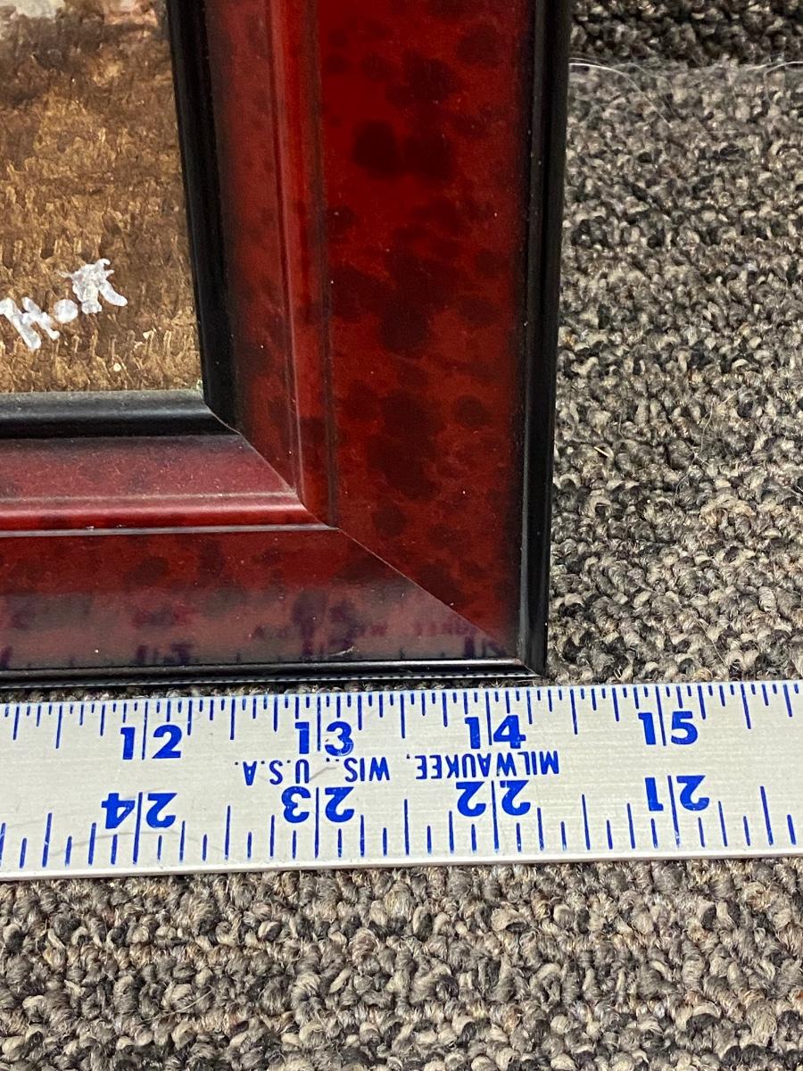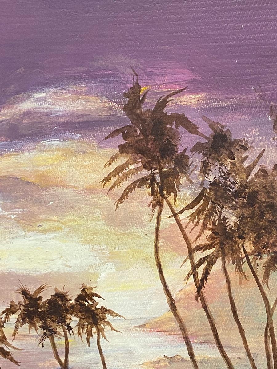 Framed painting of palm trees on beach at sunset/sunrise. Looks to be oil on masonite. Framed size is about 17"x14".