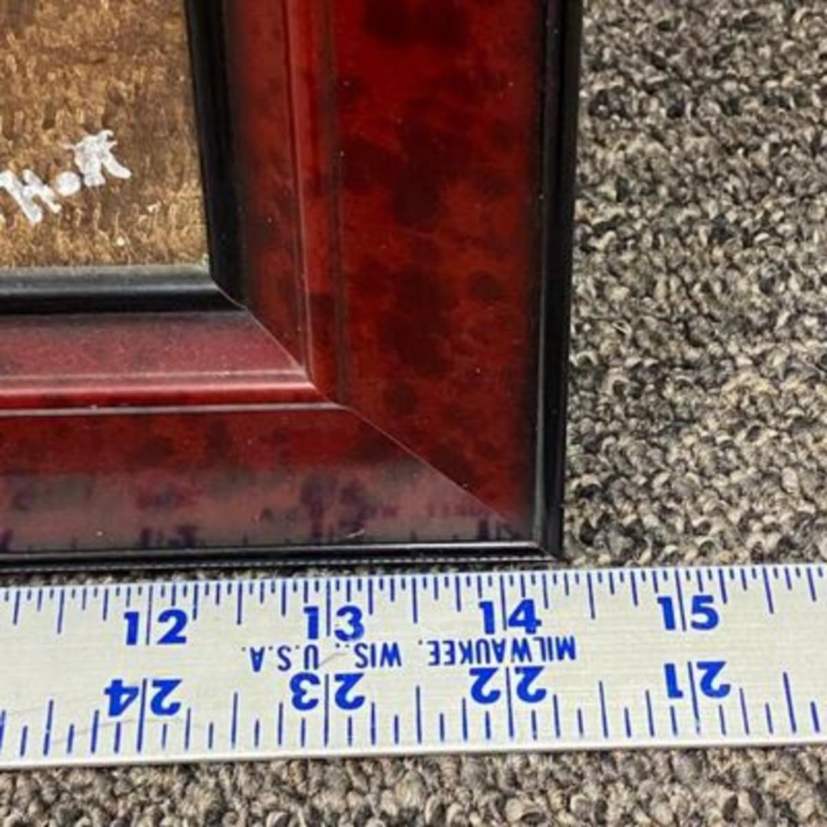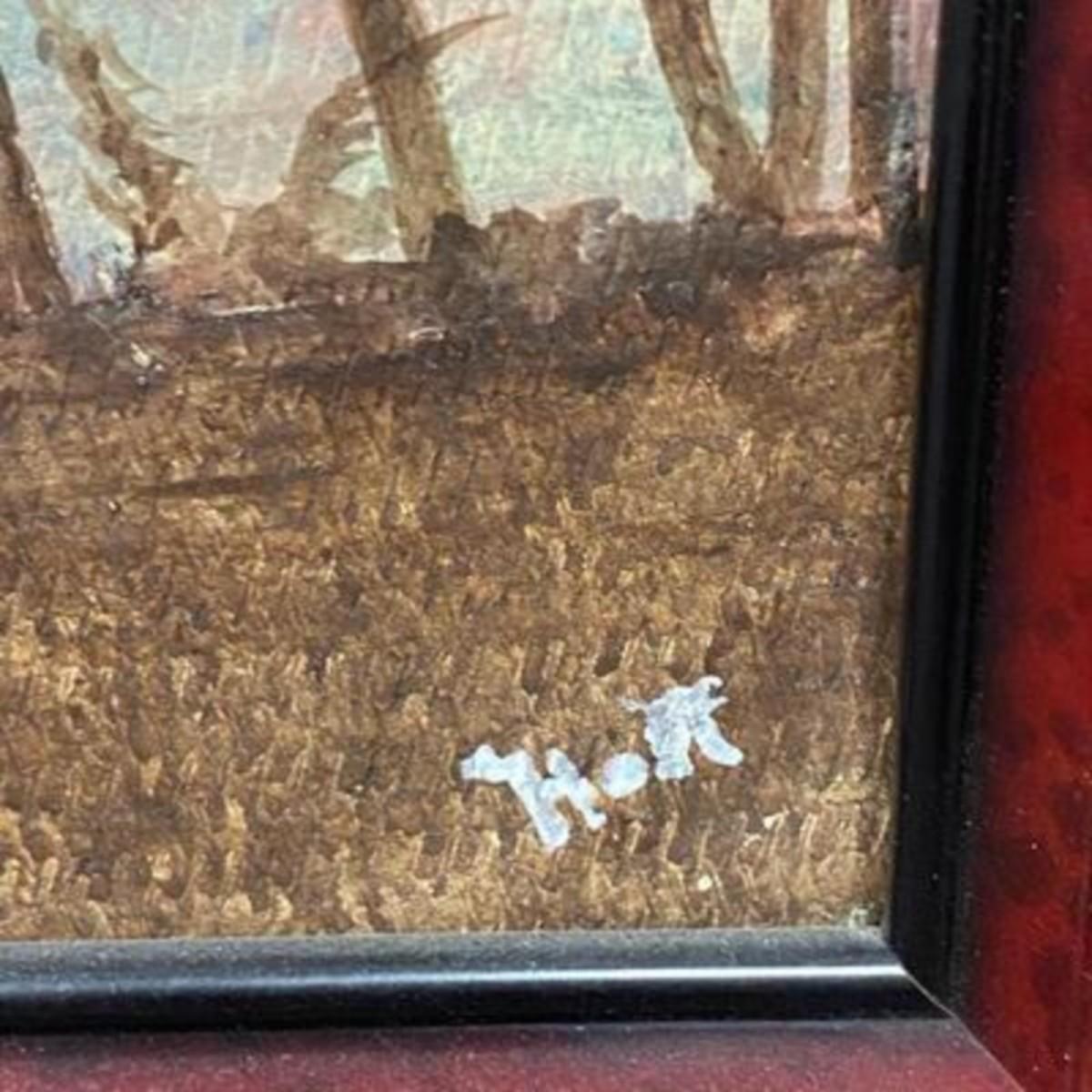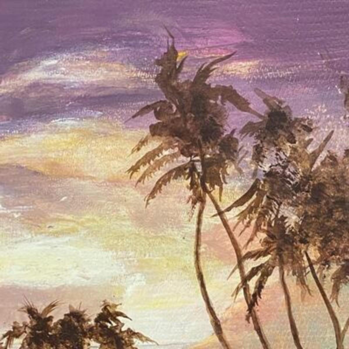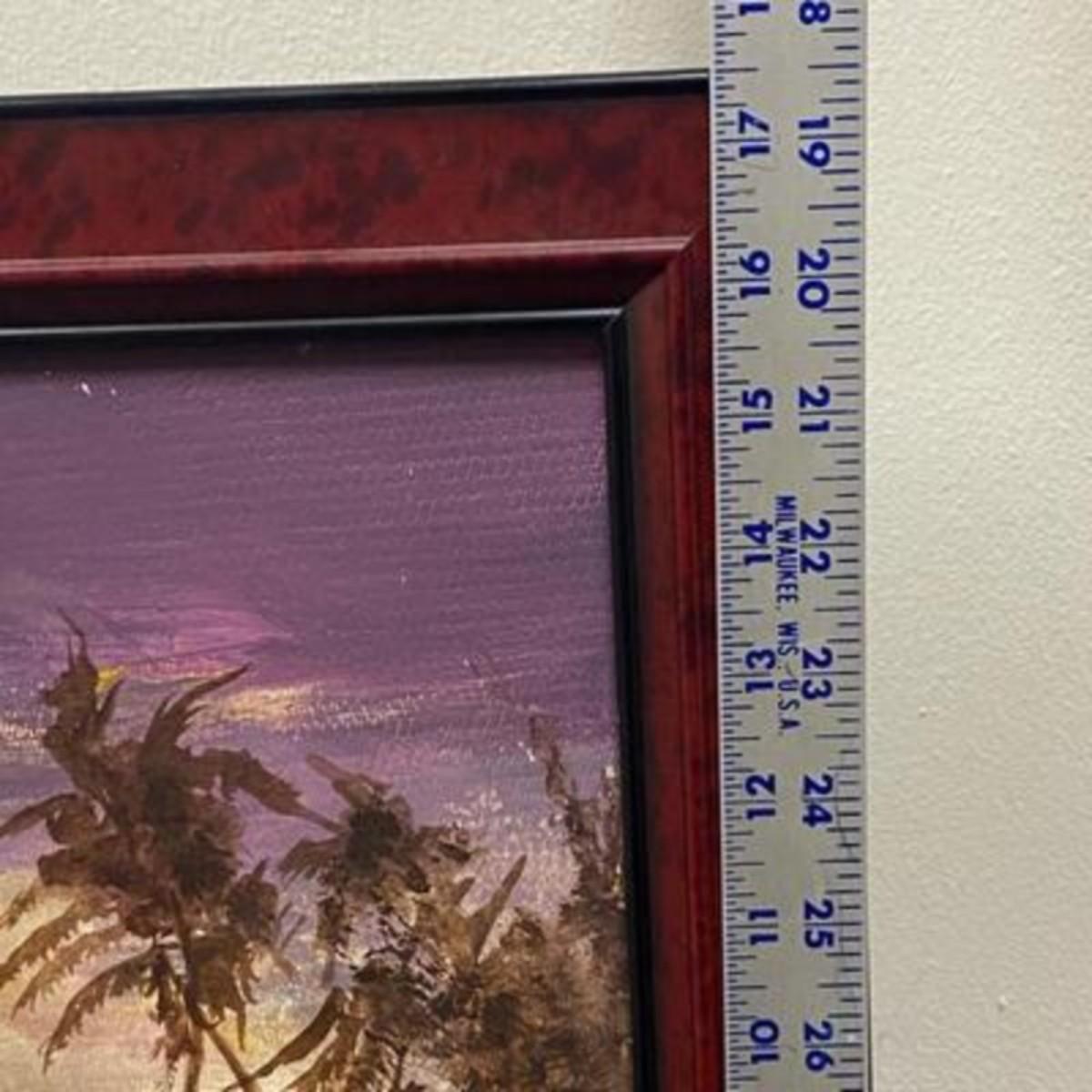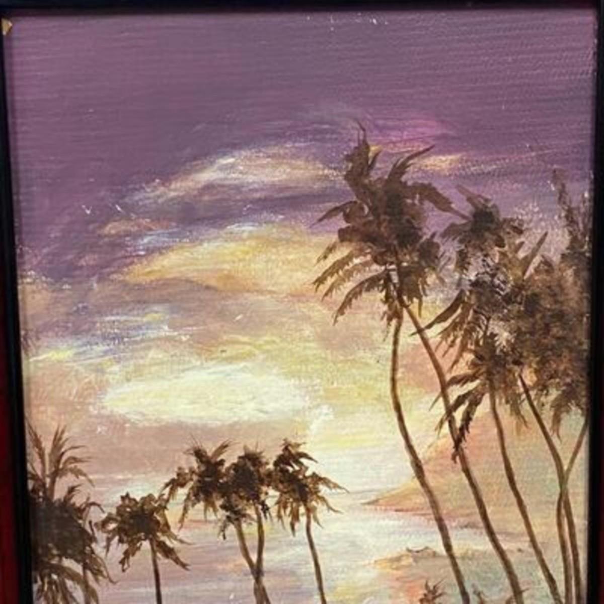 Framed painting of palm trees on beach at sunset/sunrise. Looks to be oil on masonite. Framed size is about 17"x14".