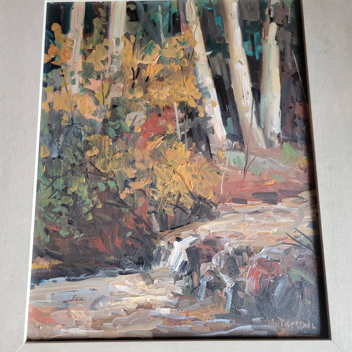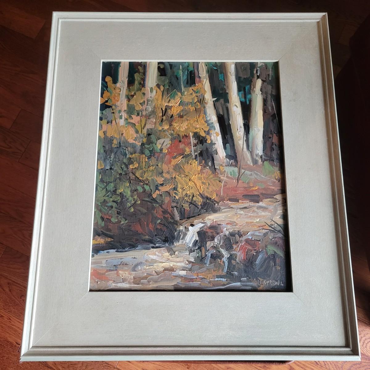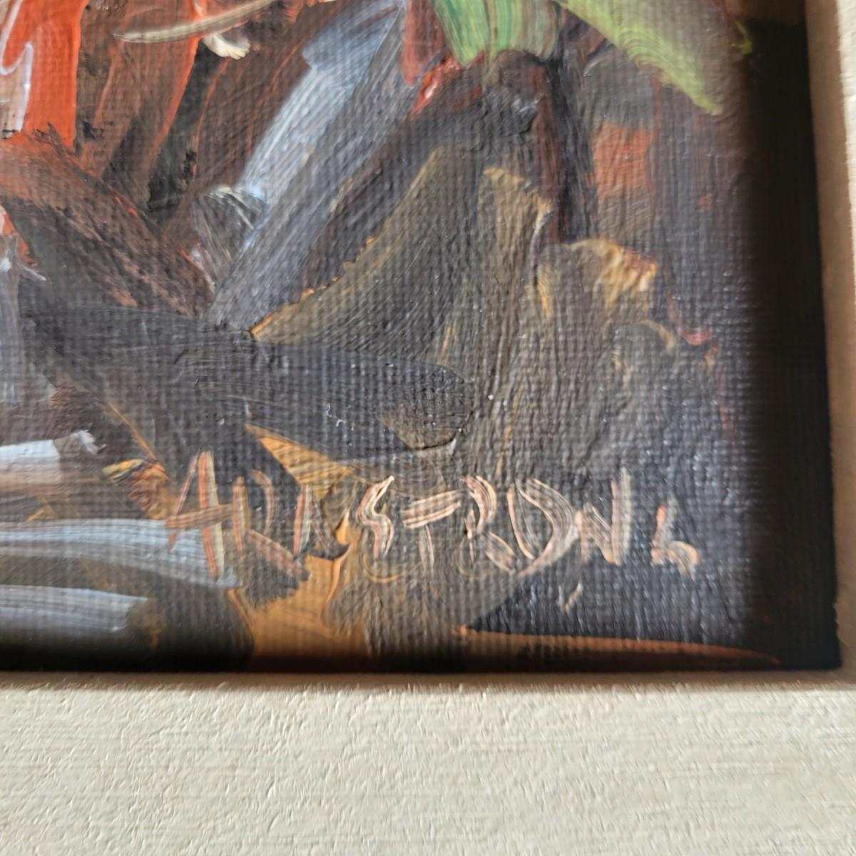 An original acrylic painting on canvas board by David Armstrong. It depicts a colorful woodland scene with a 5" mat/wooden frame that has a rustic grey finish. It measures approximately 25" x 1.5" x 29"H. Shipping available. Shipping art can be costly. We suggest contacting our preferred local shipping provider, Postage Express, with dimensions and getting an estimate before bidding: (828) 670-5501 or postageexpress@yahoo.com.
