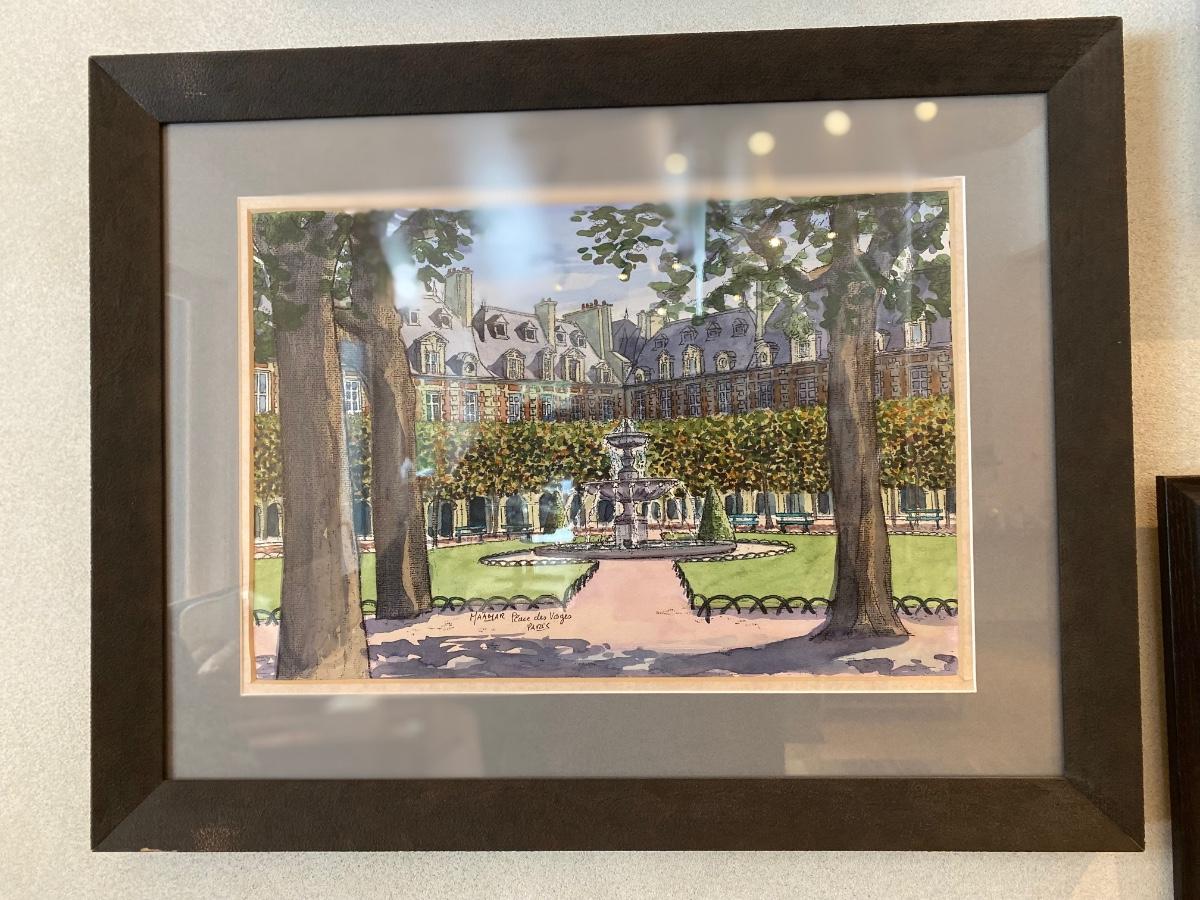 Original watercolor by French artist. Of Place des Voges in Paris, France. Professionally frame.