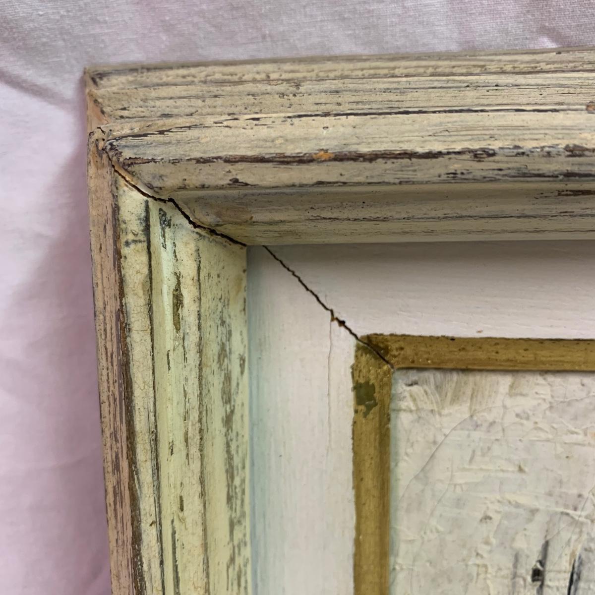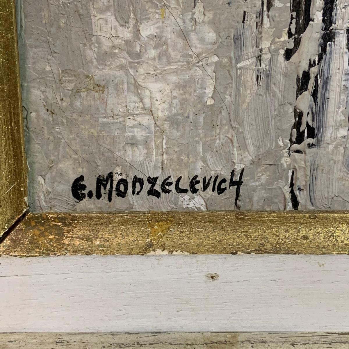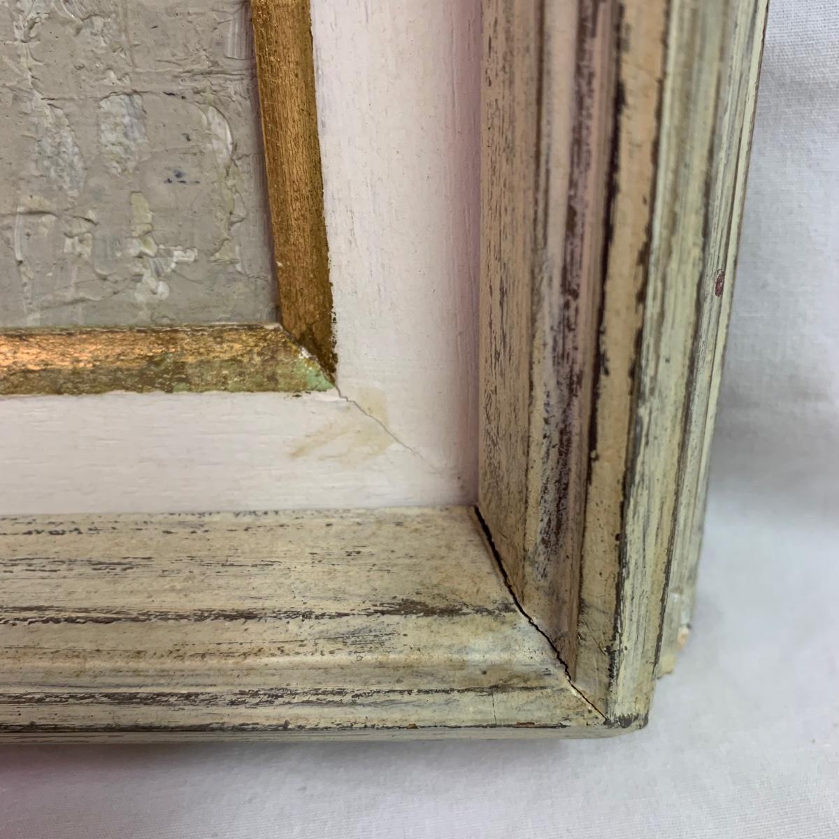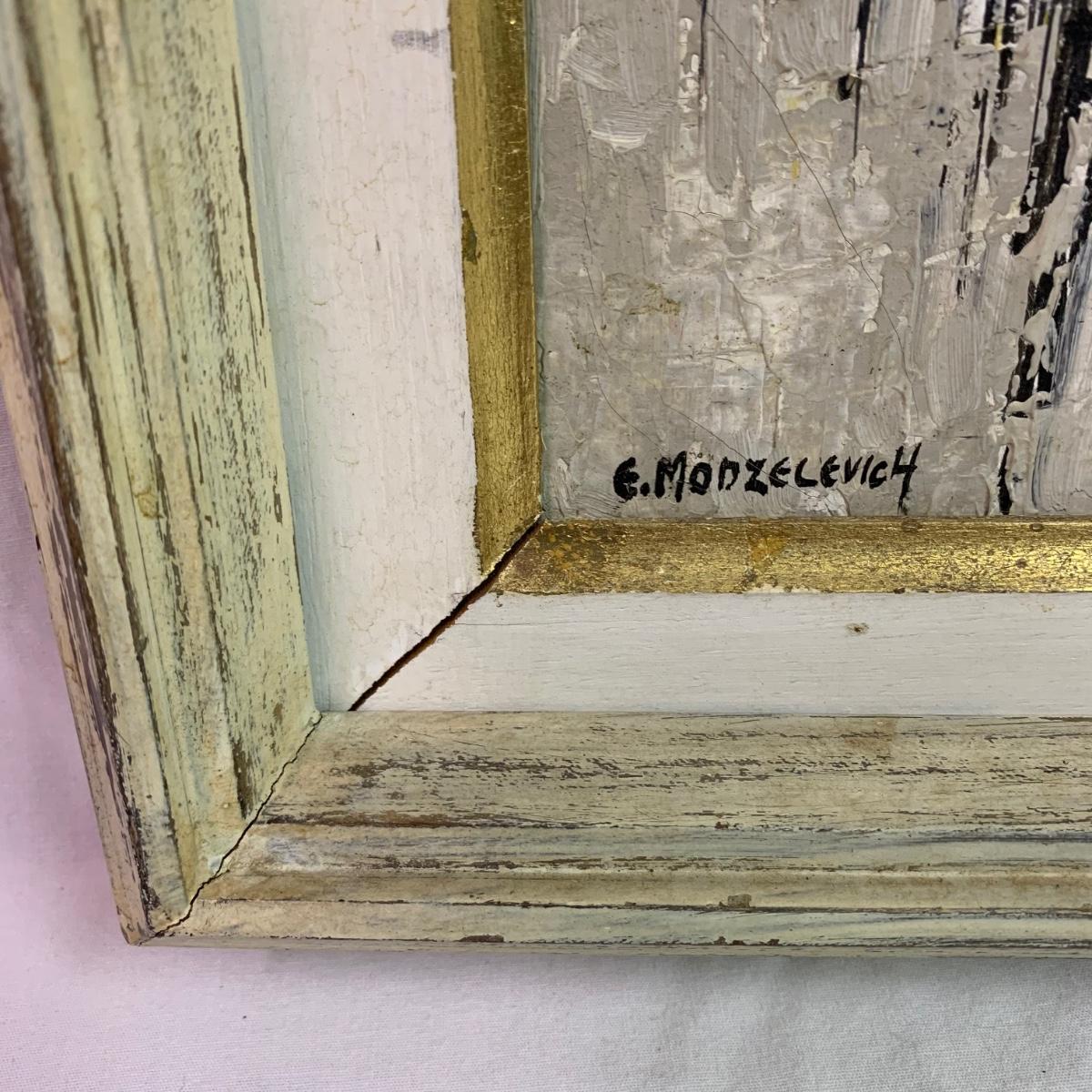 Framed original oil on canvas by Israeli postwar and contemporary painter, Efraim Modzelevich. Frame is distressed and painted wood with white matte and gold painted trim. Piece is signed, “E. Modzelevich”. Please note, there is a bit of cracking at the corners of matte and a small bit of discoloration on the bottom right corner. See photos for more details. Piece measures 17” x 2” x 12”H.