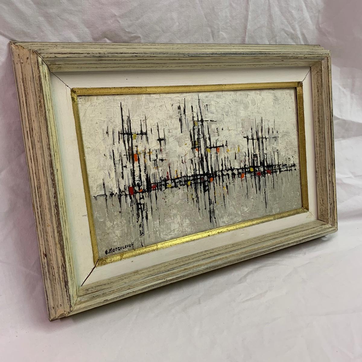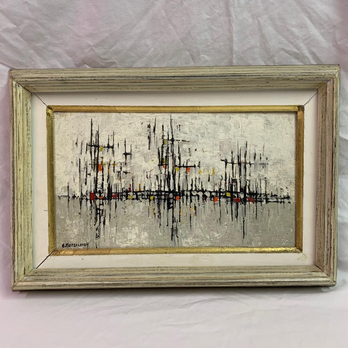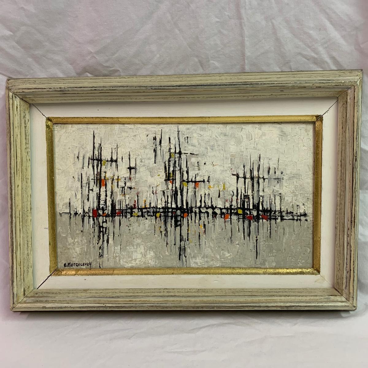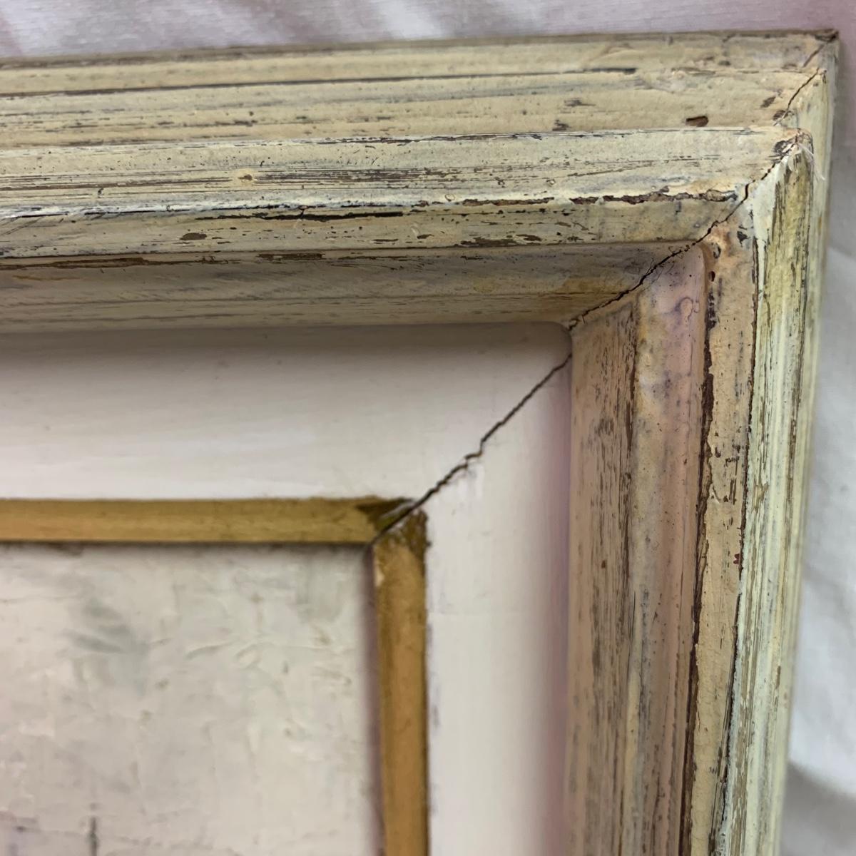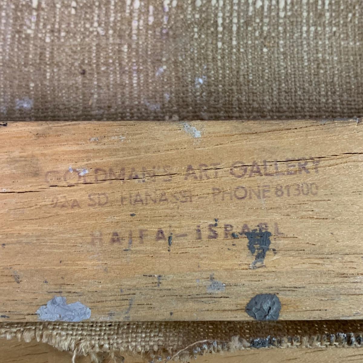 Framed original oil on canvas by Israeli postwar and contemporary painter, Efraim Modzelevich. Frame is distressed and painted wood with white matte and gold painted trim. Piece is signed, “E. Modzelevich”. Please note, there is a bit of cracking at the corners of matte and a small bit of discoloration on the bottom right corner. See photos for more details. Piece measures 17” x 2” x 12”H.