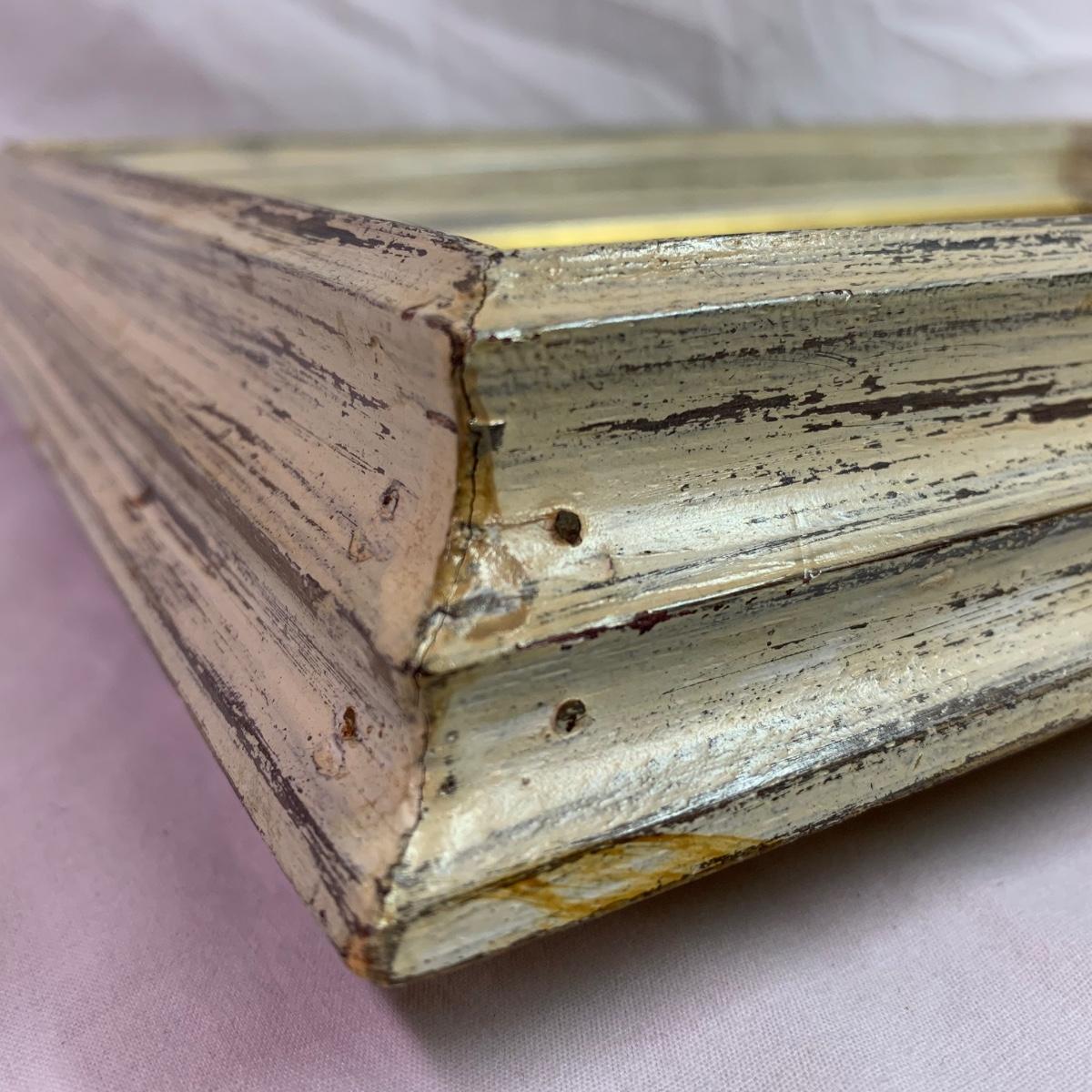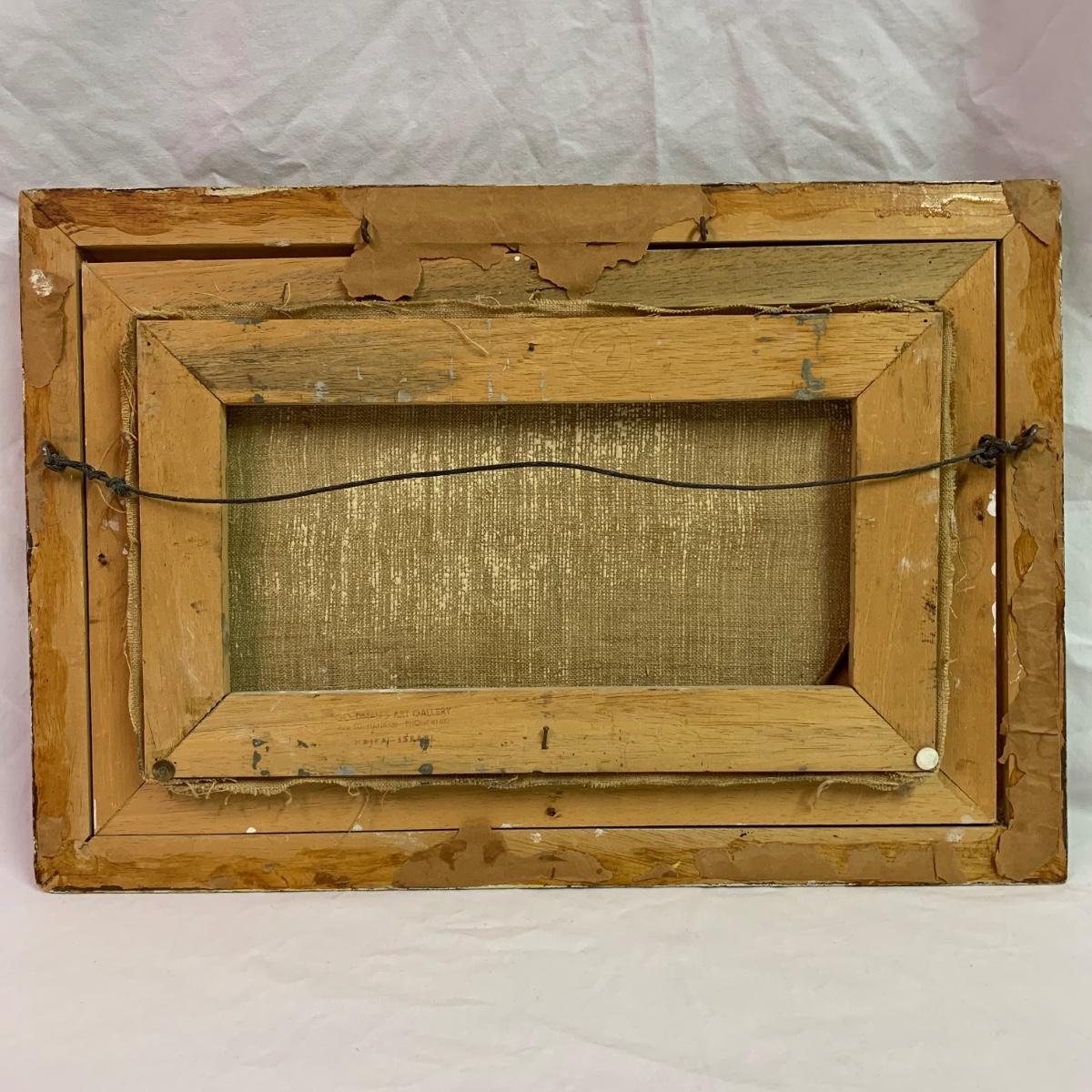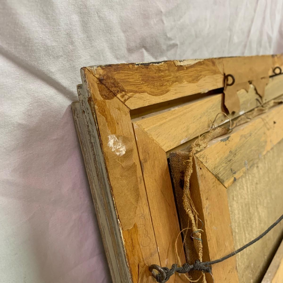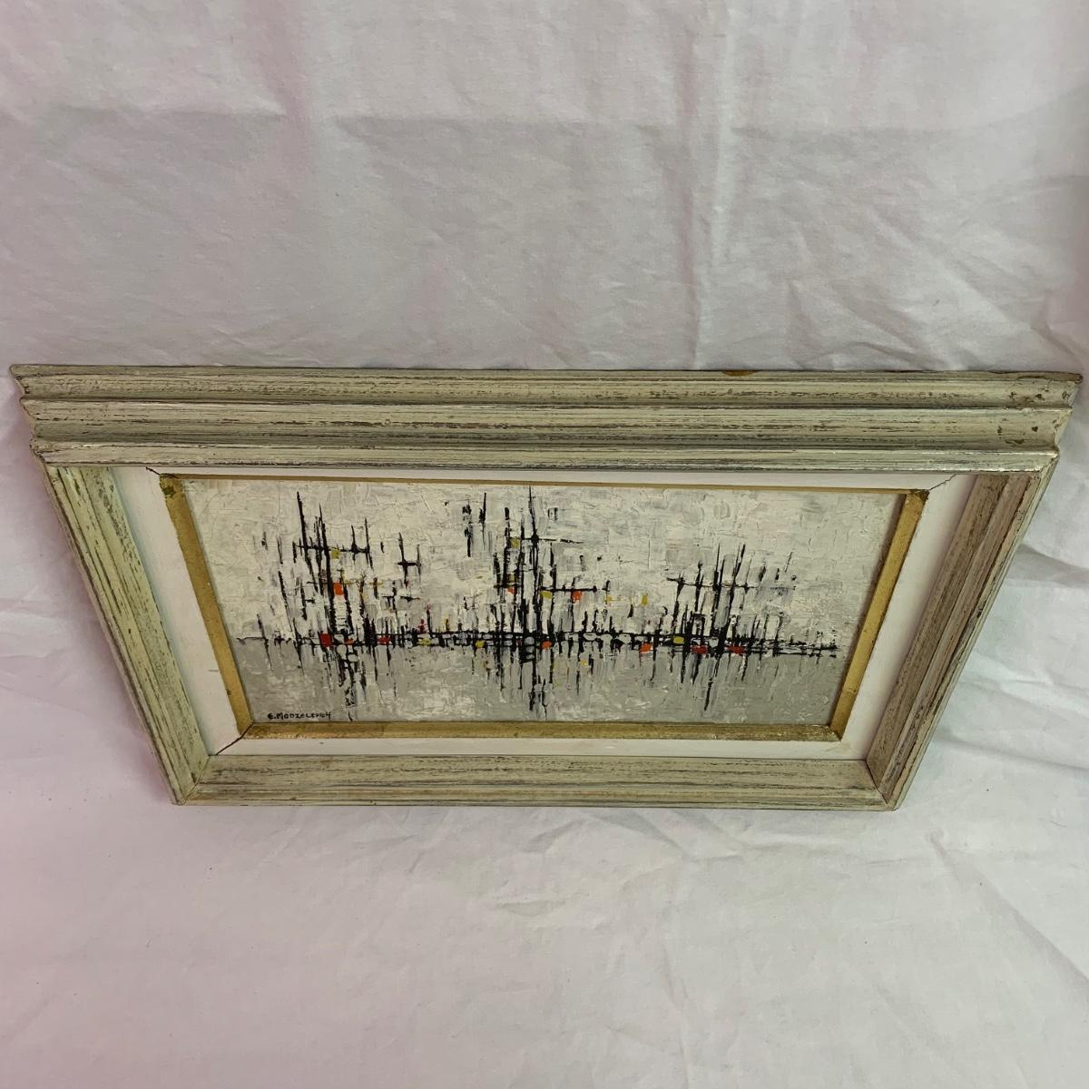 Framed original oil on canvas by Israeli postwar and contemporary painter, Efraim Modzelevich. Frame is distressed and painted wood with white matte and gold painted trim. Piece is signed, “E. Modzelevich”. Please note, there is a bit of cracking at the corners of matte and a small bit of discoloration on the bottom right corner. See photos for more details. Piece measures 17” x 2” x 12”H.