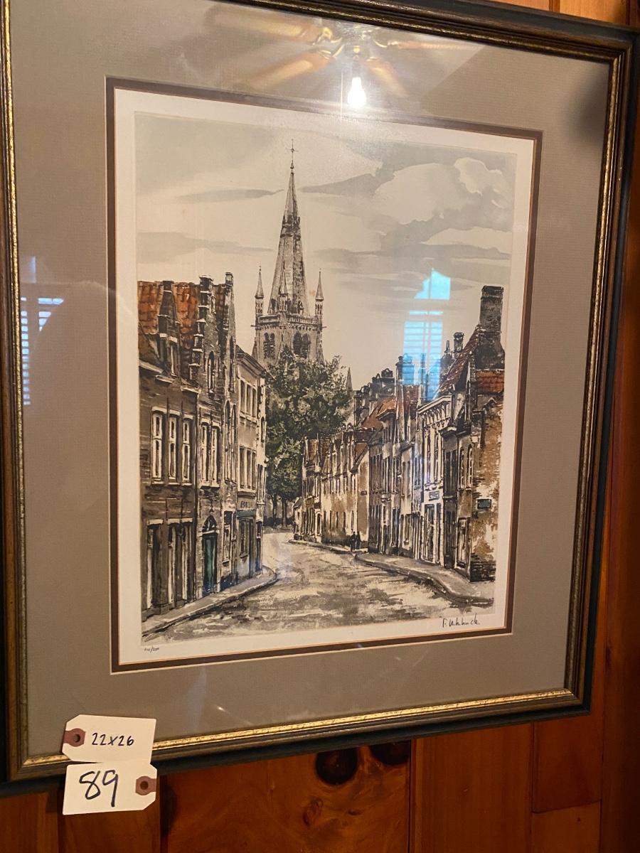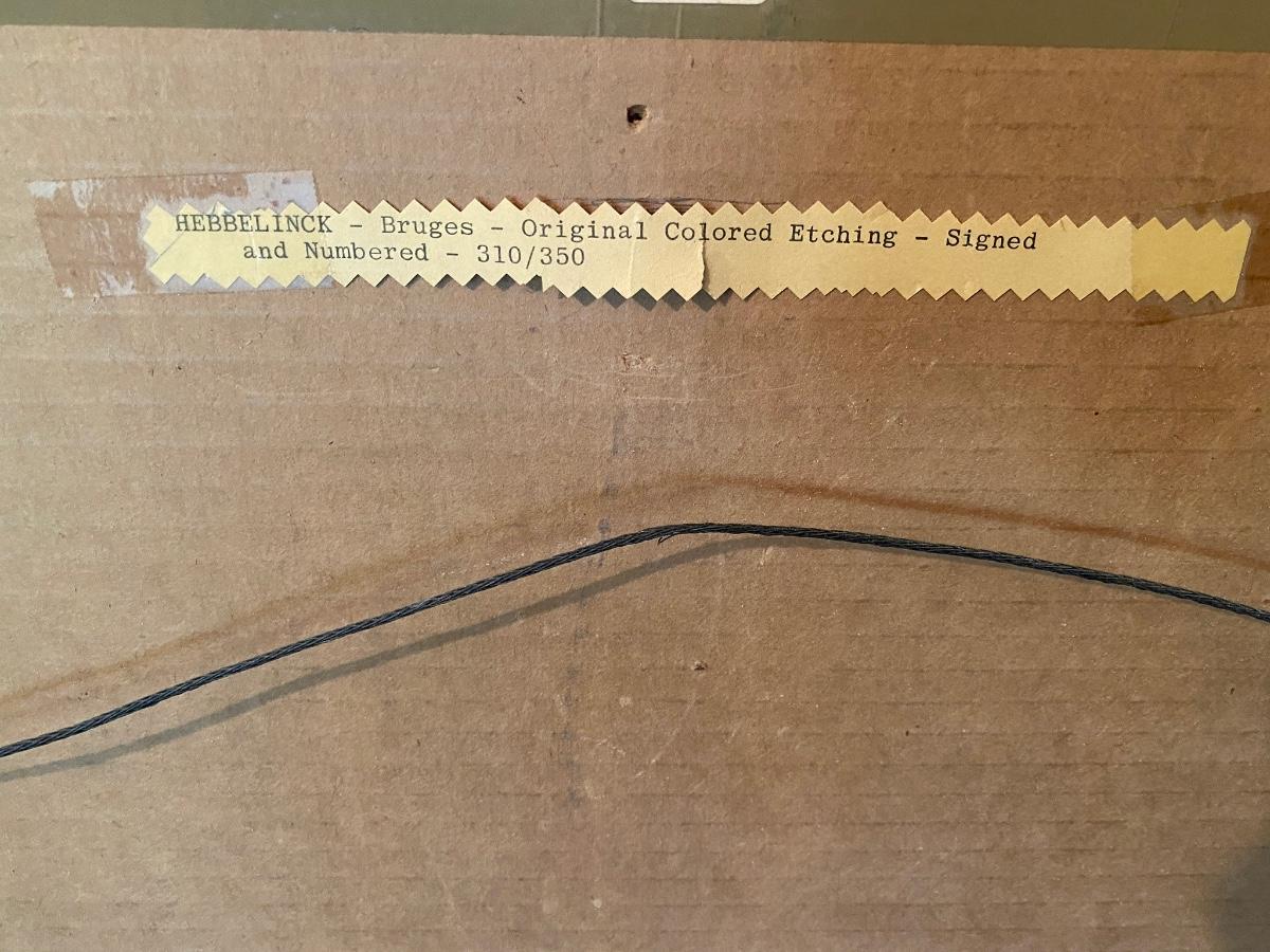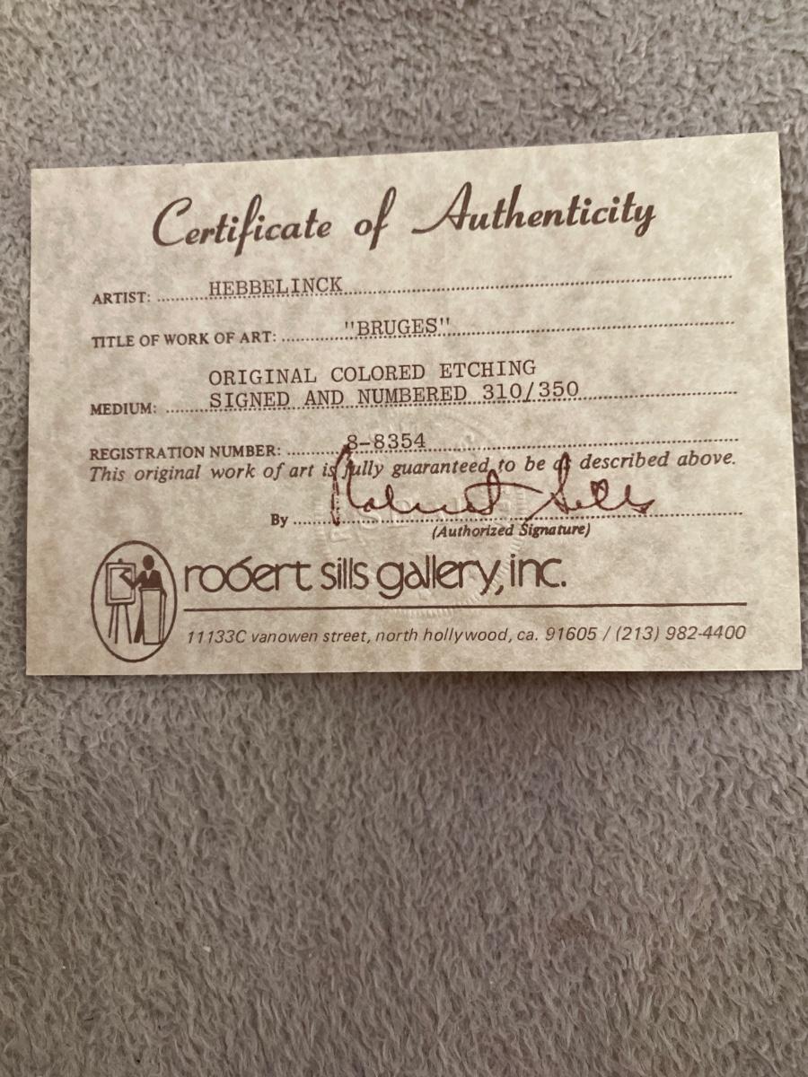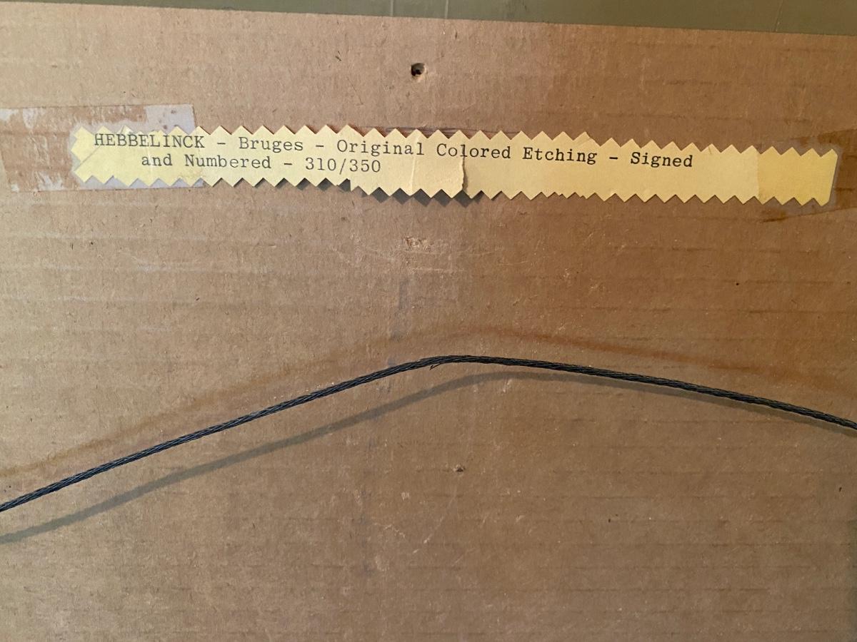 Framed Original Colored Etching Hebbelinck-Bruges 22x26 includes certificate of authenticity