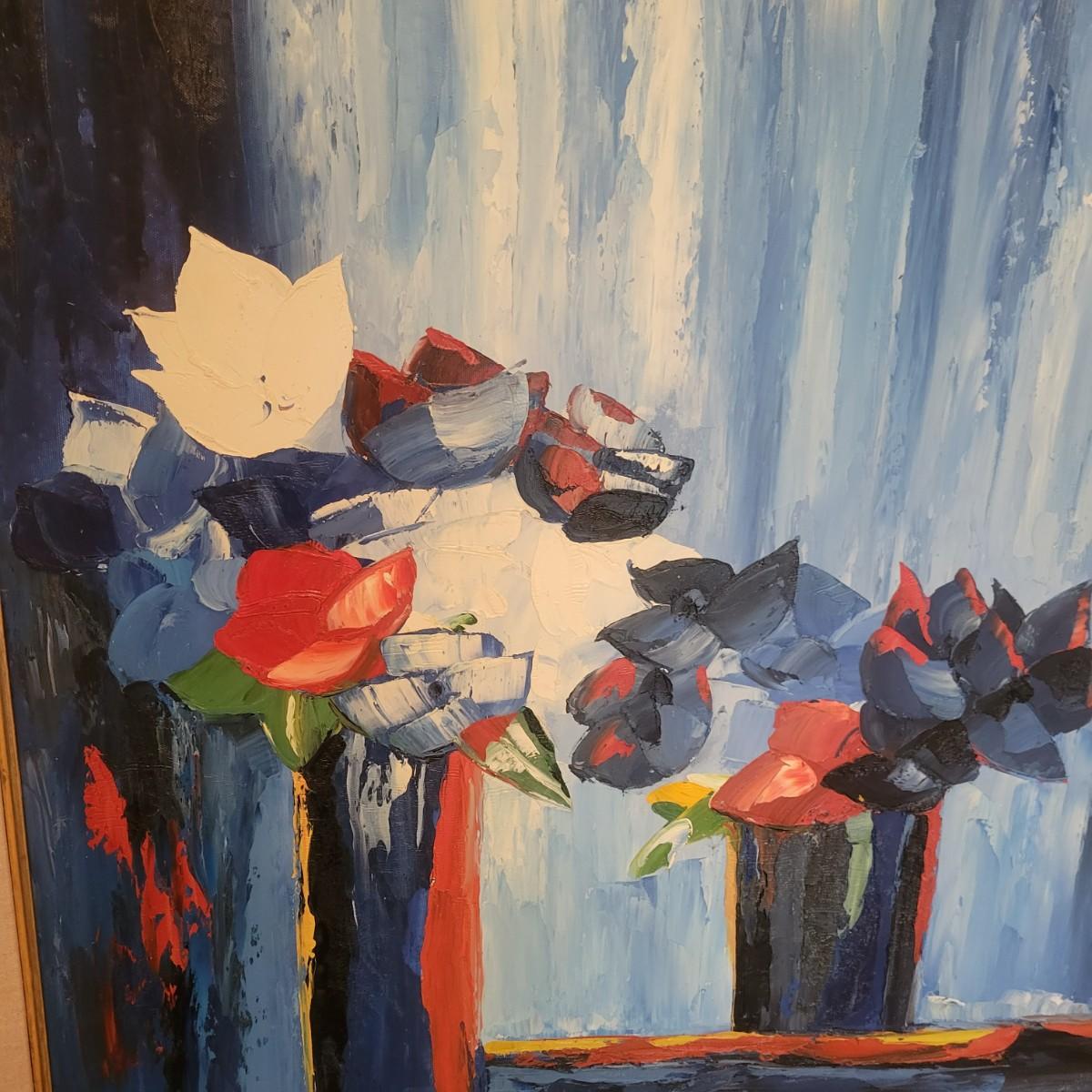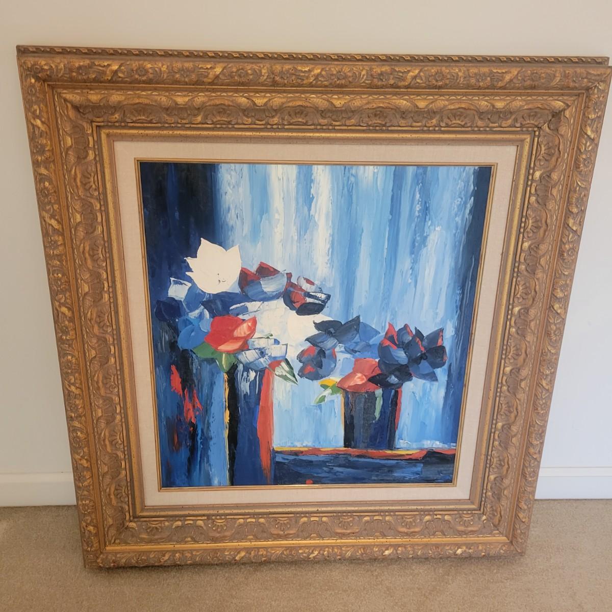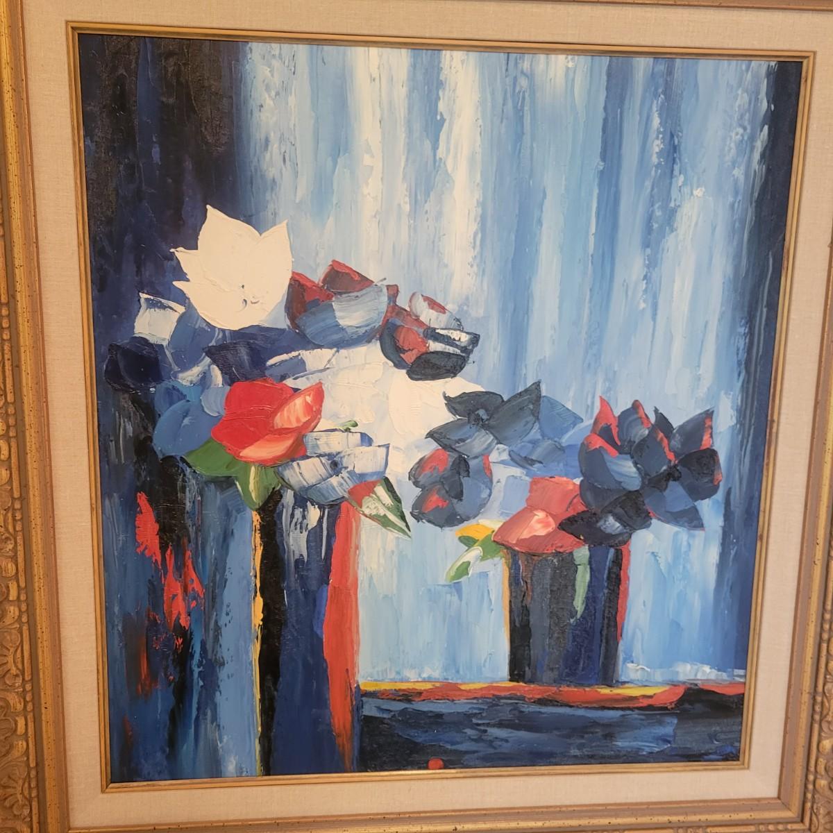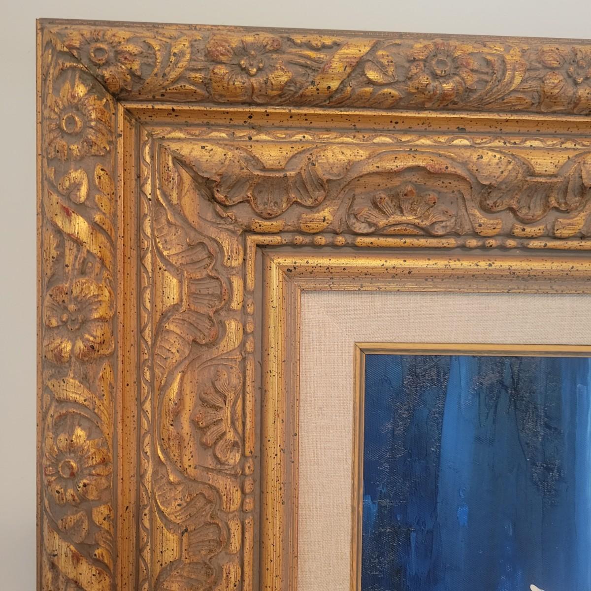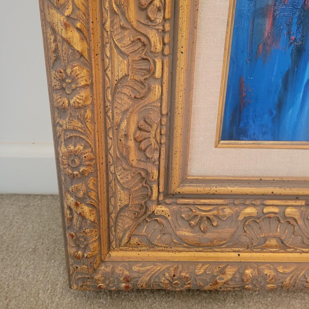 A modern original oil painting still life that features rich blues and reds. This piece has a large, wooden ornate gold frame with a linen liner. It measures approximately 34.5" x 3" x 36.5"H. Shipping available. Shipping art can be costly. We suggest contacting our preferred local shipping provider, Postage Express, with dimensions and getting an estimate before bidding: (828) 670-5501 or postageexpress@yahoo.com.