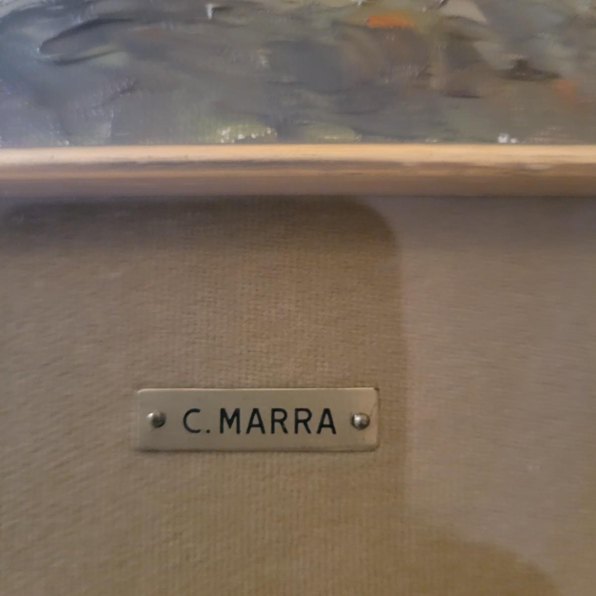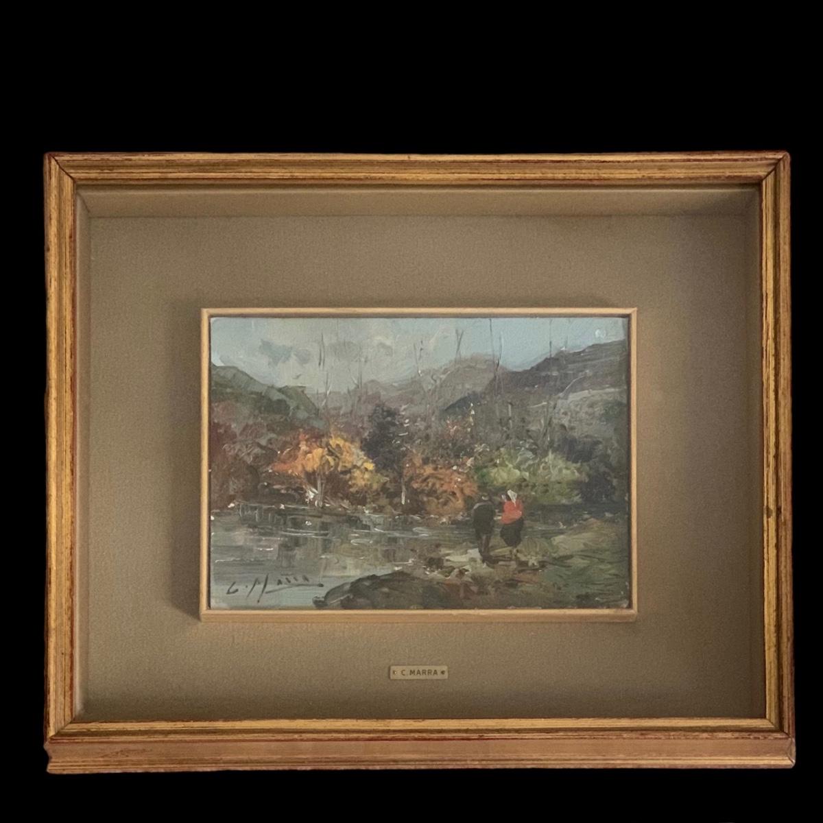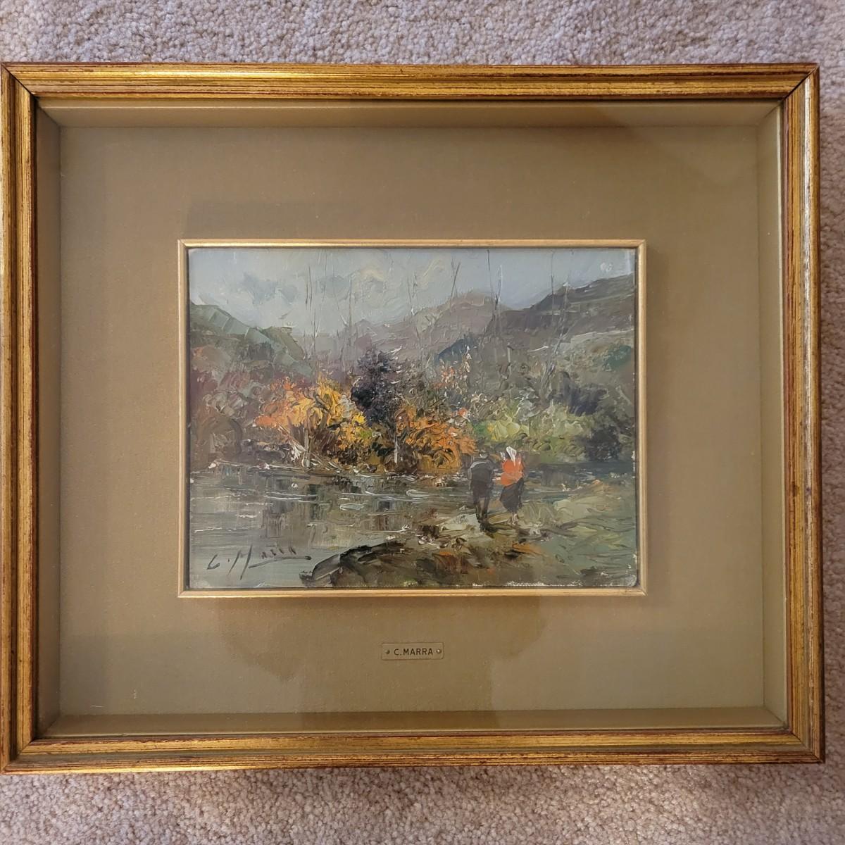 A framed original oil painting by Claudio Marra. This impressionism landscape appears to be painted on a canvas board and is signed in the lower left corner. The oil is framed in a shadow box style with a gold fillet encasing the painting with a gold/green mat and spacers. Frame is made of wood with a gold leaf finish and measures approximately 14" x 1.5" x 12"H. Shipping available. Shipping art can be costly. We suggest contacting our preferred local shipping provider, Postage Express, with dimensions and getting an estimate before bidding: (828) 670-5501 or postageexpress@yahoo.com.