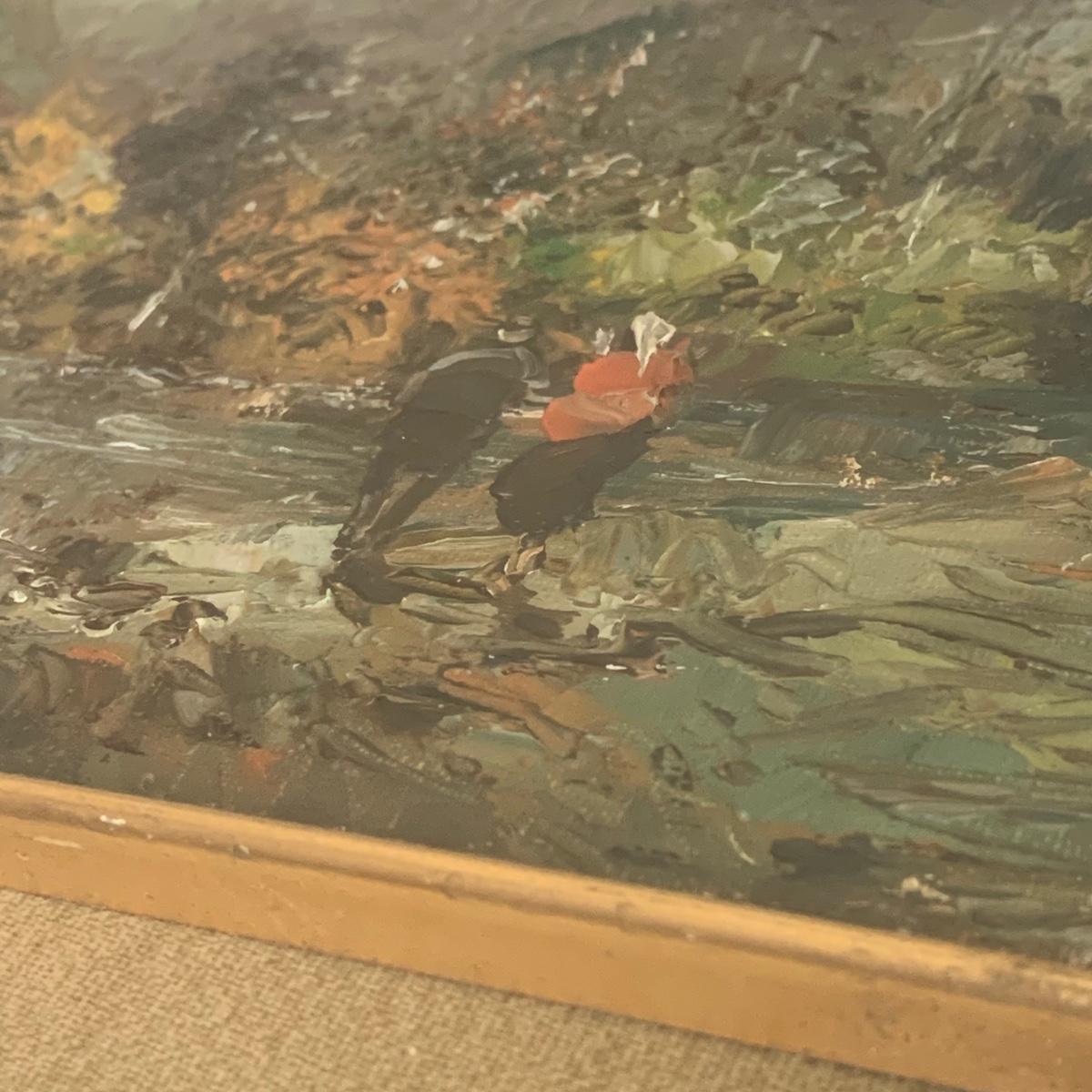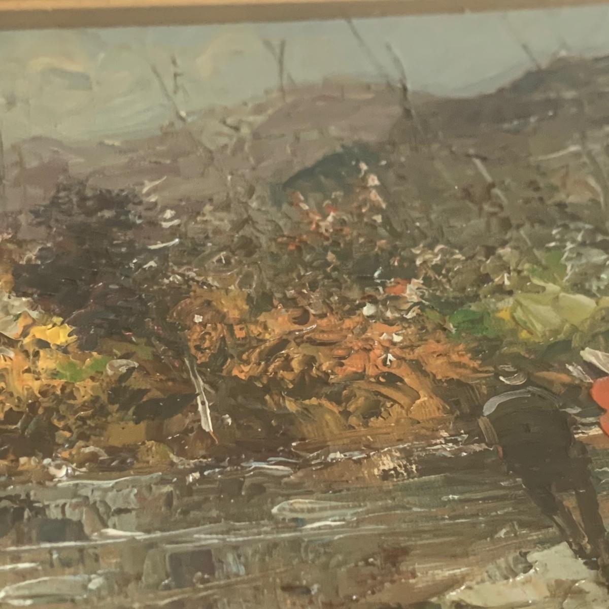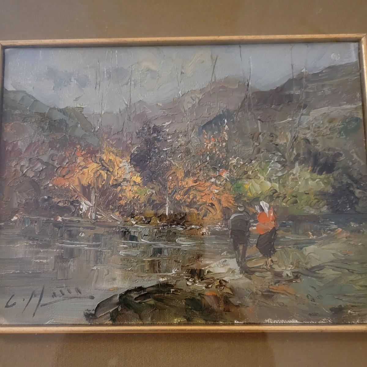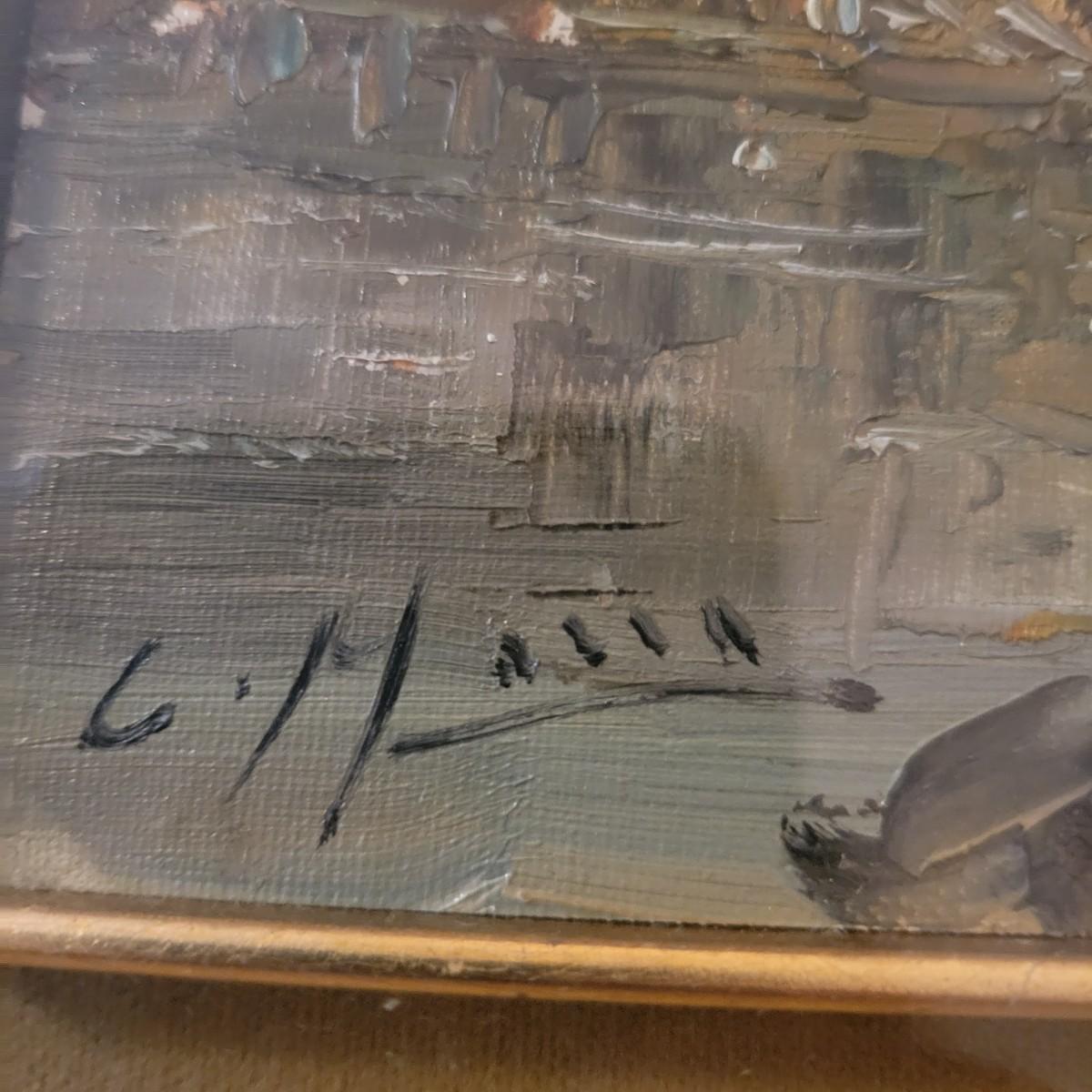 A framed original oil painting by Claudio Marra. This impressionism landscape appears to be painted on a canvas board and is signed in the lower left corner. The oil is framed in a shadow box style with a gold fillet encasing the painting with a gold/green mat and spacers. Frame is made of wood with a gold leaf finish and measures approximately 14" x 1.5" x 12"H. Shipping available. Shipping art can be costly. We suggest contacting our preferred local shipping provider, Postage Express, with dimensions and getting an estimate before bidding: (828) 670-5501 or postageexpress@yahoo.com.