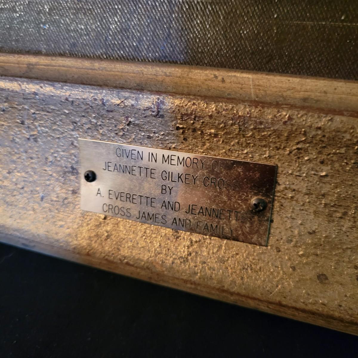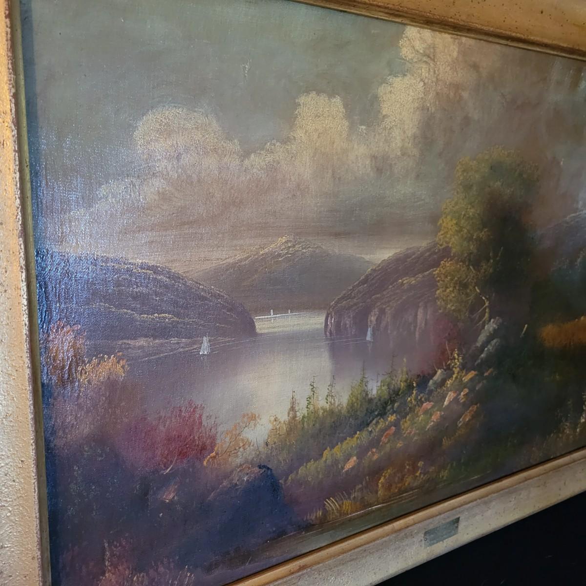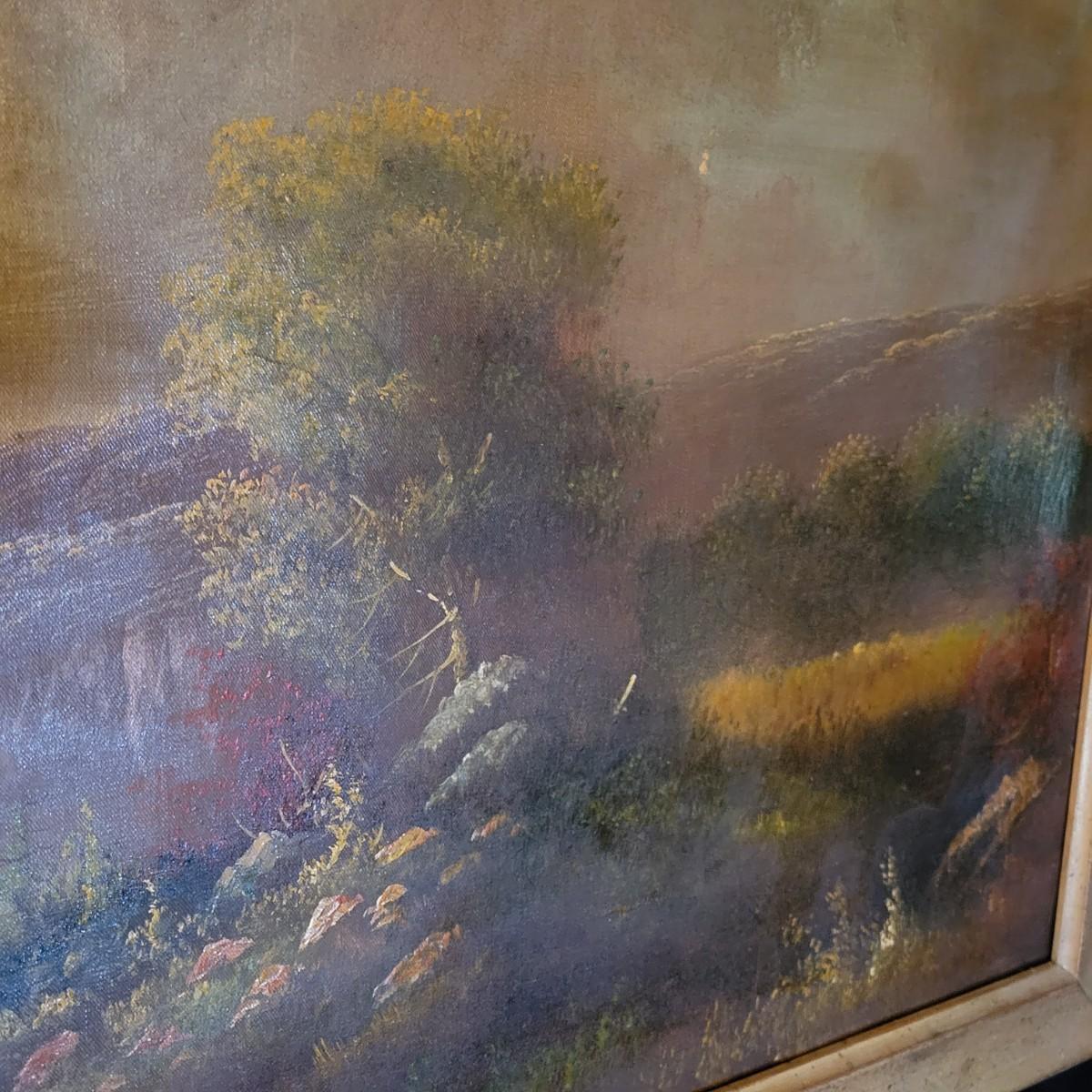 An original oil painting of a landscape in a solid wood frame that has a distressed gold finish. The painting is unsigned, but has a pencil note on the back saying it is part of the James Collection. Measures approximately 41.5" x 27.5"H. Shipping available. Shipping art can be costly. We suggest contacting our preferred local shipping provider, Postage Express, with dimensions and getting an estimate before bidding: (828) 670-5501 or postageexpress@yahoo.com.