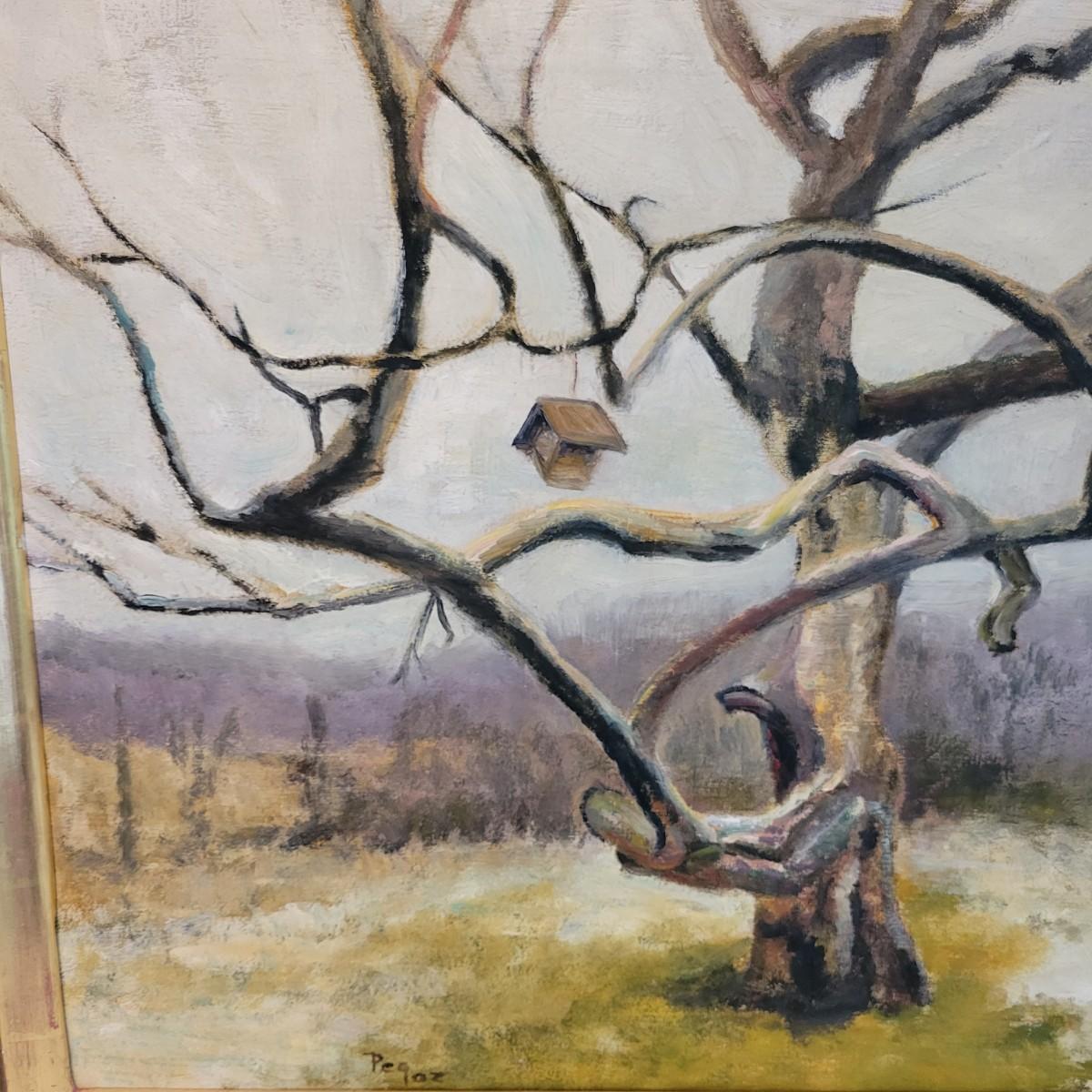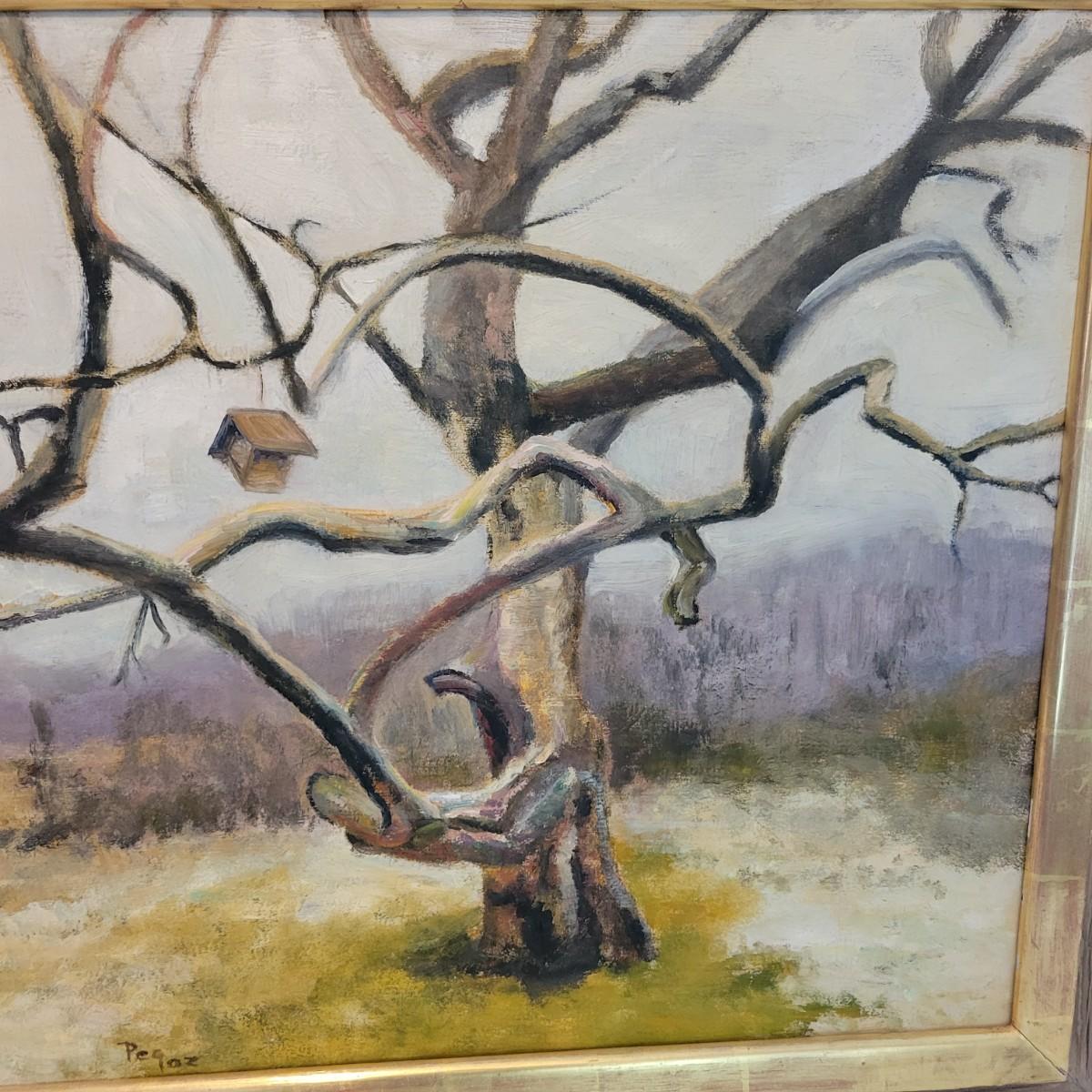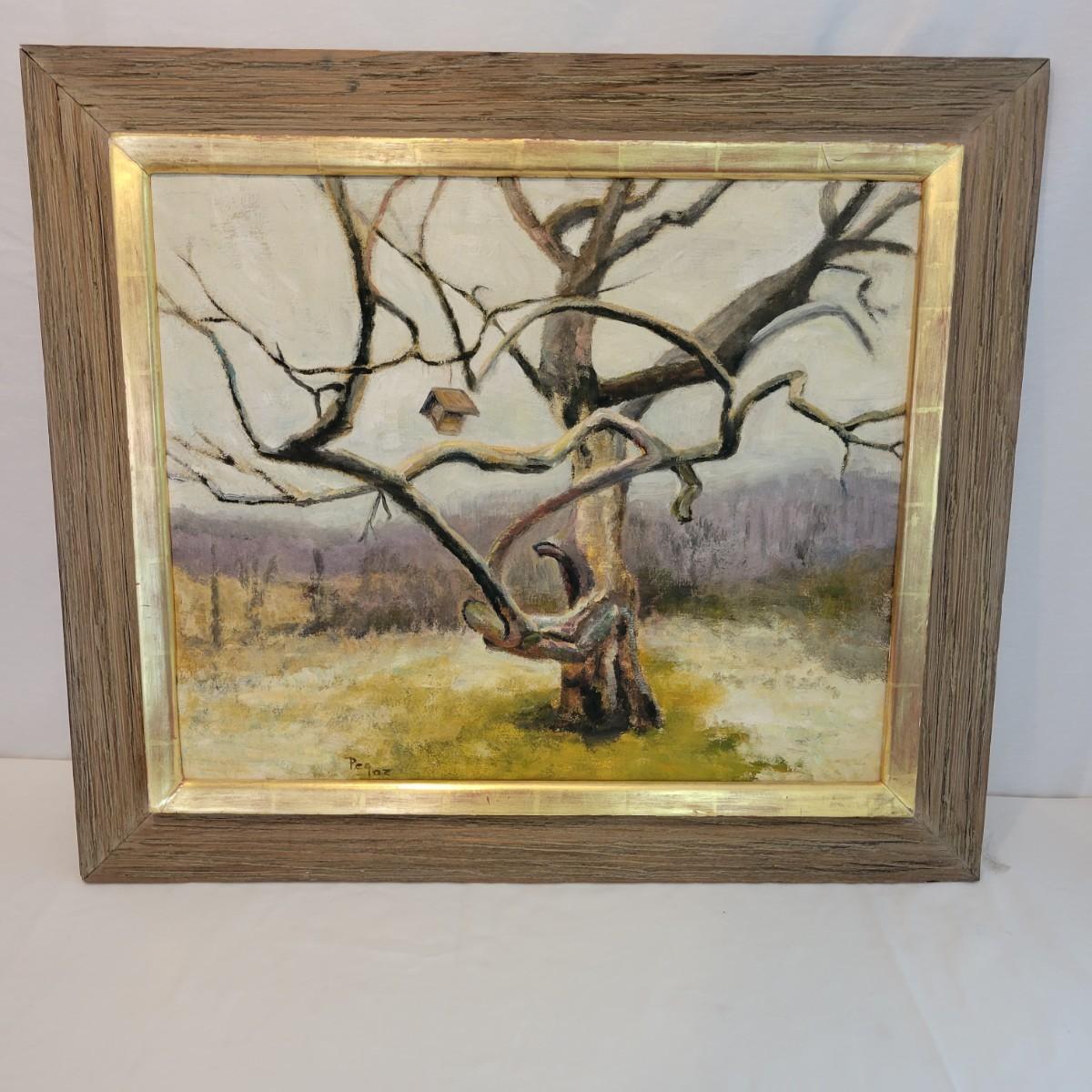 An original oil painting on canvas of a tree and bird house painted by Peg Ozzard. It is framed in a weathered wood frame with a gold lip and measures approximately 30.5" x 26.5"H. There is some minor cracking on the gold lip of the frame. Shipping available. Shipping art can be costly. We suggest contacting our preferred local shipping provider, Postage Express, with dimensions and getting an estimate before bidding: (828) 670-5501 or postageexpress@yahoo.com.