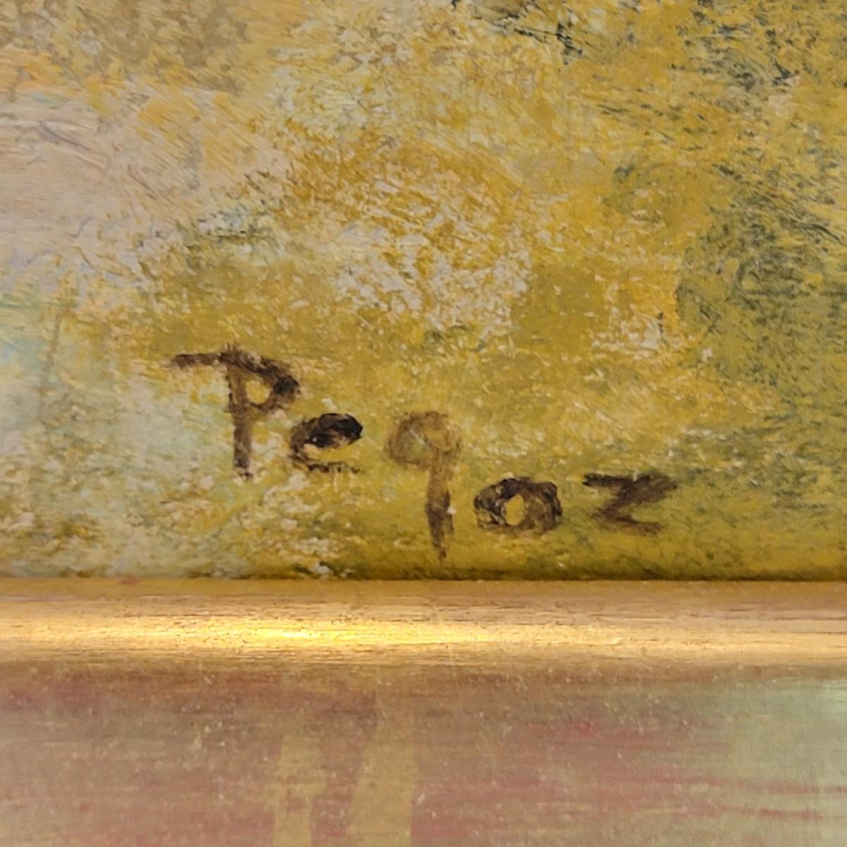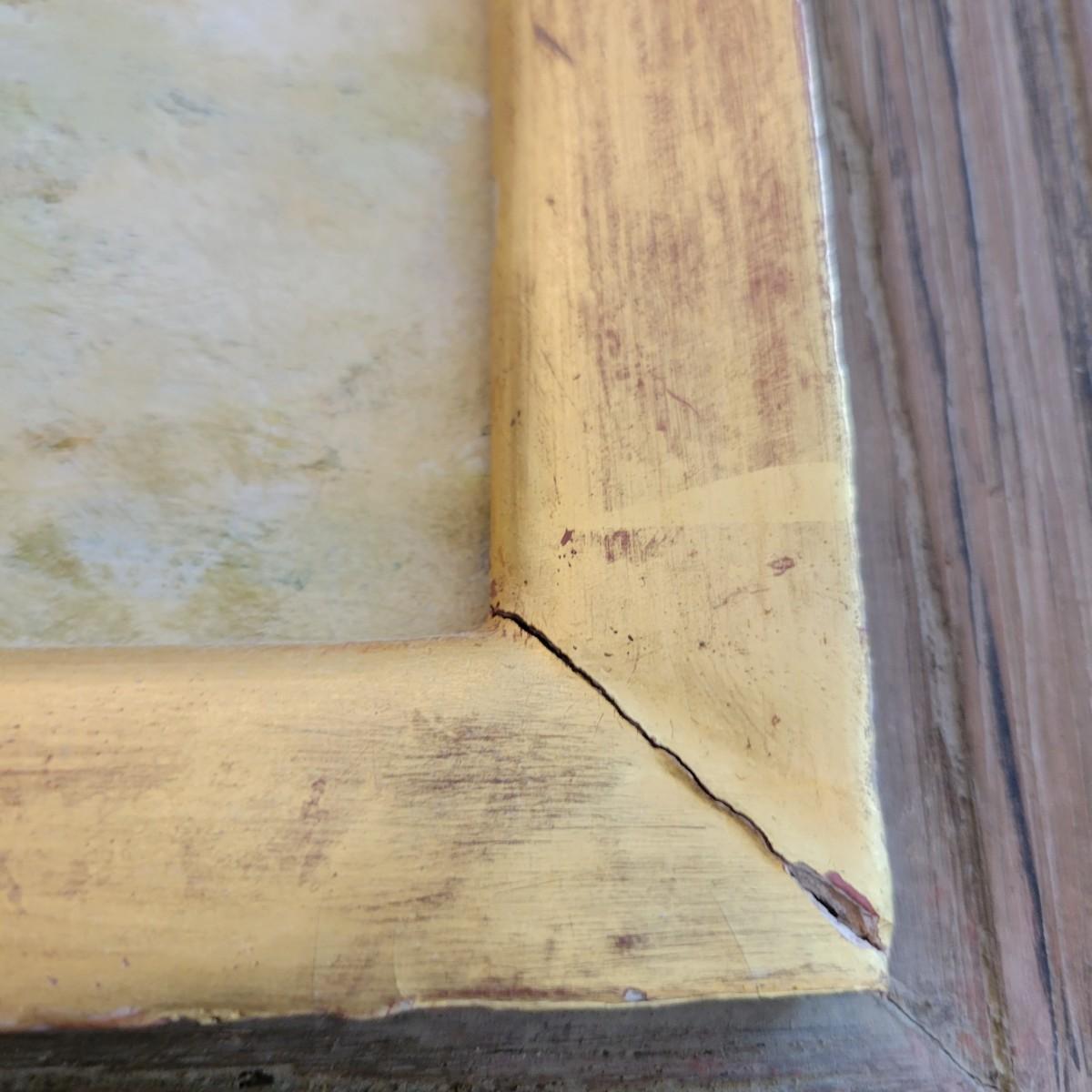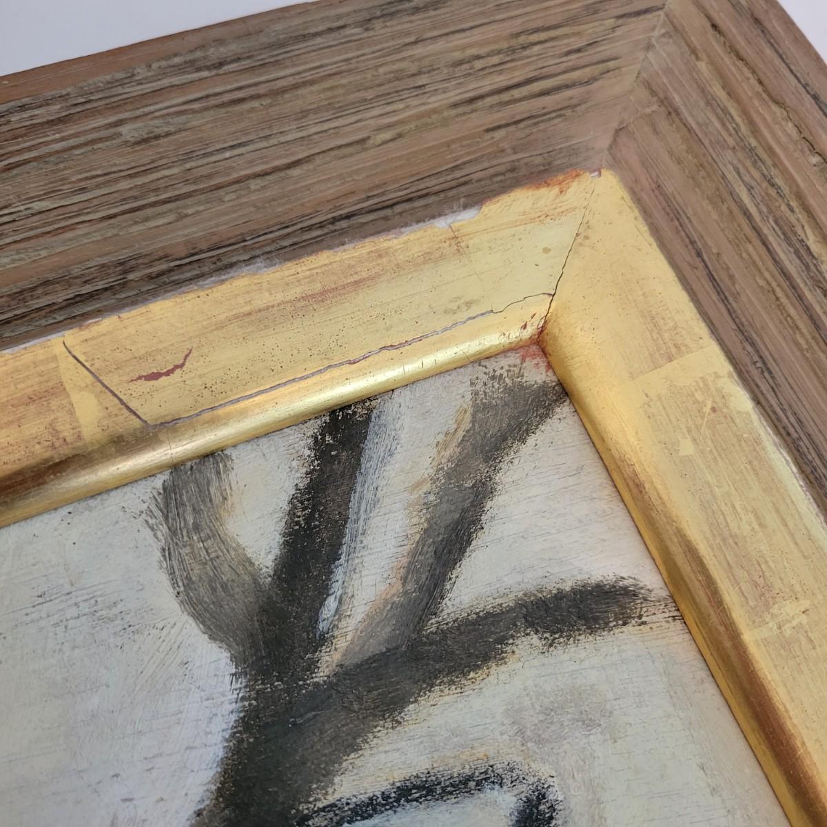 An original oil painting on canvas of a tree and bird house painted by Peg Ozzard. It is framed in a weathered wood frame with a gold lip and measures approximately 30.5" x 26.5"H. There is some minor cracking on the gold lip of the frame. Shipping available. Shipping art can be costly. We suggest contacting our preferred local shipping provider, Postage Express, with dimensions and getting an estimate before bidding: (828) 670-5501 or postageexpress@yahoo.com.