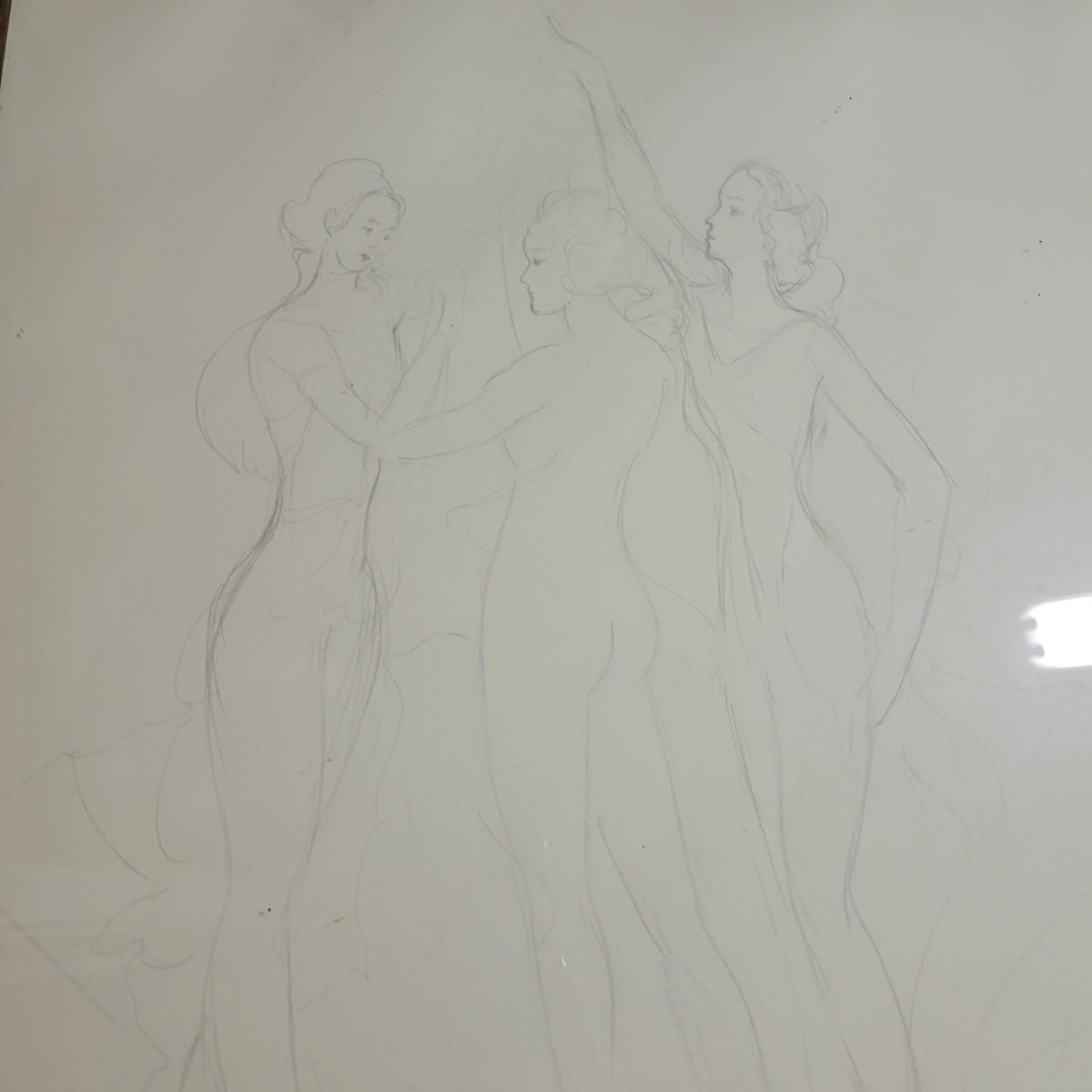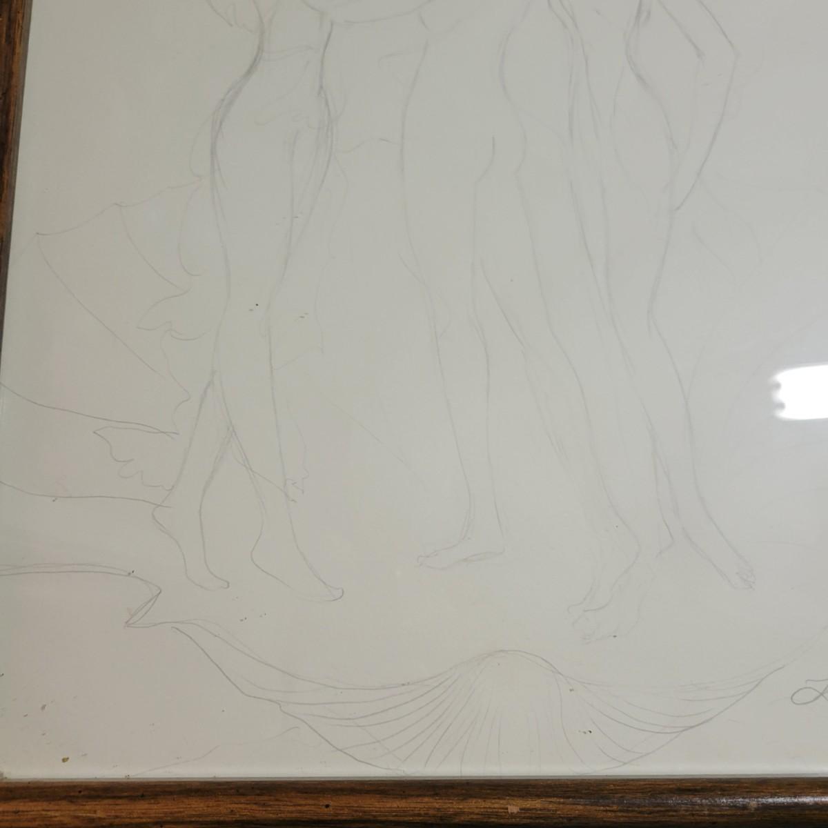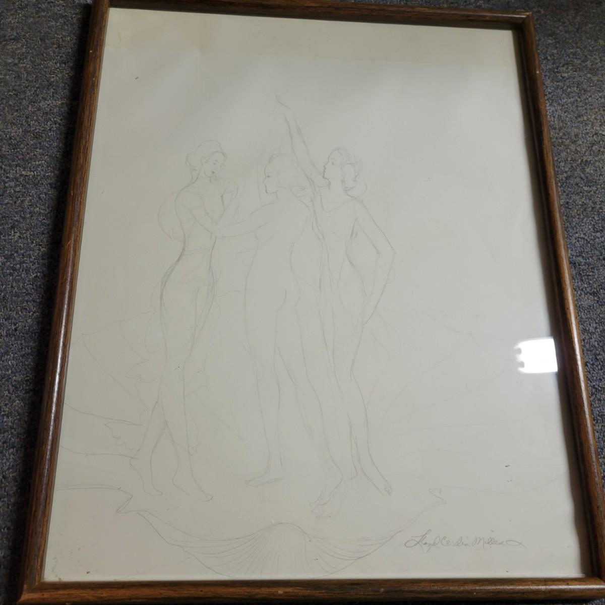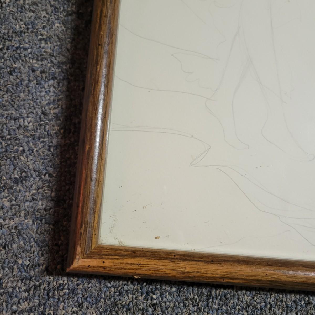 An original pencil sketch of three women standing in a shell that is in good condition, but frame has some minor scuffs. See attached pictures for more detail. Frame is made of wood with a dark stain and measures approximately 17" x 21" x 1" Shipping available. Shipping Art can be costly please call UPS store at 828-252-6930 for quote