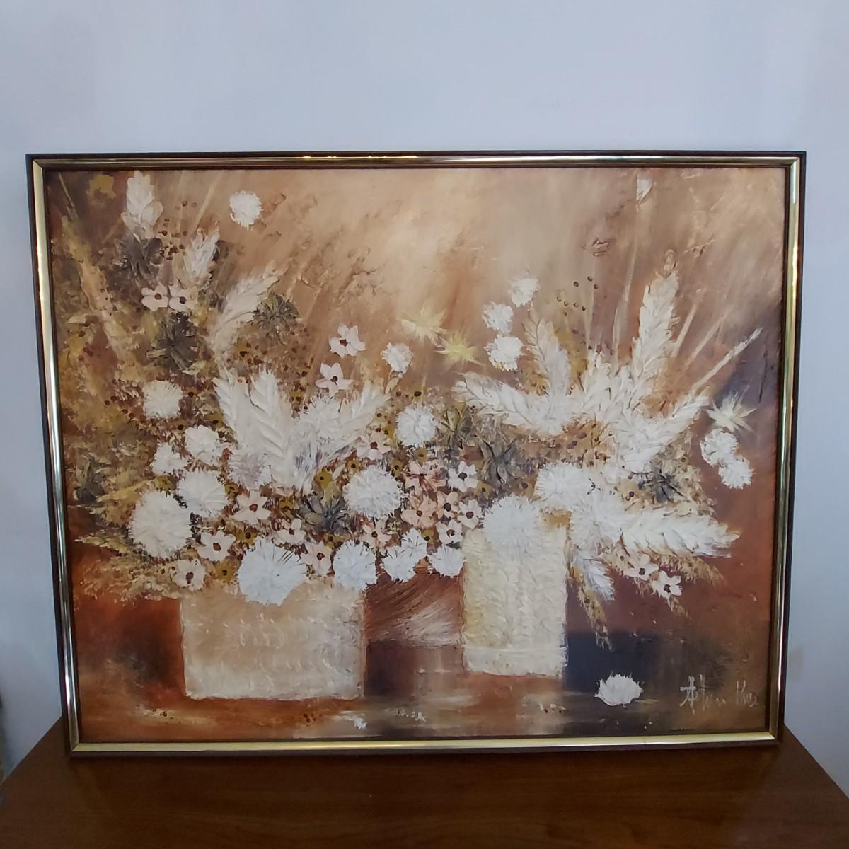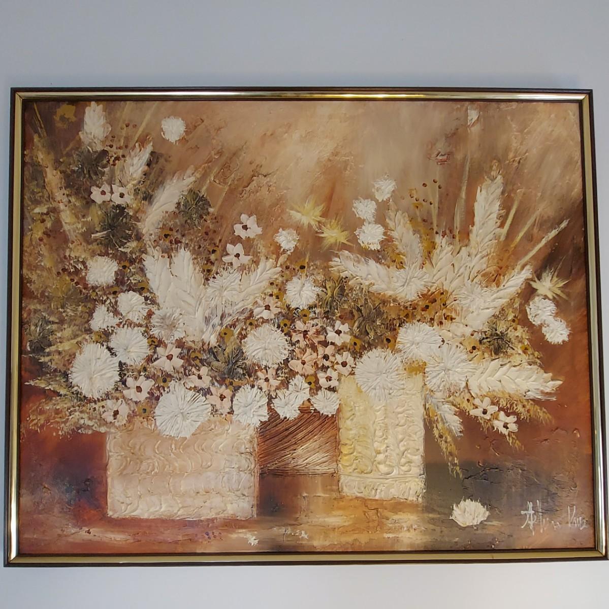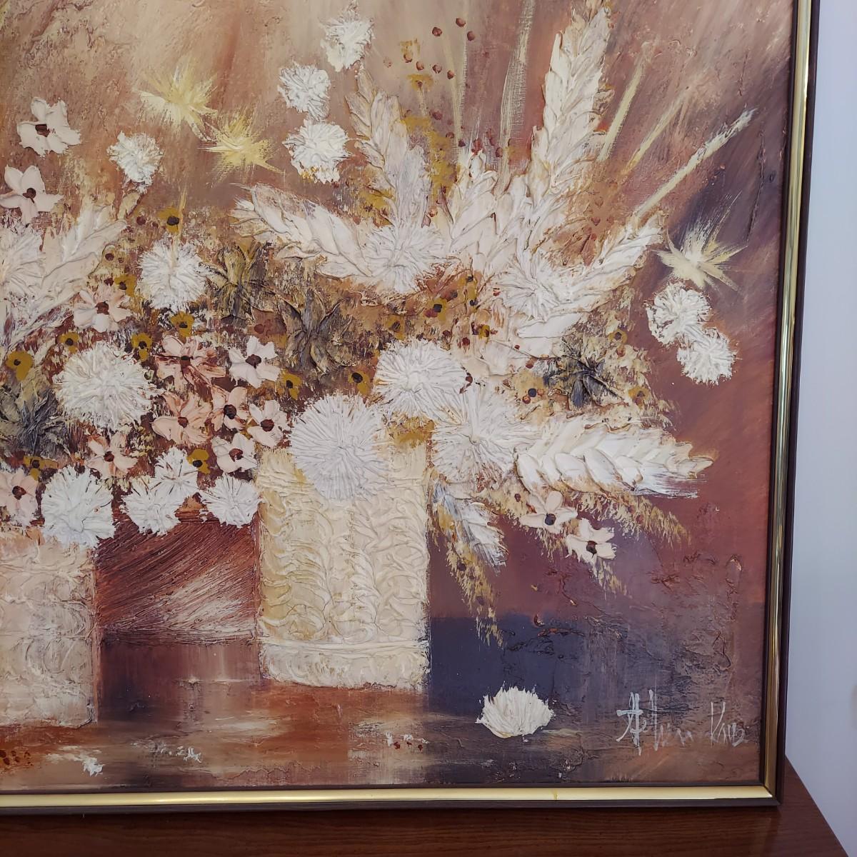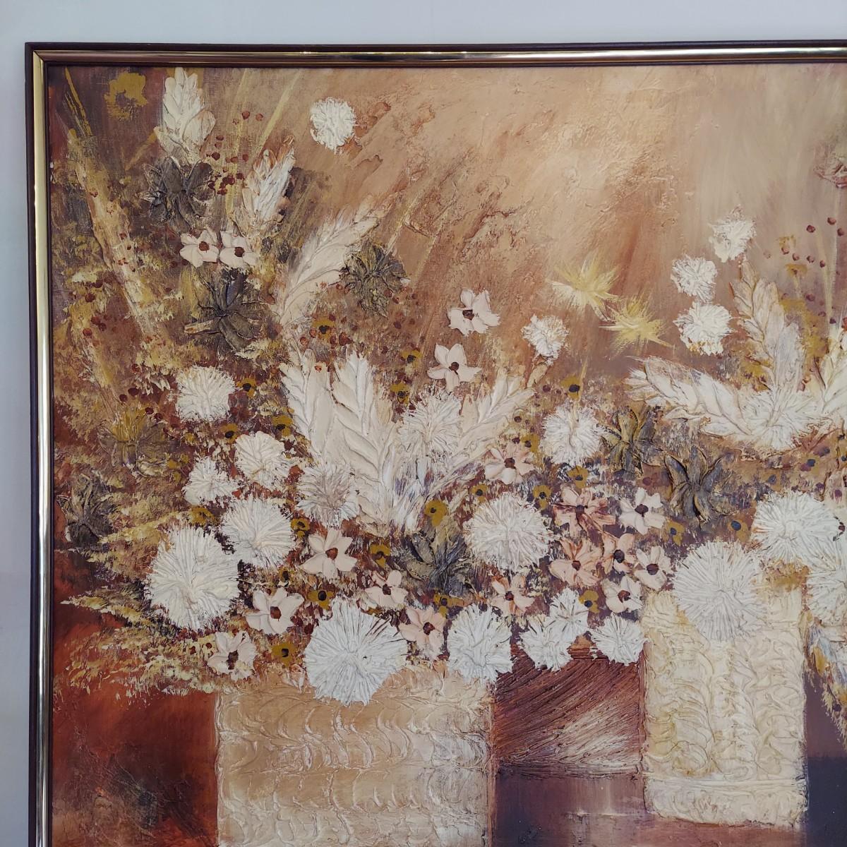 Framed Canvas painted floral still life. Textured style technique. The fame is pressed wood with gold plastic trim. This piece is signed but the signature was not identified. Measures approximately 51" x 2" x 51"H. Shipping available. Shipping can be costly. We suggest contacting our preferred local shipping provider, Postage Express, with dimensions and getting an estimate before bidding: (828) 670-5501or postageexpress@yahoo.com.
