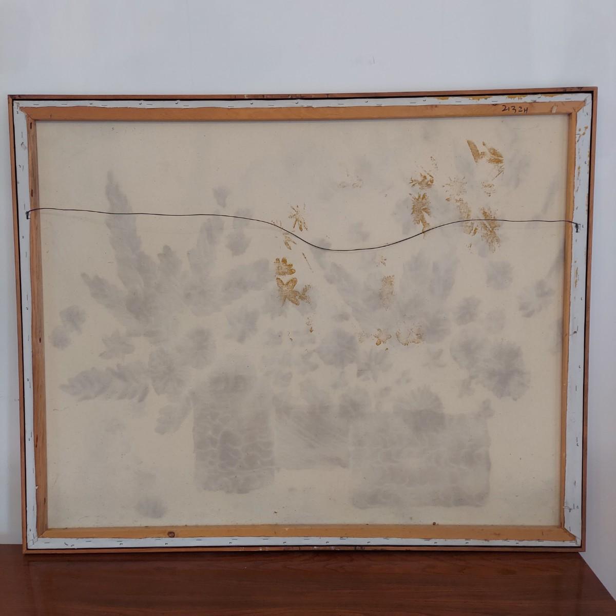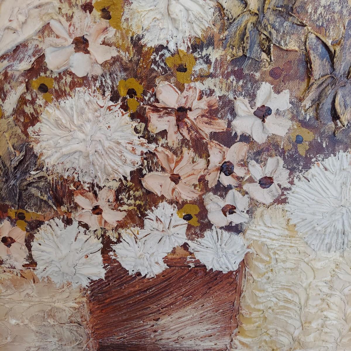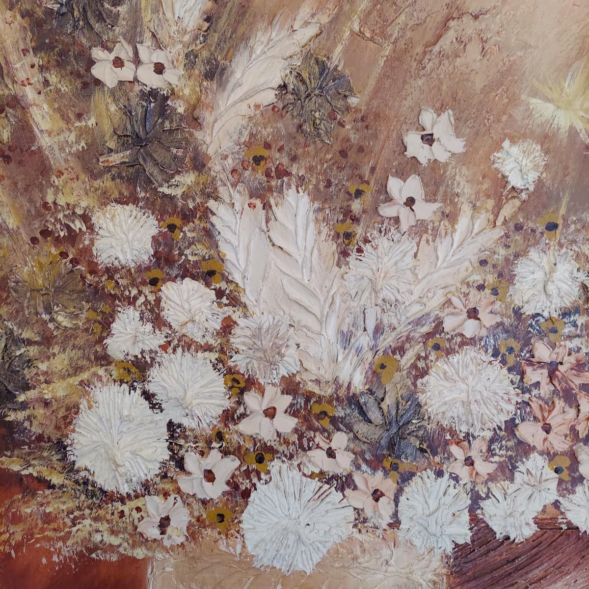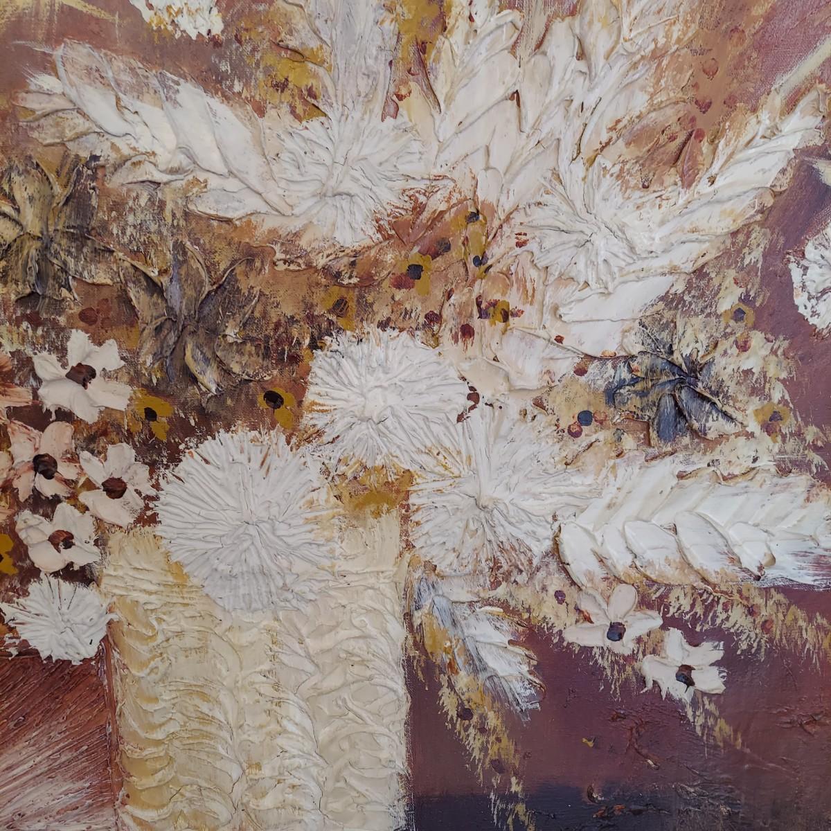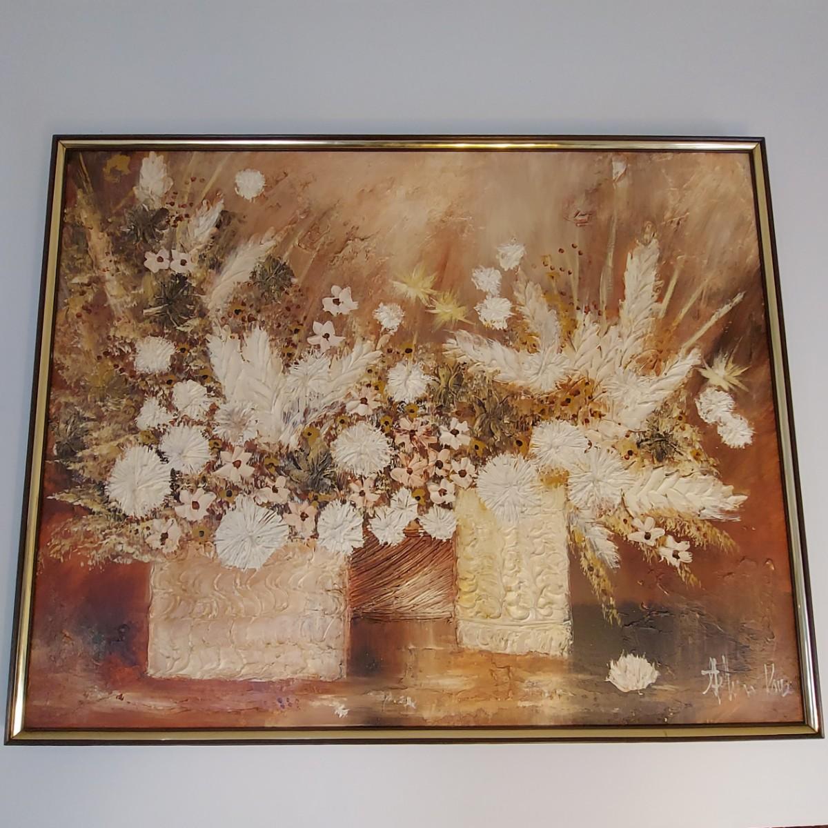 Framed Canvas painted floral still life. Textured style technique. The fame is pressed wood with gold plastic trim. This piece is signed but the signature was not identified. Measures approximately 51" x 2" x 51"H. Shipping available. Shipping can be costly. We suggest contacting our preferred local shipping provider, Postage Express, with dimensions and getting an estimate before bidding: (828) 670-5501or postageexpress@yahoo.com.