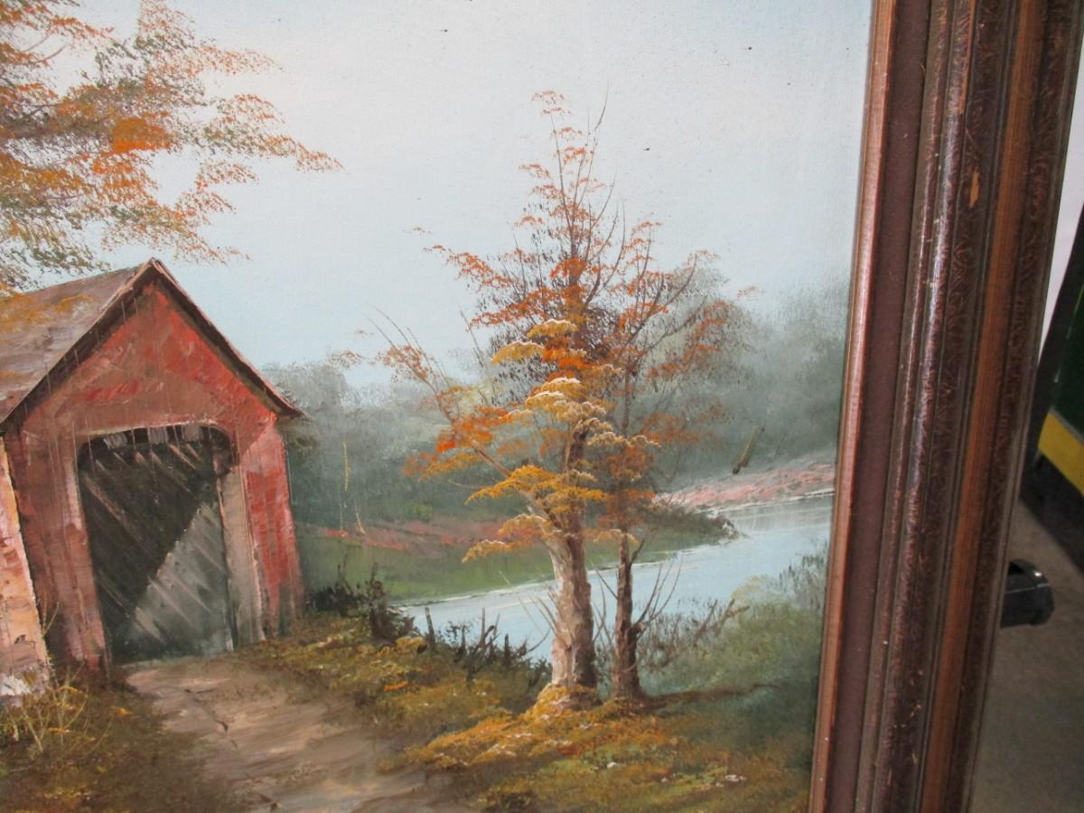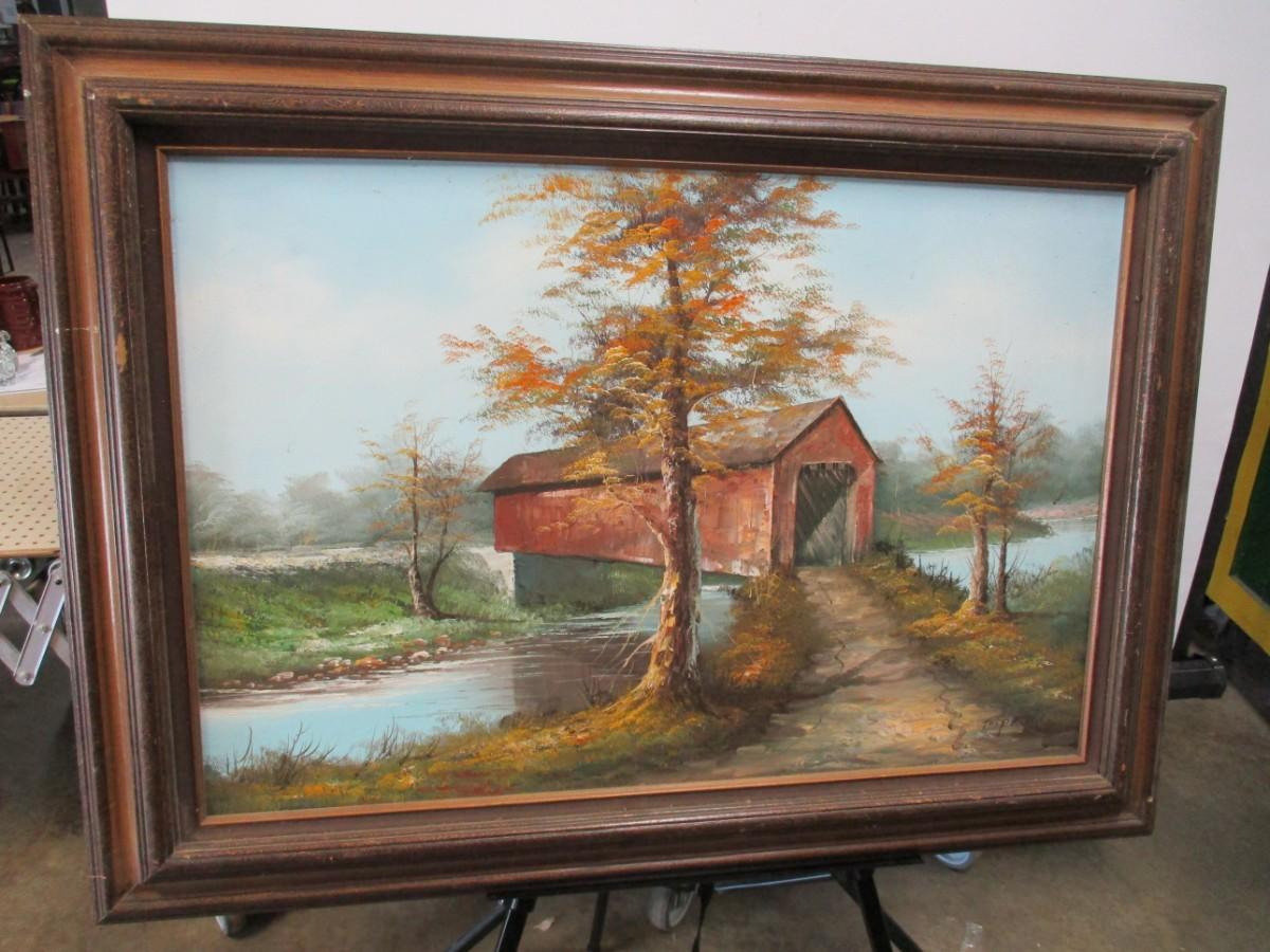 Framed Painted Covered Bridge On Canvas